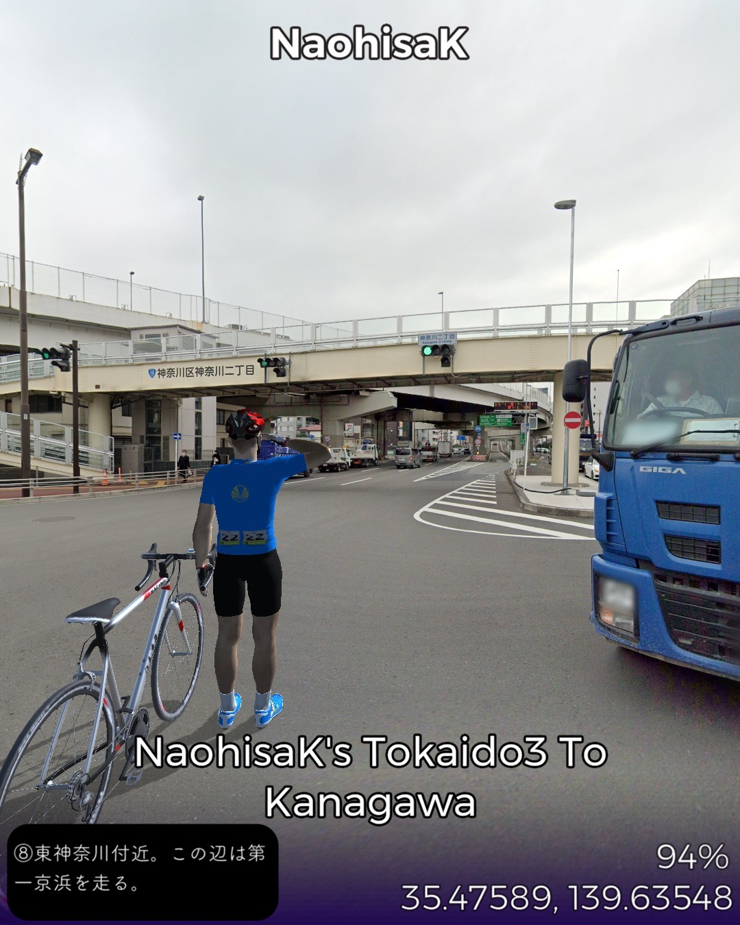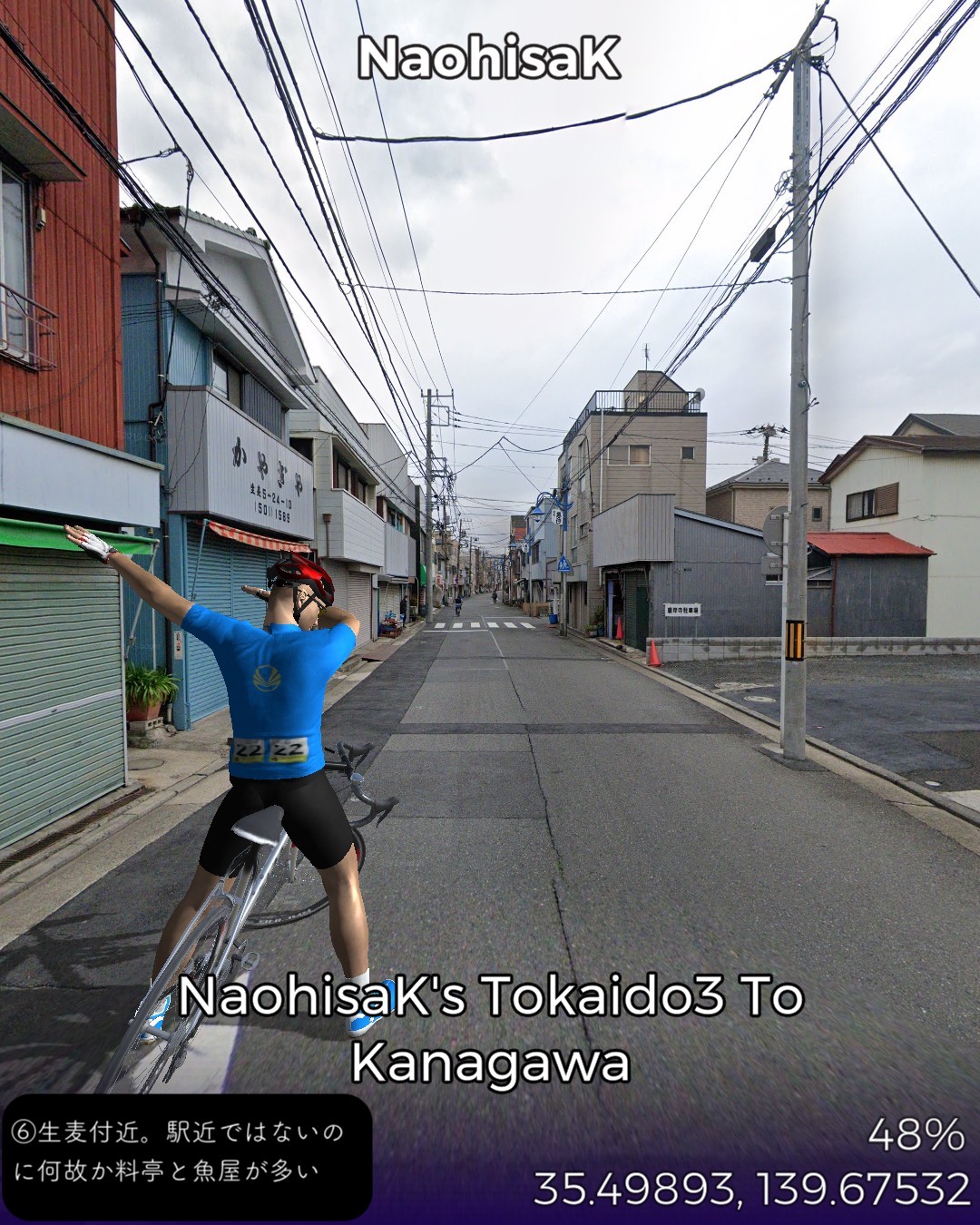 東海道バーチャルサイクリング。ドンドン行っちゃう。今日は川崎宿から神奈川宿(東神奈川駅と横浜駅の間あたり)まで。川崎の京急の踏切を渡った先の八丁畷という鶴見川まで続く真っ直ぐな道、鶴見駅を超えた後キリンビール工場までの生麦の辺りと旧道らしい気持ちの良い道が続く。今回はゴールしたのに気がつかず誘導されるままに「みなとみらい」の方まで行ってしまった。おかしいと気がついて止めたが、先のルートは設定していないのにどこまで誘導するつもりだったのか気になる。
