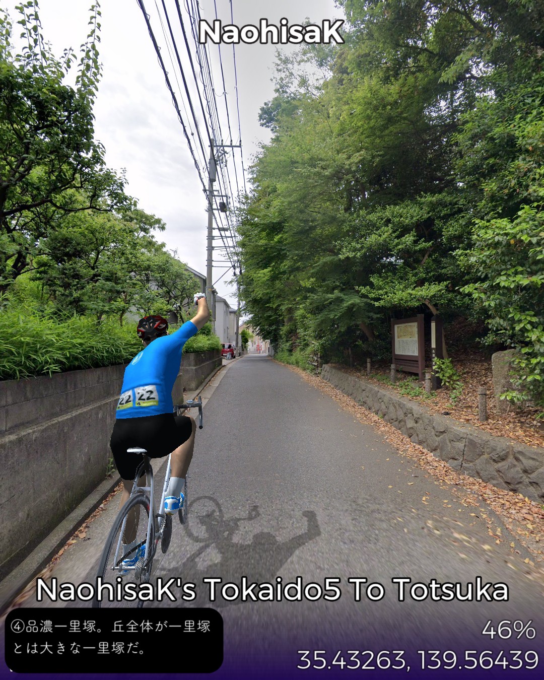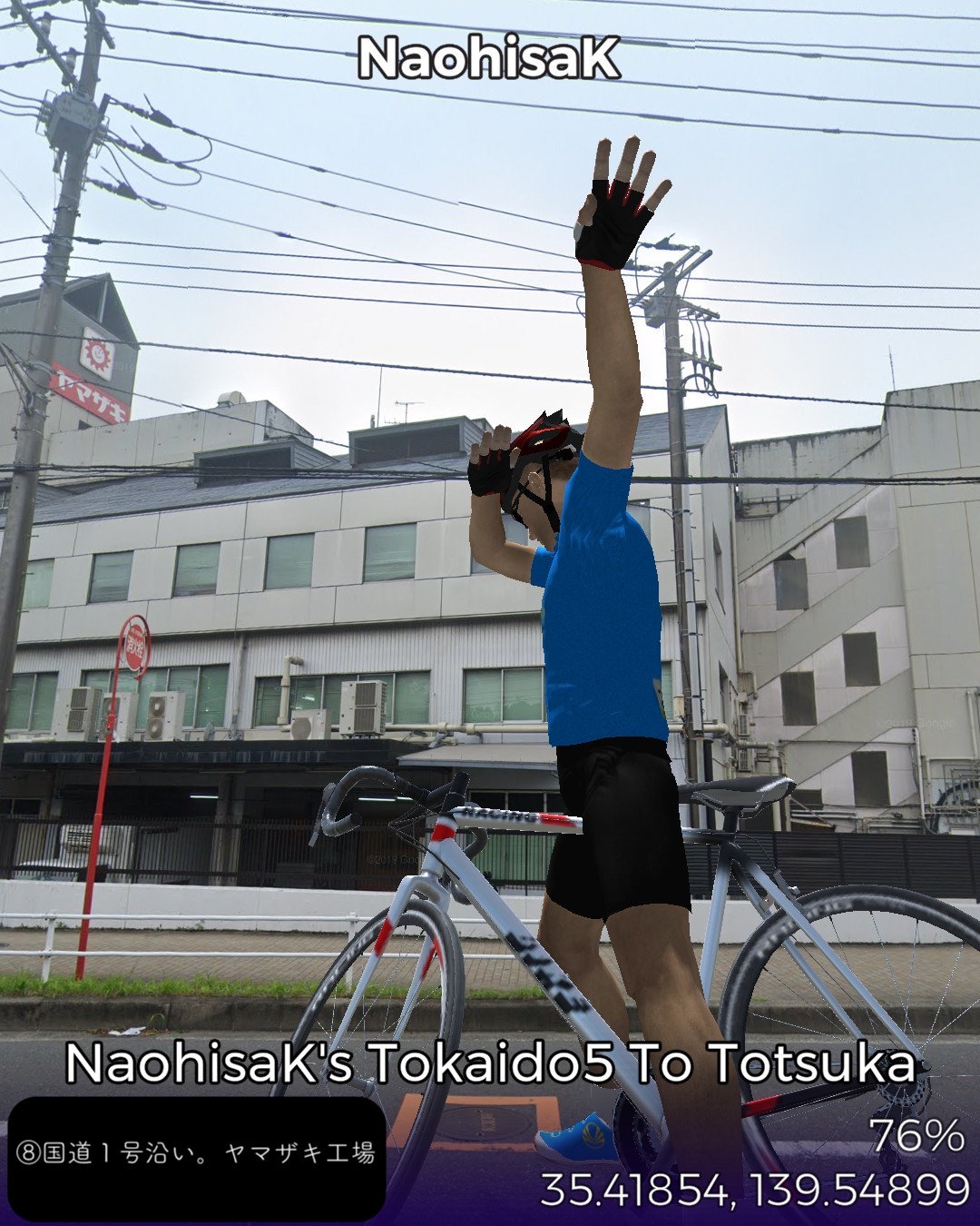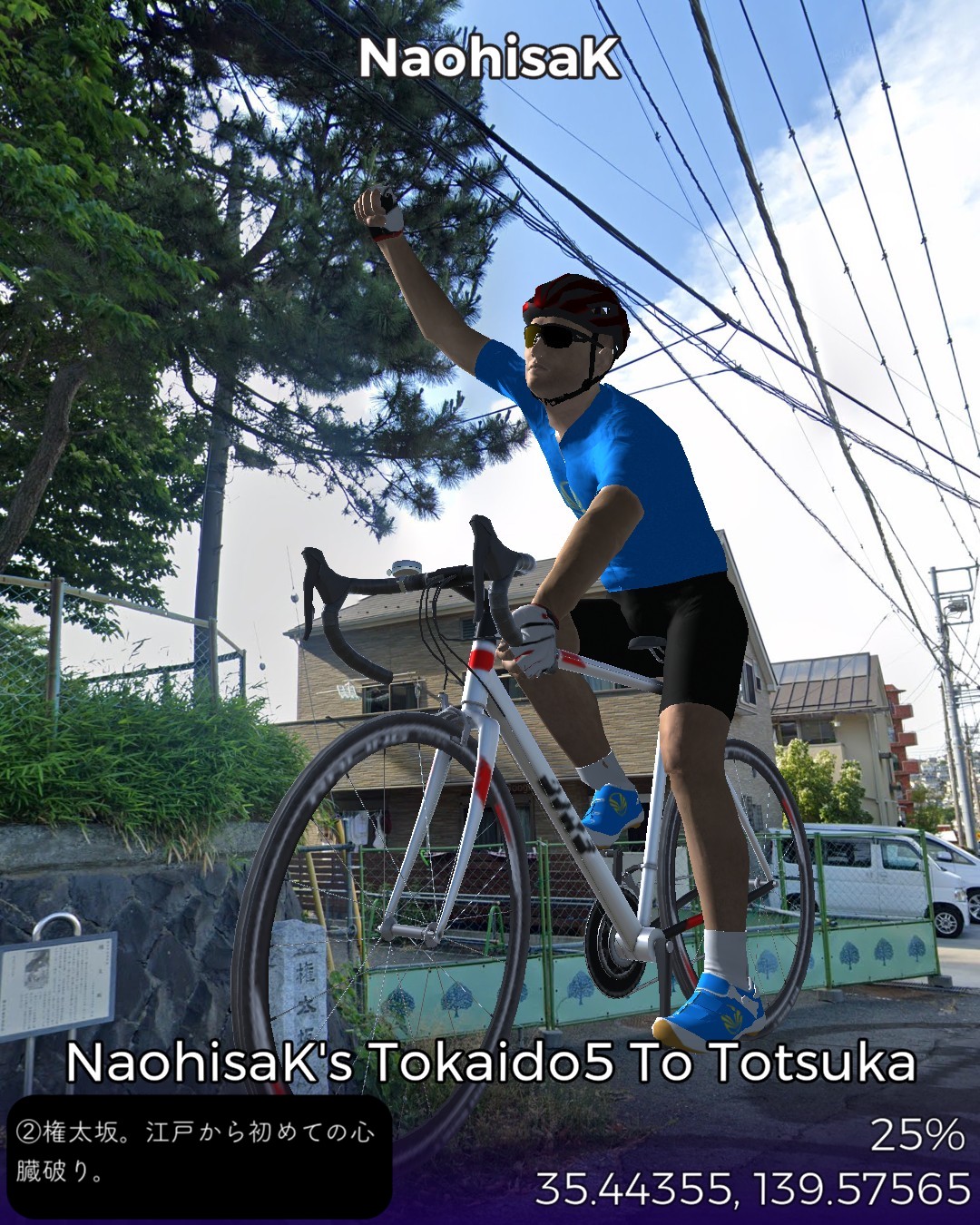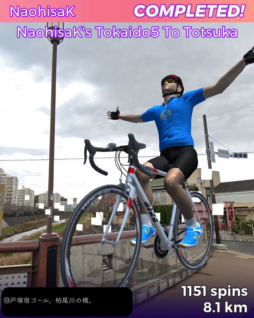 東海道バーチャルサイクリング。今日は保土ヶ谷宿から戸塚宿まで8.1kmのコース。まずは江戸から歩くと最初の心臓破りの坂となる権太坂を登る。リアリティを出す為にフィットネスバイクの負荷を上げて息を上げながら進んでみる。権太坂を登り切った先は、東戸塚駅から通勤する人達のベッドタウンの合間をすり抜けてゆく。とても天下の東海道とは思えないような住宅街の私道のような小道になっているところもある。丘を下ると打って変わって大きな工場が立ち並び、トラックがひっきりなしに走る国道1号線沿いを走ると間も無く戸塚宿に至る。