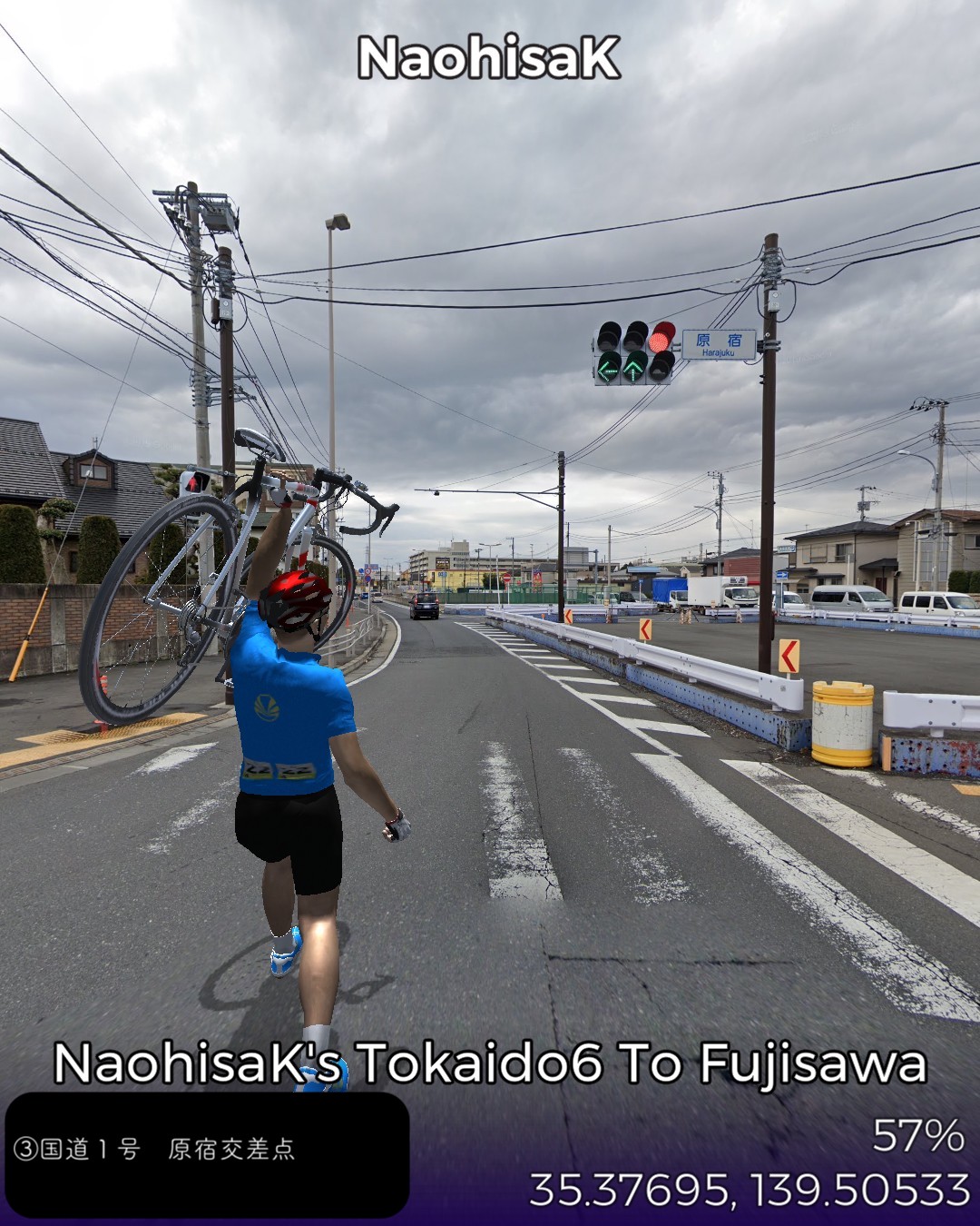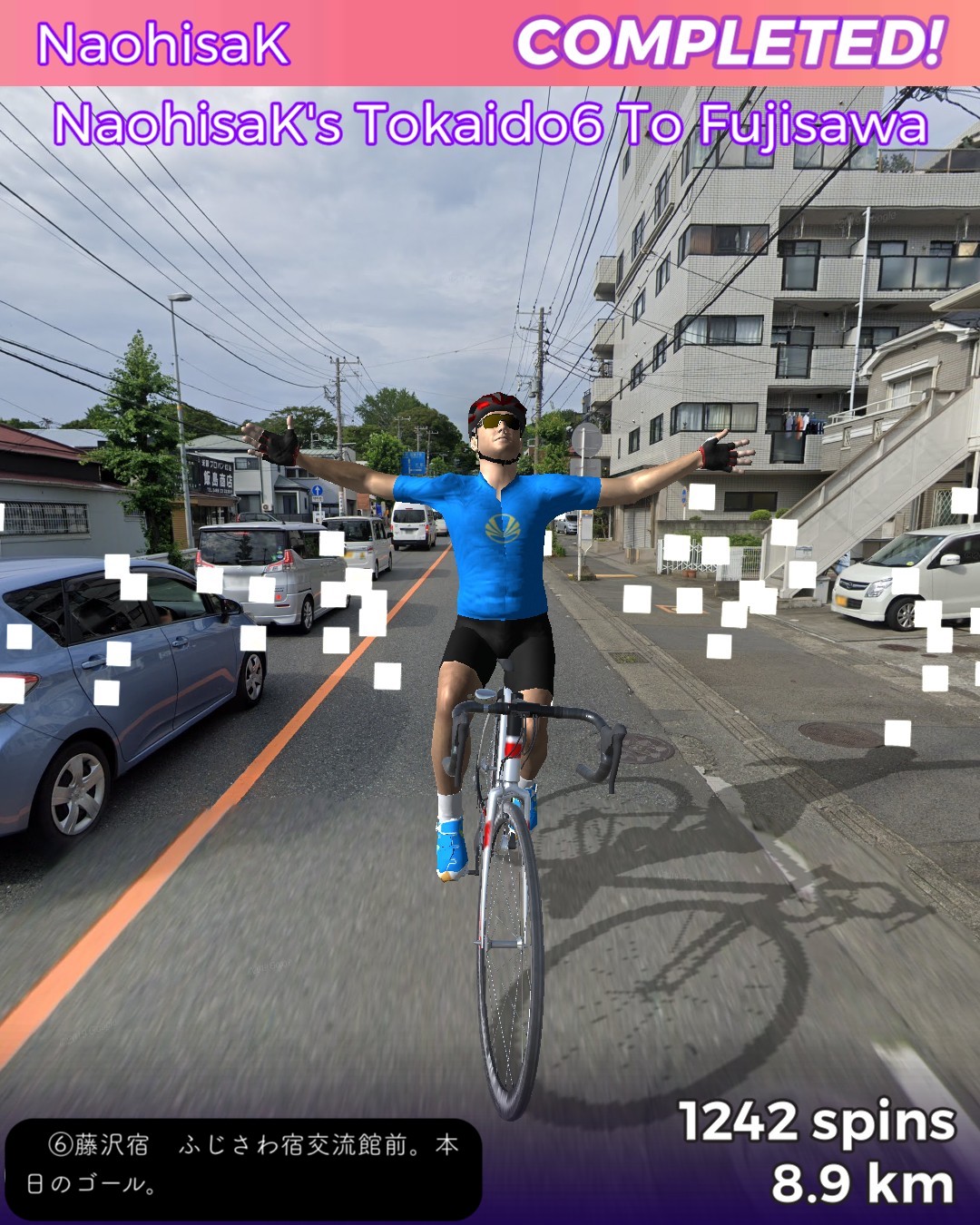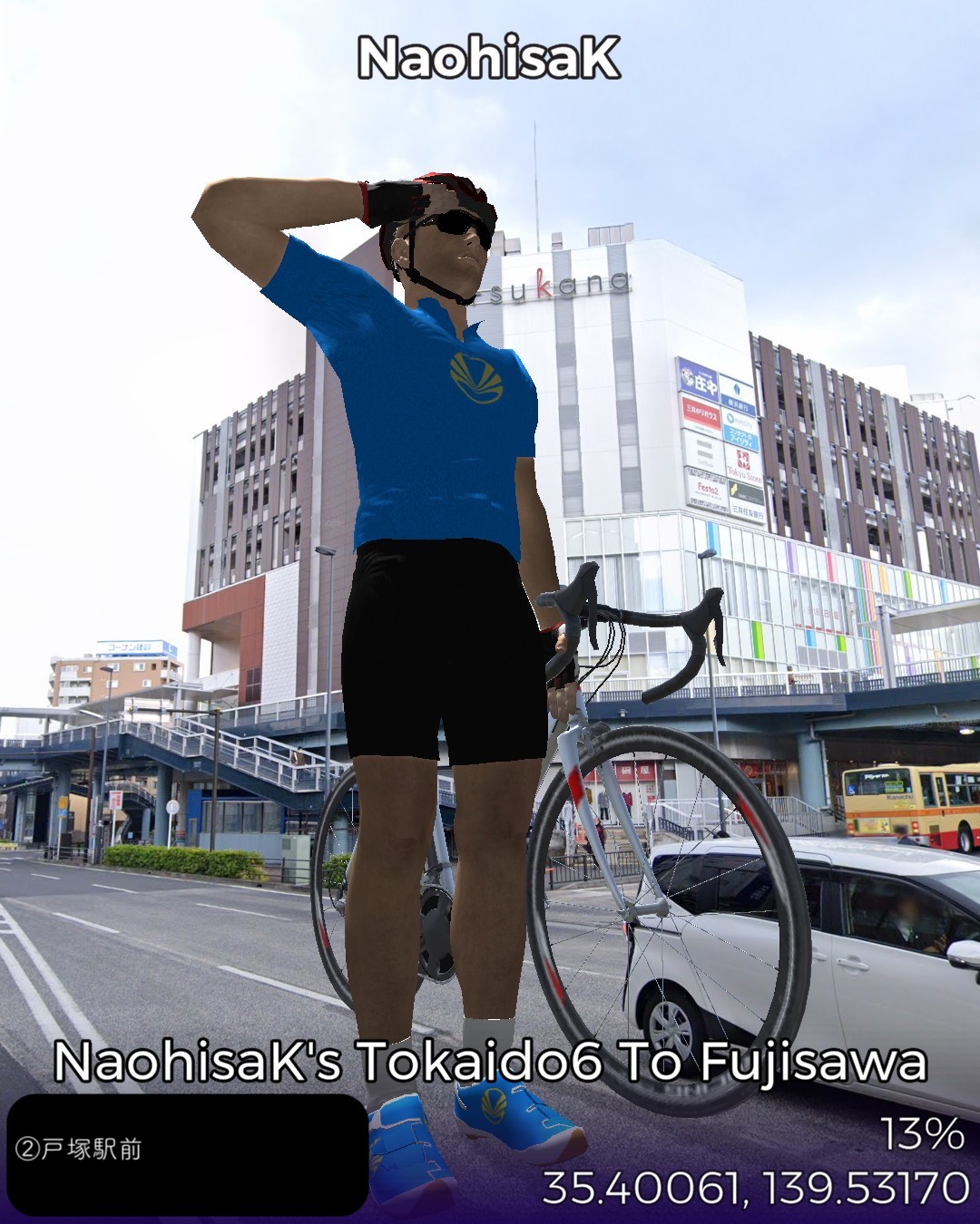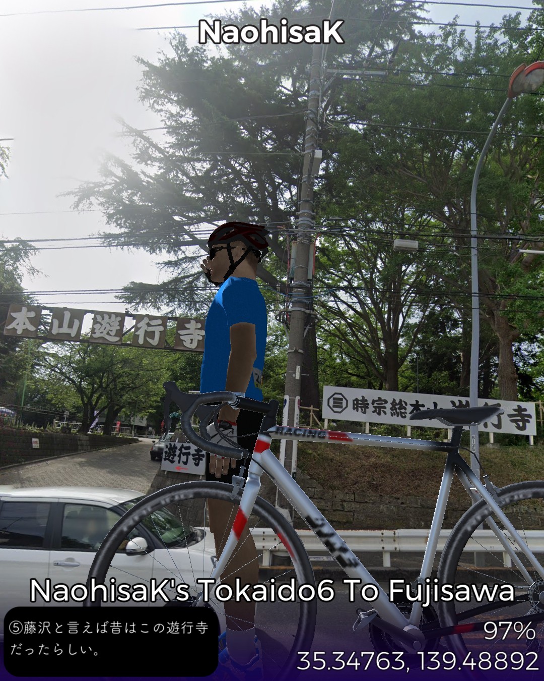 東海道バーチャルサイクリング。戸塚宿から藤沢宿まで8.9km。国道1号線がメインで完全に自動車道路なので面白みはない。走って気がついたが、ルートが本来の東海道から外れていた。戸塚駅で真っ直ぐ行くべきところ右に曲がってバイパスに入ってしまった。途中で本来の街道に合流するのでまあヨシとしよう。
