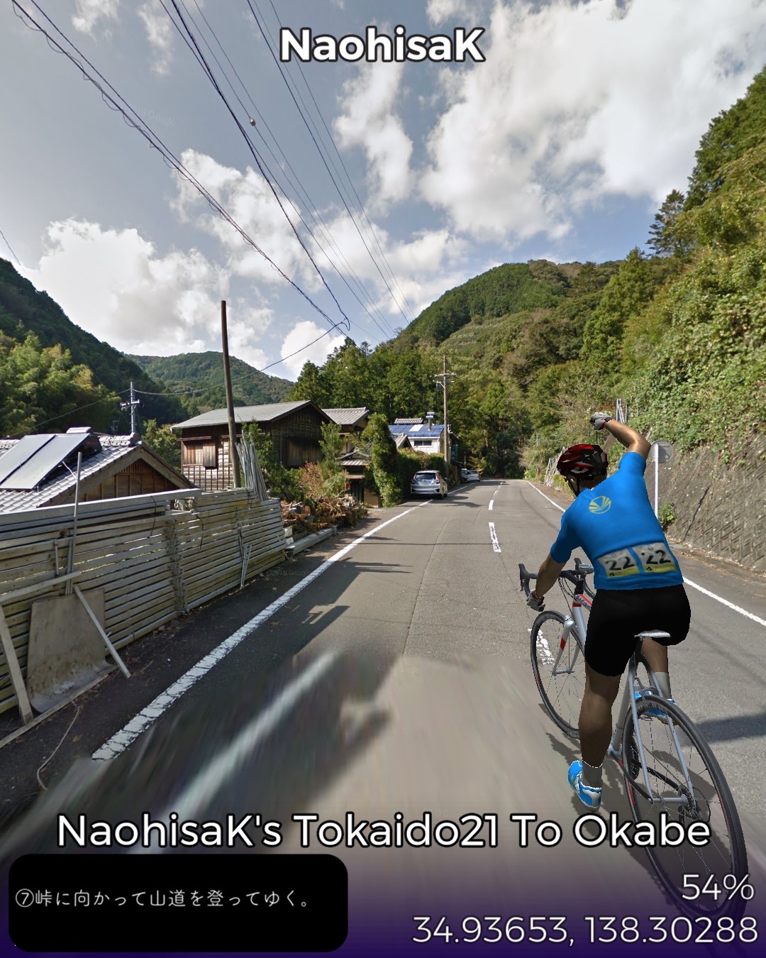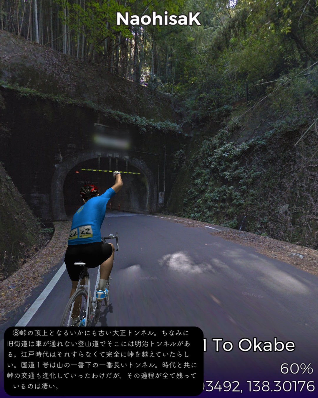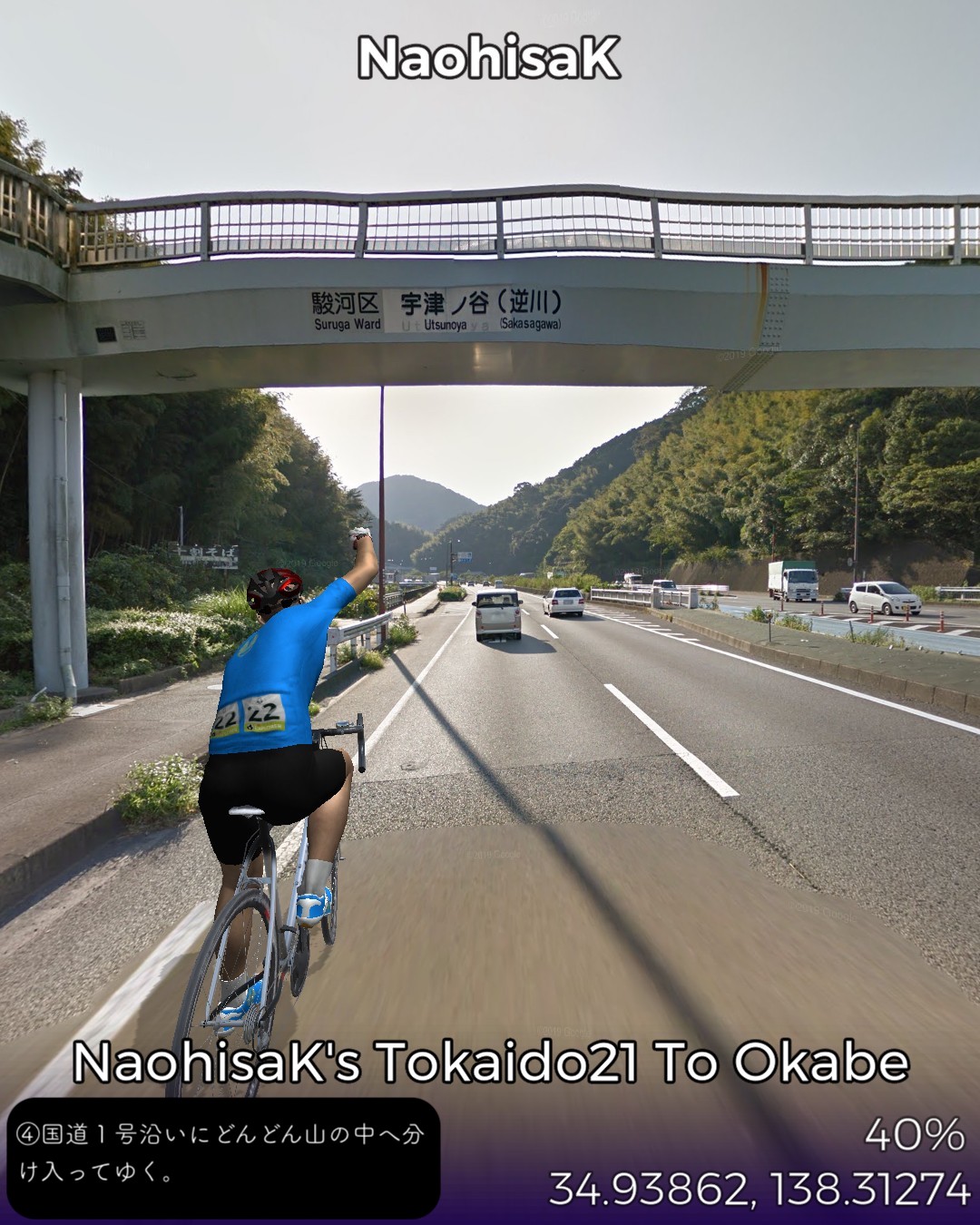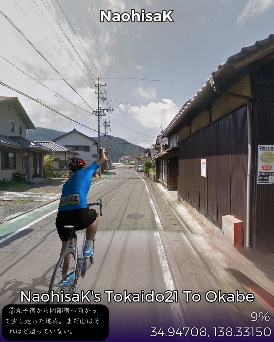 東海道バーチャルサイクリング22日目。丸子宿から岡部宿まで8kmの行程。もう東京人にはどこだかさっぱり分からないだろう。山の向こうは焼津あたりになる。今日はさらに山に向かって進み峠を越えるルート。この山の一番奥の街道ぞいに古い家並が保存された宇津ノ谷集落があってここが東海道でも最も味のある山村なのだが、残念ながら今回はここを通れない。車が入れずストリートビューが撮られていないので、この集落を遠巻きに峠を越えるルートとなった。大正トンネルという古いトンネルを抜けると峠を下る道となり岡部宿へと至る。