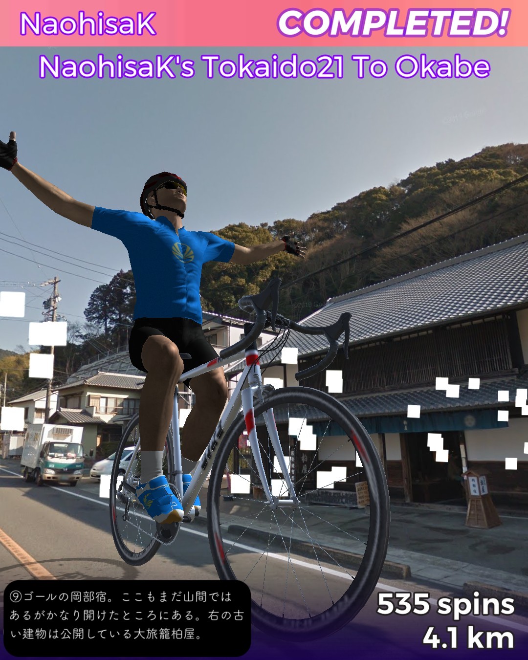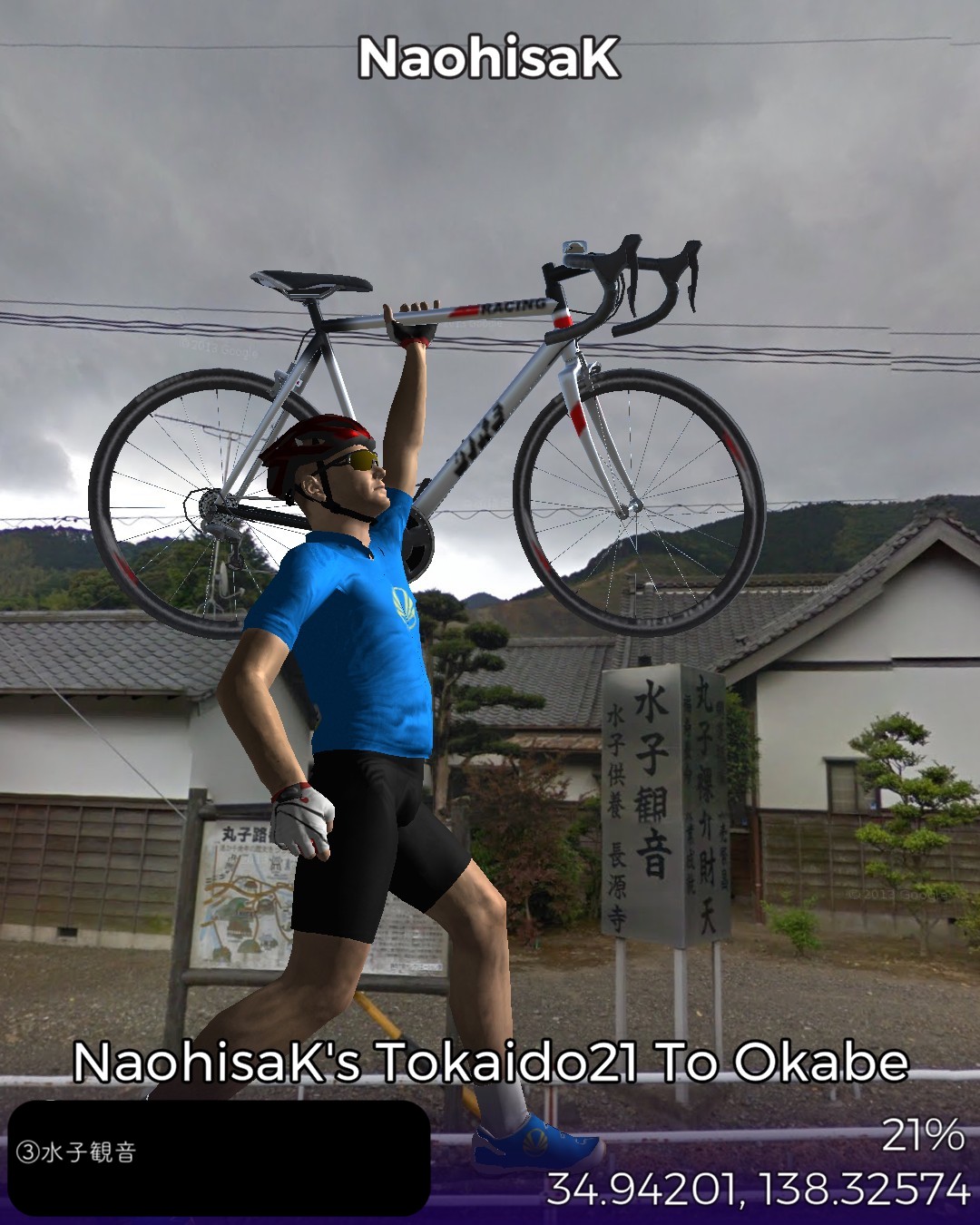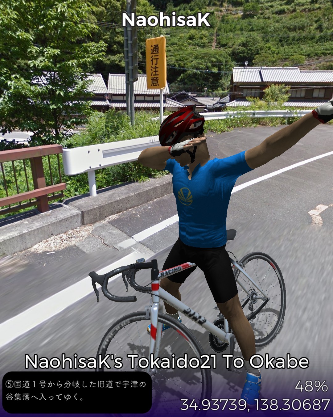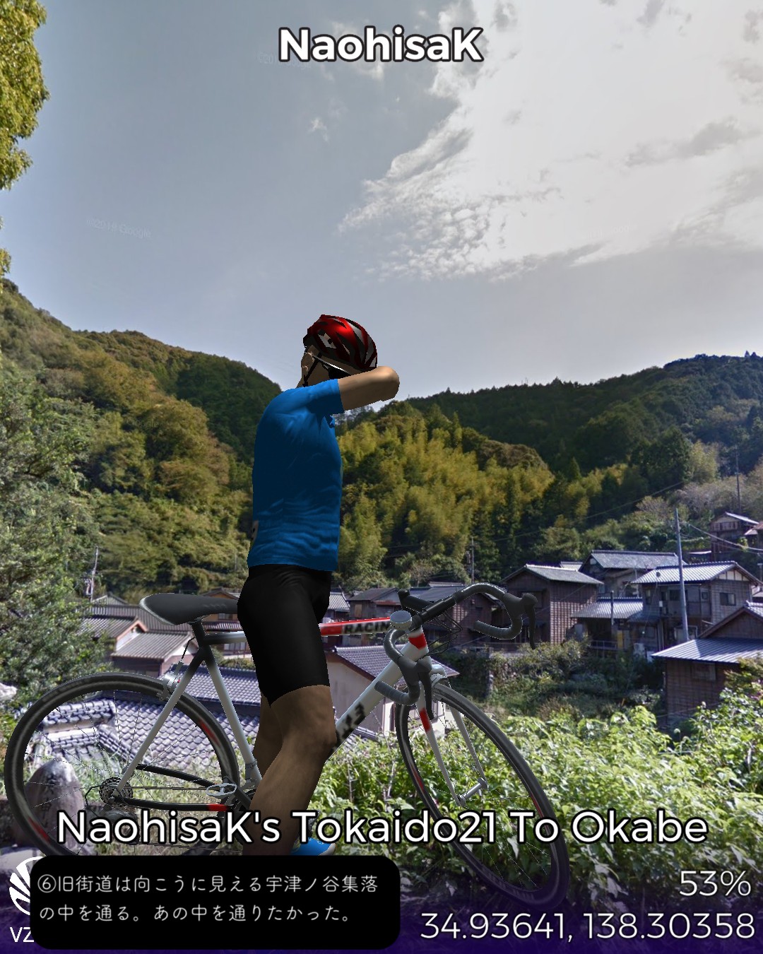 東海道バーチャルサイクリング22日目。丸子宿から岡部宿まで8kmの行程。もう東京人にはどこだかさっぱり分からないだろう。山の向こうは焼津あたりになる。今日はさらに山に向かって進み峠を越えるルート。この山の一番奥の街道ぞいに古い家並が保存された宇津ノ谷集落があってここが東海道でも最も味のある山村なのだが、残念ながら今回はここを通れない。車が入れずストリートビューが撮られていないので、この集落を遠巻きに峠を越えるルートとなった。大正トンネルという古いトンネルを抜けると峠を下る道となり岡部宿へと至る。