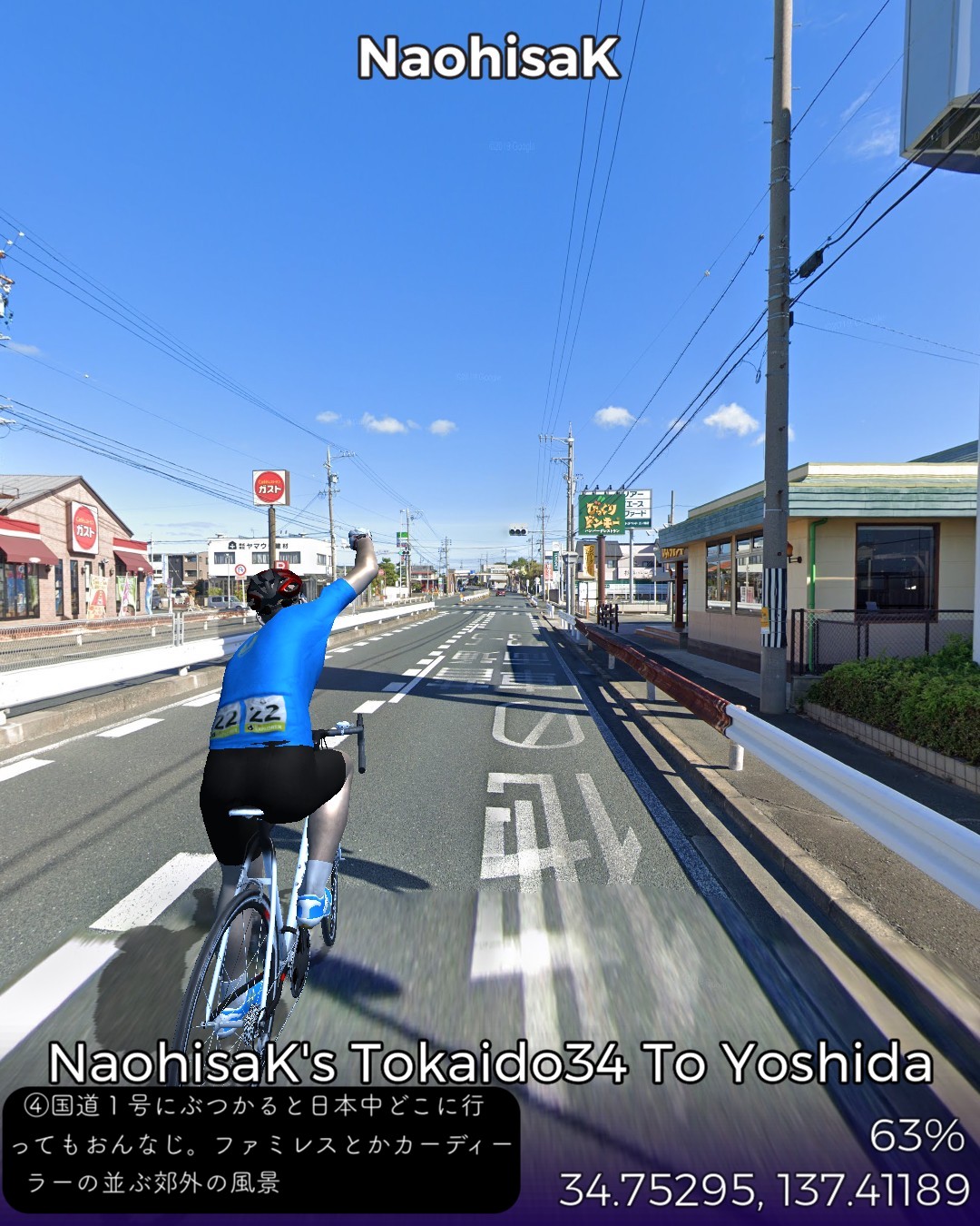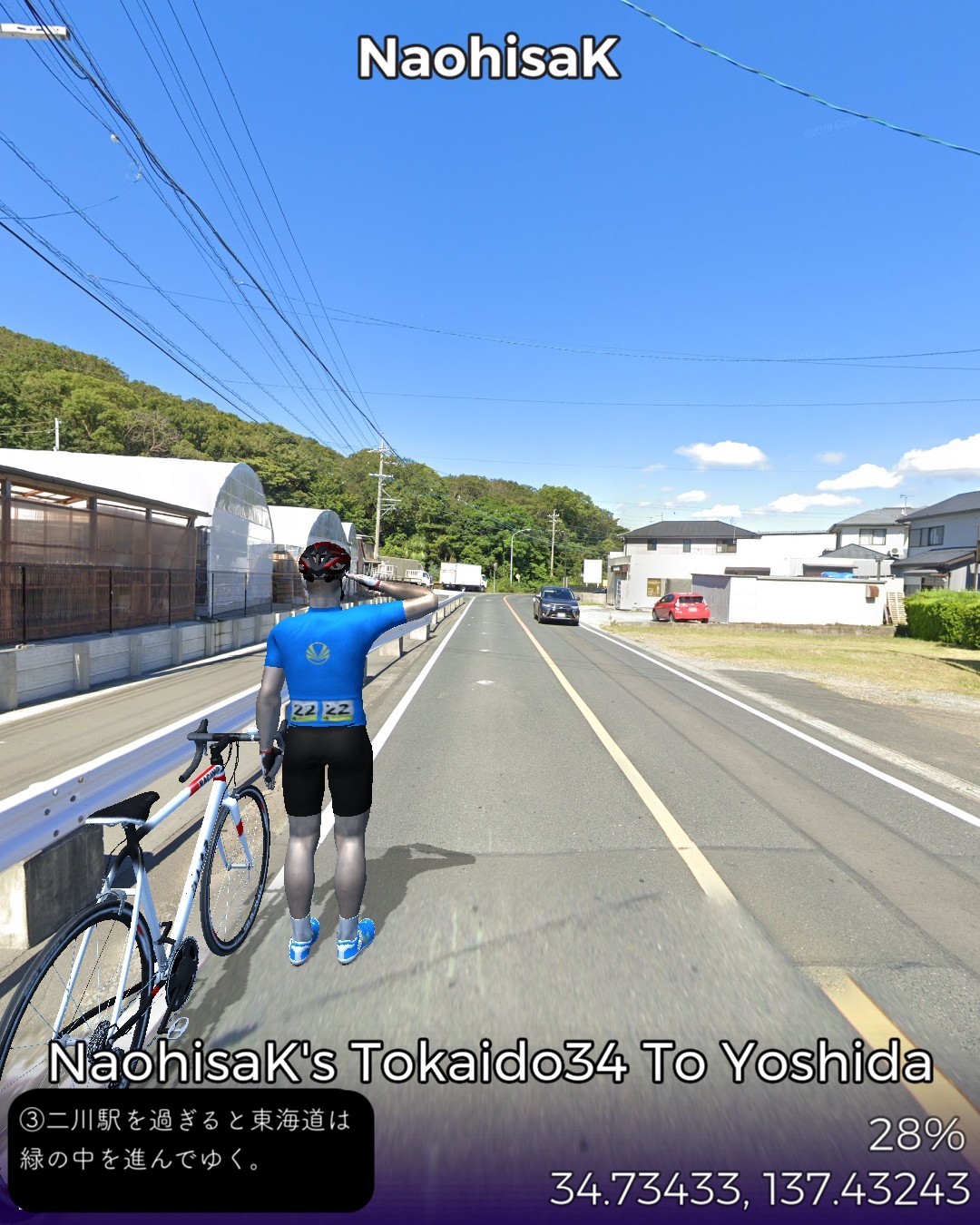 東海道バーチャルサイクリング35日目。二川宿から現在の豊橋市街に当たる吉田宿まで8km。本日のルート中ほどまでは古い商家が立ち並ぶ二川宿からの緑の多い旧道の田舎道だが、国道1号に合流した後は都市部の郊外から市街地に入ってくる日本中どこにでもある風景の変化。母方の田舎が豊橋から飯田線に乗って山に入りかけた戦国時代の合戦地で有名な長篠にあり豊橋も親戚がいるので昔から馴染みのある土地柄のはずだが、こうして道路伝いにアプローチするとまるで初めて訪れる町に思えるから不思議だ。街道が駅に近いところを通らず全体に場末な道筋だけを通るせいかもしれない。かつての吉田宿は影も形もないが、本陣のあったその中心部もまた豊橋市街としは繁華街の外れの場末に位置する。