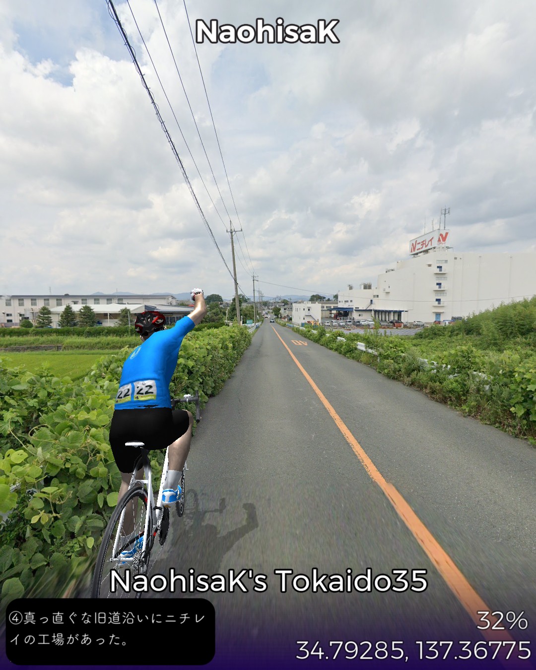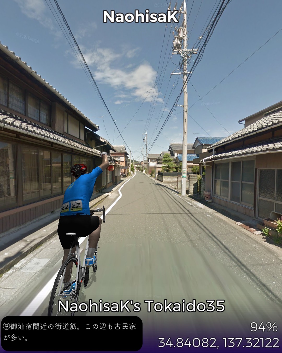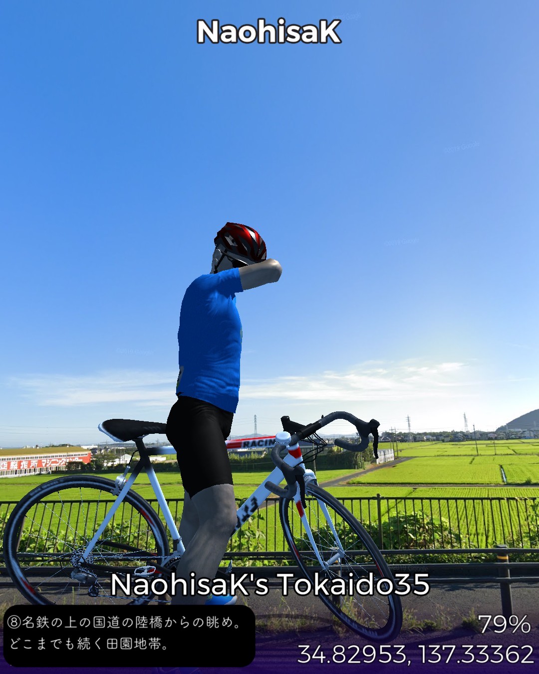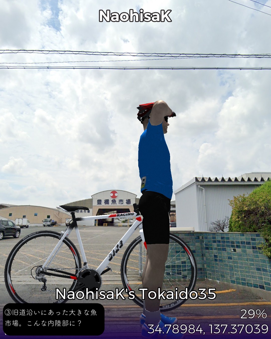 東海道バーチャルサイクリング36日目。豊橋に当たる吉田宿から御油宿まで12km。豊川に架かるこの町の名前の由来となった豊橋を渡るとずっと一直線の狭い道を往く。宿場の間だが古民家が続く旧道らしいに道筋で気分がいい。国道1号に合流して名鉄の陸橋から眺めると周りはどこまでも続く田園地帯。ゴールの御油宿は宿場町の風情は残していないが緑の多い田舎町。同じような田舎道でも静岡県とは何か雰囲気が違うな。中京文化圏に入ってきたということかな。