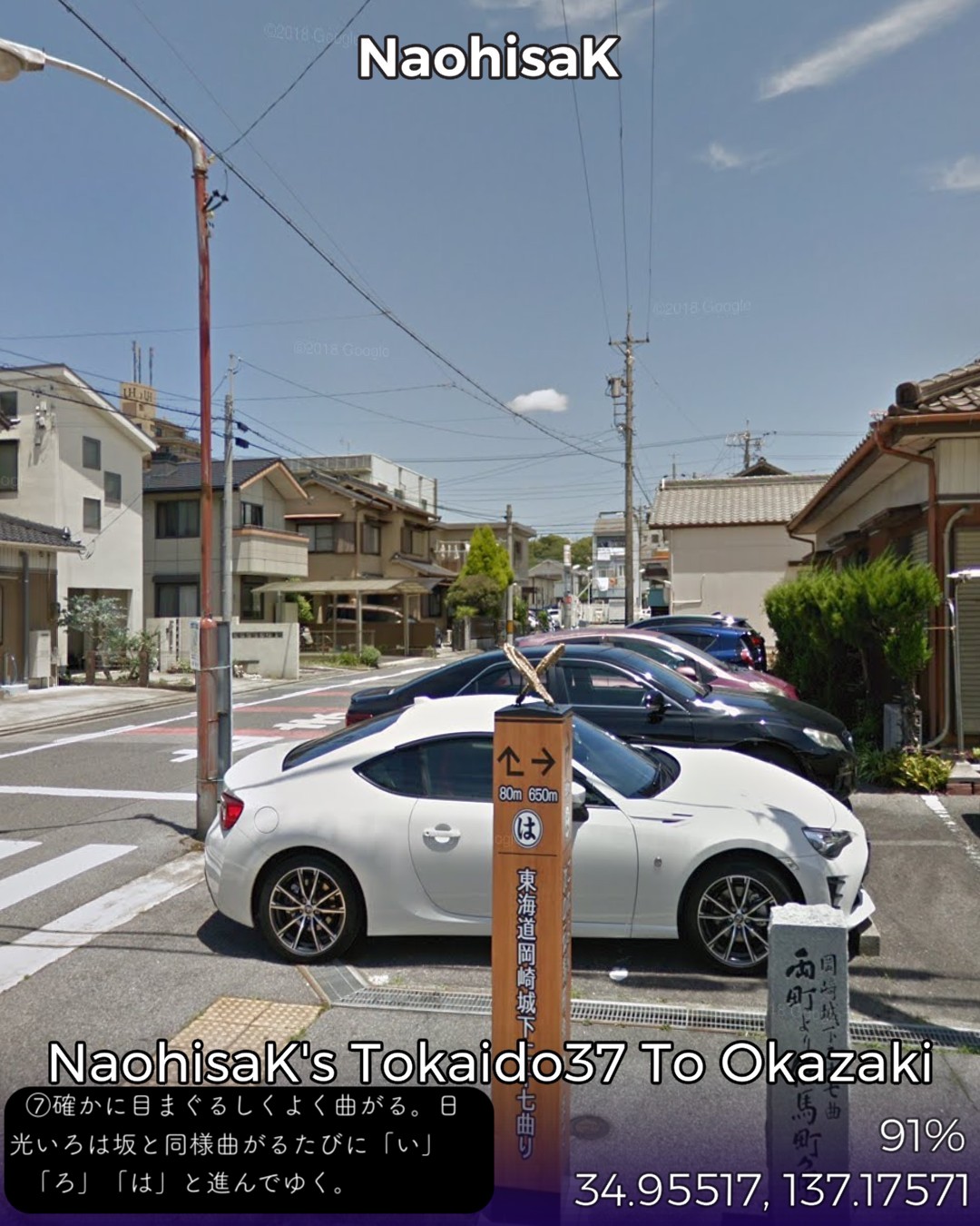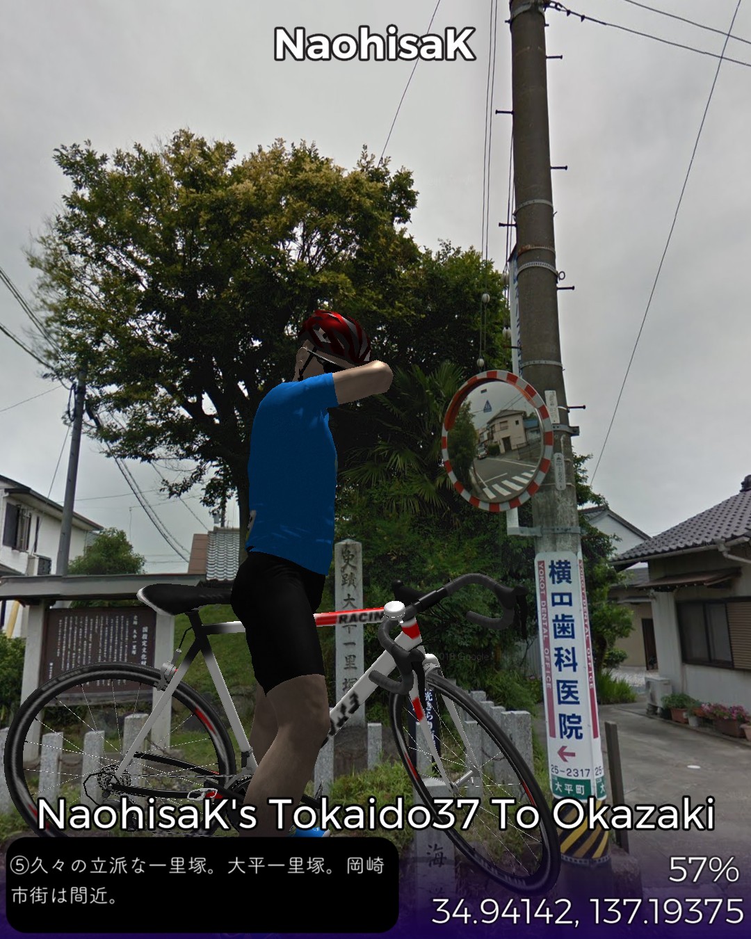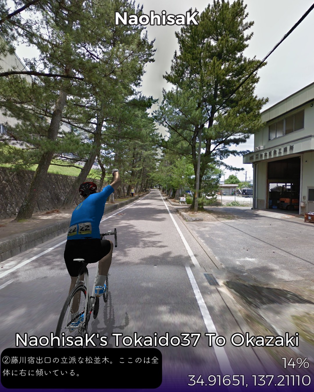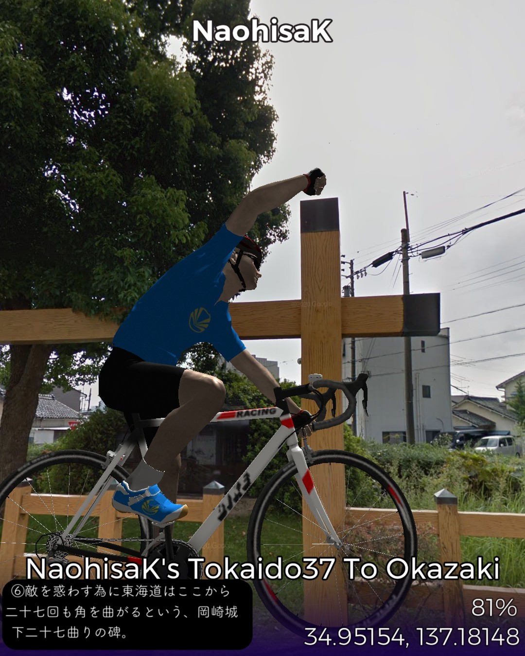 東海道バーチャルサイクリング38日目。藤川宿から岡崎宿まで8km。藤川宿の出口にはまたもや立派な松並木があった。その後、ここまでありがちな古民家が並ぶ旧道もあったが、だだっ広い畑の中の道を往ったり、こんな街中には不釣り合いな美しい清流の川を渡ったり、そうかと思うと壮麗なラブホテルが並ぶ高速インターチェンジの出入り口を走ったりと、バリエーション多彩な道を通り抜けて岡崎市街に入った。岡崎市街はまた岡崎城下二十七曲りという目まぐるしくあっちの街角こっちの街角を曲がる複雑な経路を経て本日の終点の岡崎宿本陣跡まで到達した、距離にしてはずいぶん色々な道を走った日であった。
