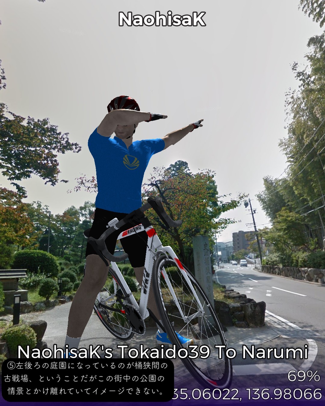 東海道バーチャルサイクリング40日目。知立宿から鳴海宿まで13km。知立は城下町で小さな城跡が残されていた。そこから国道1号を何度か跨ぎ絡みながら旧道は進んでゆく。競馬場前はまさに馬一色、その近くに有名な桶狭間の合戦場跡が残されている。こんな街中にあるとはビックリするしイメージが湧かない。さらに進むと間の宿有松の街並みが現れる。ここは見事にフォトジェニックだ。古い商家が絶妙にwindingな街道に連なっている。ここは江戸時代から有松絞りで有名でこれを扱う商店が集まっているようだ。ゴール鳴海宿はそれに比べると地味な宿場町。