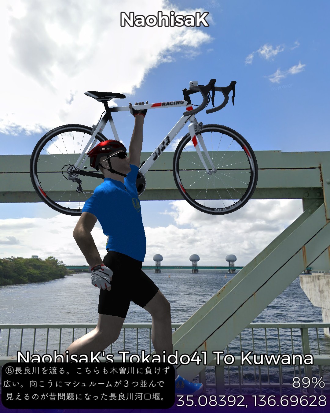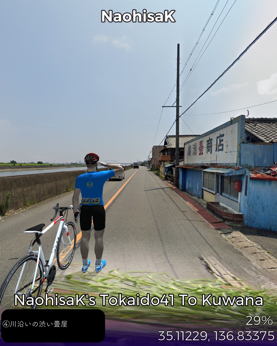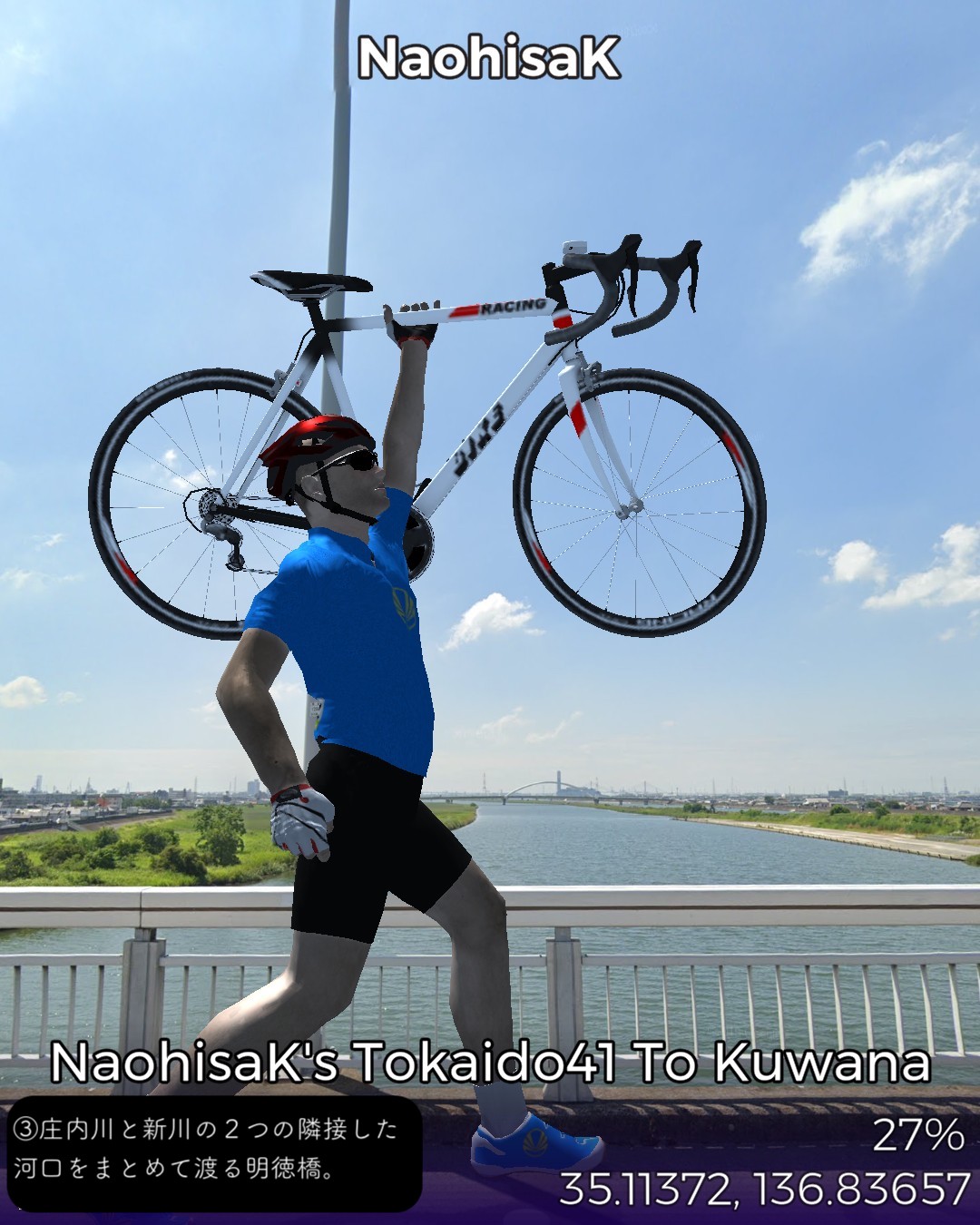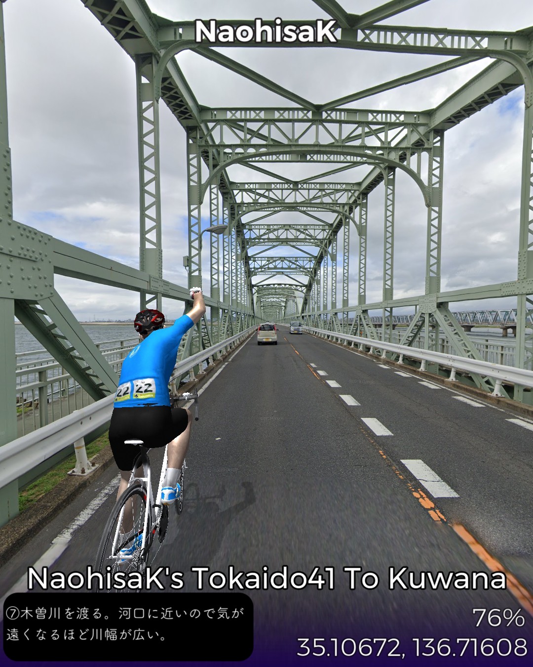 東海道バーチャルサイクリング、42日目。宮宿から桑名宿まで25kmの最長距離。2日に分けて走るつもりだったが一気に1日で走り切った。東海道は海の上の「七里の渡」になるので今日だけは東海道ではない陸路を走る。と言いながら主に東海通りという東海道もどきっぽいネーミングの道を走ったりする。名古屋市街の賑やかな箇所は回避して川や運河が錯綜するウォーターフロント地帯を走り抜けいつの間にか田園地帯に入っている。その後国道に出て金魚の町弥富を抜けて木曽川と長良川のどちらも日本離れした広い川幅の橋を2つ渡ると桑名。今日のゴールは出発点の七里の渡しから海を渡ってたどり着く桑名の七里の渡し。気がつけば三重県に入っている。東海道もいよいよ最終ラウンド。
