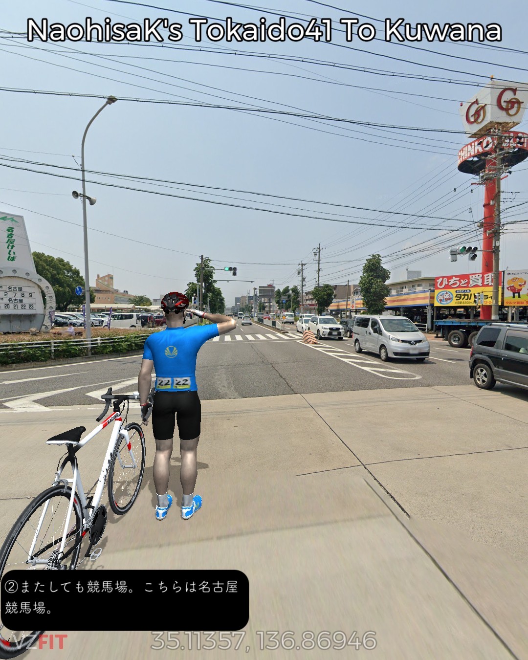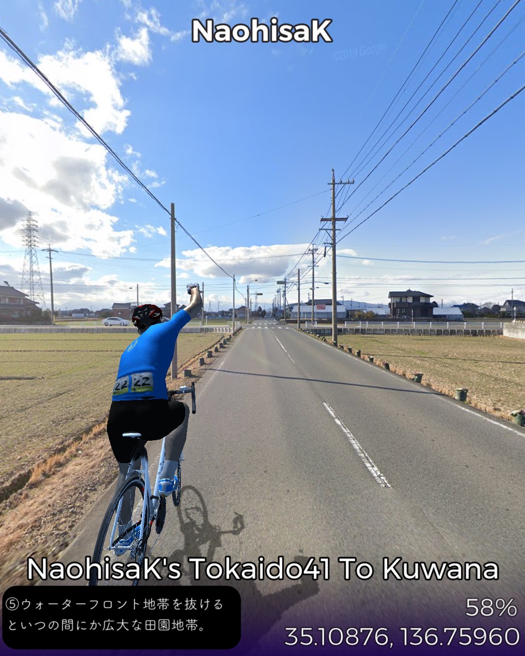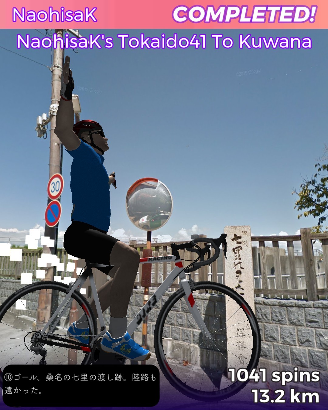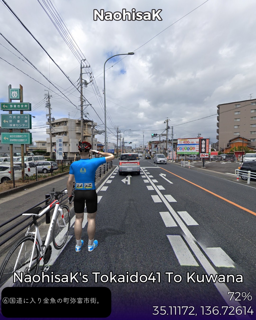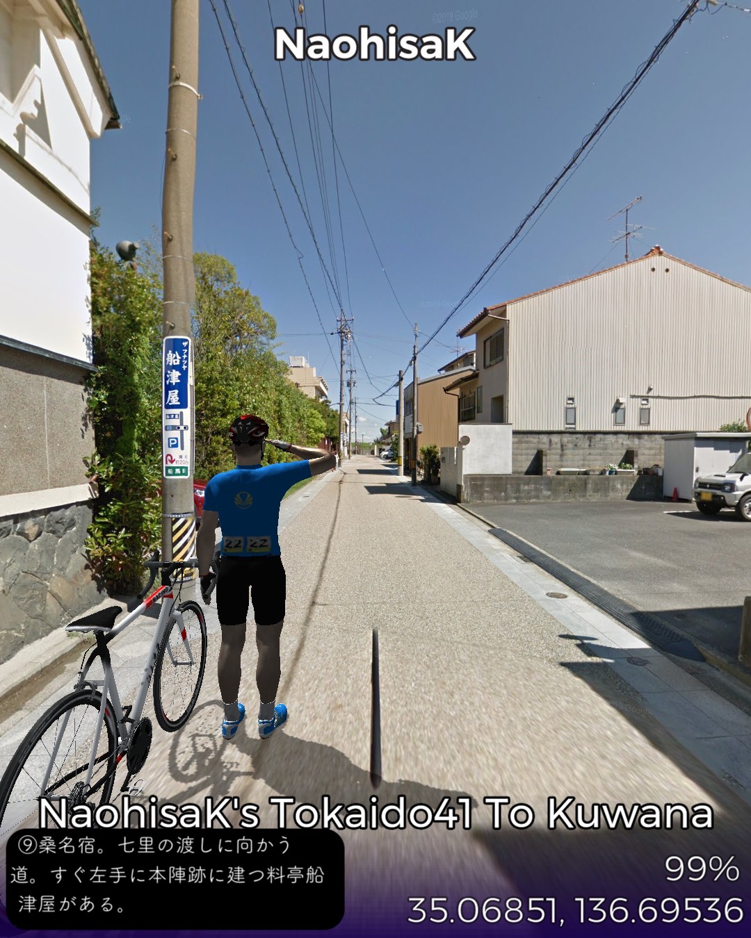 東海道バーチャルサイクリング、42日目。宮宿から桑名宿まで25kmの最長距離。2日に分けて走るつもりだったが一気に1日で走り切った。東海道は海の上の「七里の渡」になるので今日だけは東海道ではない陸路を走る。と言いながら主に東海通りという東海道もどきっぽいネーミングの道を走ったりする。名古屋市街の賑やかな箇所は回避して川や運河が錯綜するウォーターフロント地帯を走り抜けいつの間にか田園地帯に入っている。その後国道に出て金魚の町弥富を抜けて木曽川と長良川のどちらも日本離れした広い川幅の橋を2つ渡ると桑名。今日のゴールは出発点の七里の渡しから海を渡ってたどり着く桑名の七里の渡し。気がつけば三重県に入っている。東海道もいよいよ最終ラウンド。