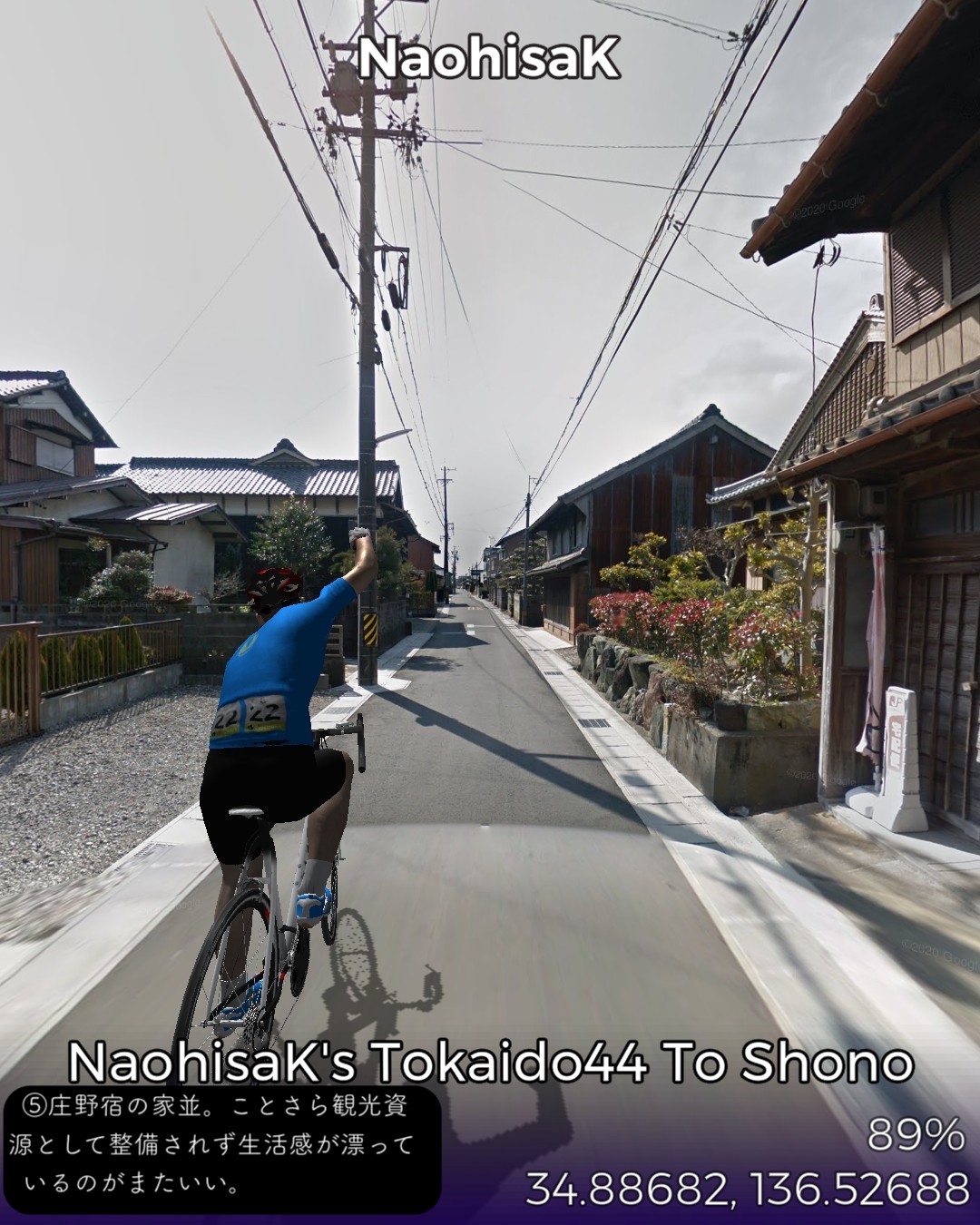 東海道バーチャルサイクリング45日目。石薬師宿から庄野宿までたった4km。ダブルで次の宿場まで行っちゃえばよかったかもしれない。6年前歩いた時、田んぼの畦道のようないい感じの旧道を歩いたのだが、ストリートビューが存在しない道だったらしくイイところをスキップされてさらに短い距離になってしまった。結局フォトジェニックなのは石薬師宿を出るまでとあっという間についた次の庄野宿に入ってからで、あとは国道1号を走っているだけ。庄野宿は山河に囲まれた田園地帯の中、地味ながら細い旧街道沿いに古民家が立ち並ぶ。