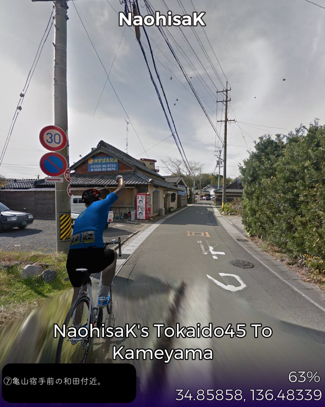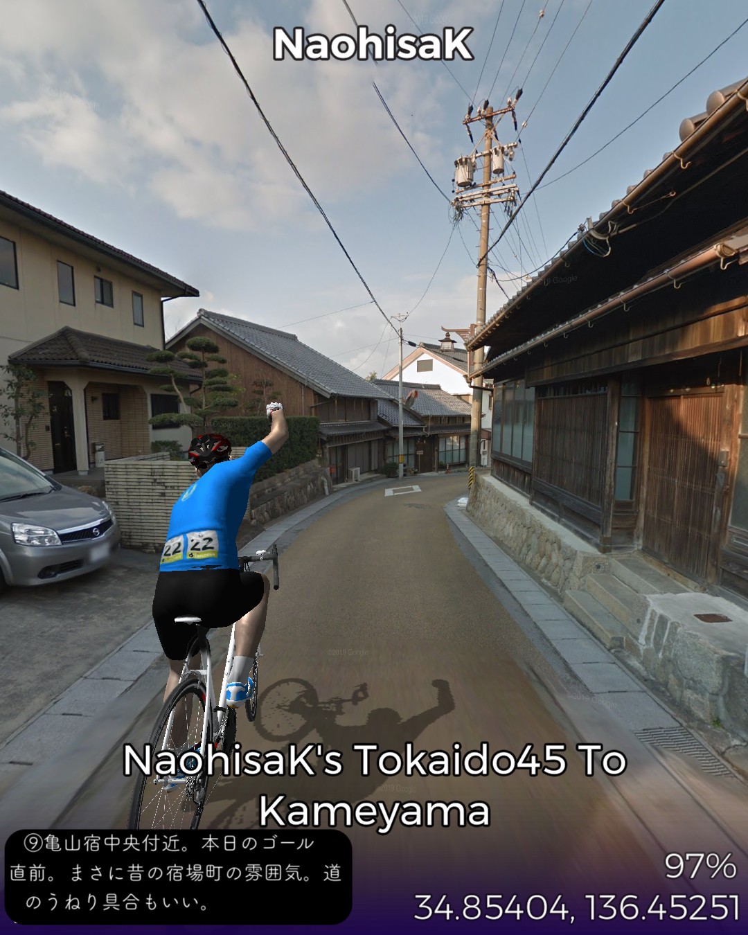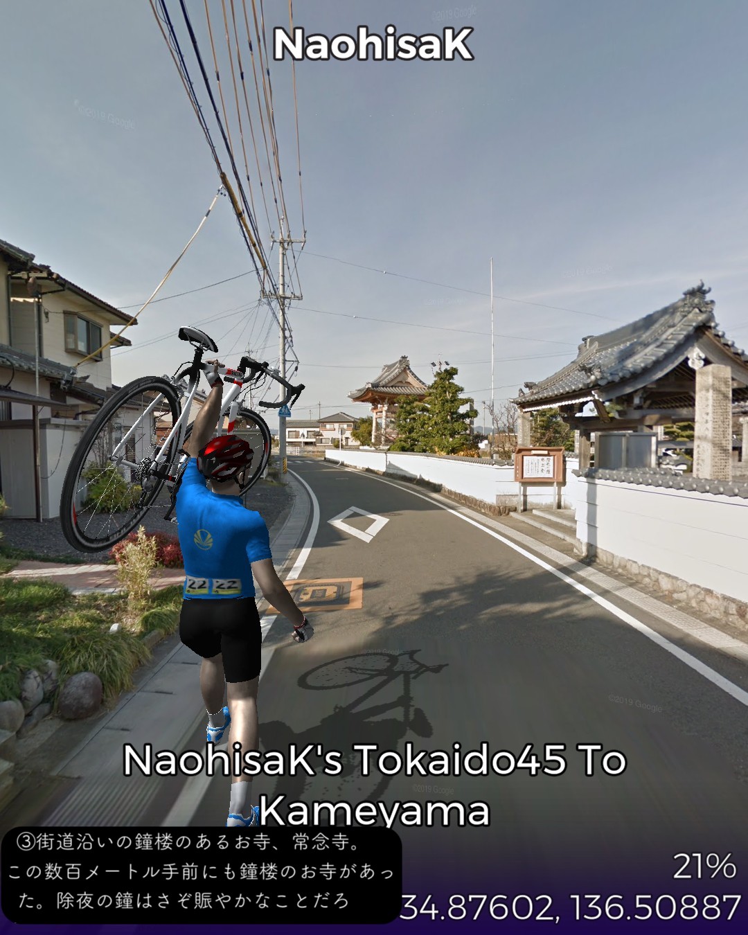 東海道バーチャルサイクリング46日目。庄野宿から亀山宿への9km。山野を駆け巡る田舎道の旧道コース。遠くに山を望む開けた田園地帯だが、川は結構深い谷になっていたりする。そんな川を渡ってグネグネした田舎道沿いの村落を進んでゆくという夢の記憶のようなイメージがずっと頭に残っていて実際に行ったところのような気がするんだけど何処だったけな、と思っていたのだが、それはこのルートを6年前に通った時の記憶ということが今日の行程で判明した。東海道でもそのような場所がいくつかある。街道をあちこち歩いているとデジャヴ感というか巨大な箱庭の中を堂々巡りしているような感覚になる。多分街道風景というのが共通の日本の原風景だからではないかと思う。そんな中でも富士山のような明らかなランドマークがあるわけではなく場所は不明だけど、ちょっと特徴的な道筋を、疲れて夢うつつで歩いている時にこのような夢の記憶になるのではないかと自己分析している。ゴールの亀山はそこそこ大きな町だが河岸段丘の上の東海道に沿って古い家並が続くノスタルジックな町。