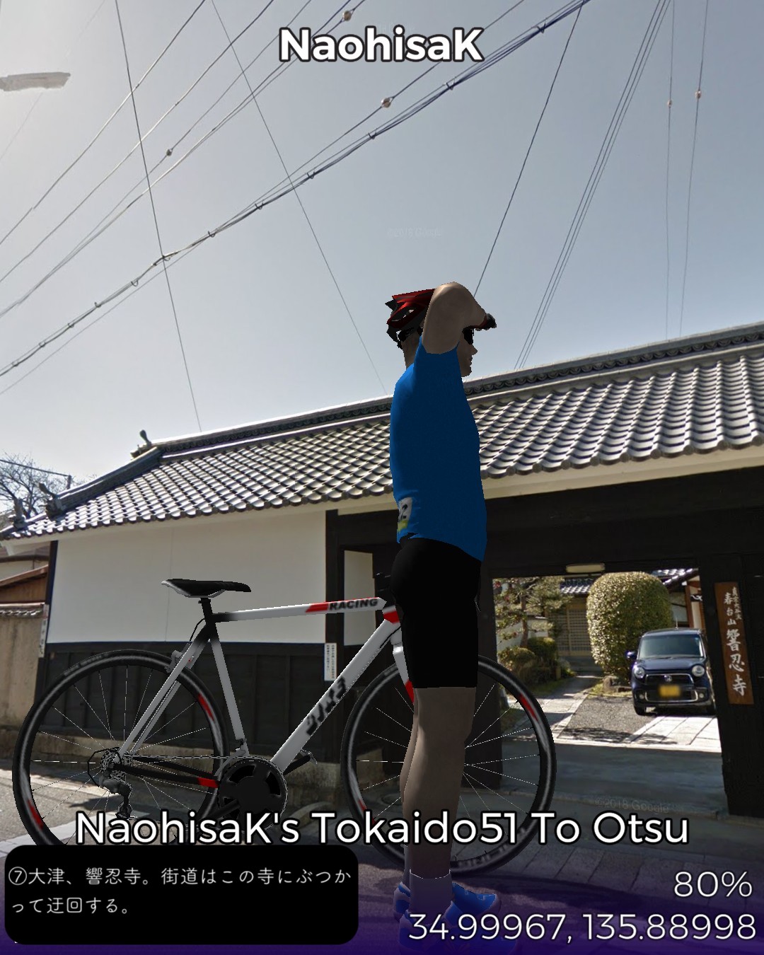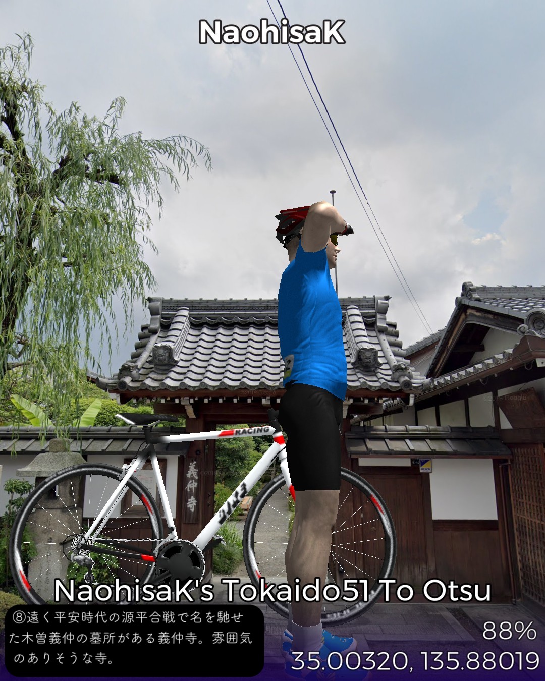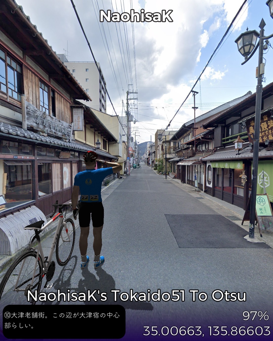 東海道バーチャルサイクリング52日目。草津宿から大津宿まで15km。ここに至っては京阪神の都市圏ですね。周囲はビルやマンションが林立している気配はありますが、それでも東海道旧道周辺だけはタイムスリップしたかのように多分数十年、下手すると百年そのまま変わらない佇まい。今日の道は特に狭いが、その細道にびっちりと古い家や商家、寺社が両脇を固めています。琵琶湖南端の瀬田の唐橋を渡ると大津の市街。滋賀県の県庁所在地ですが、近いだけあってここはもう雰囲気的には京都の延長ですね。とにかく神社仏閣が多い。また老舗の商店も多いです。いよいよリーチ!明日、三条大橋にゴールして東海道バーチャルサイクリングを締めくくる予定です。
