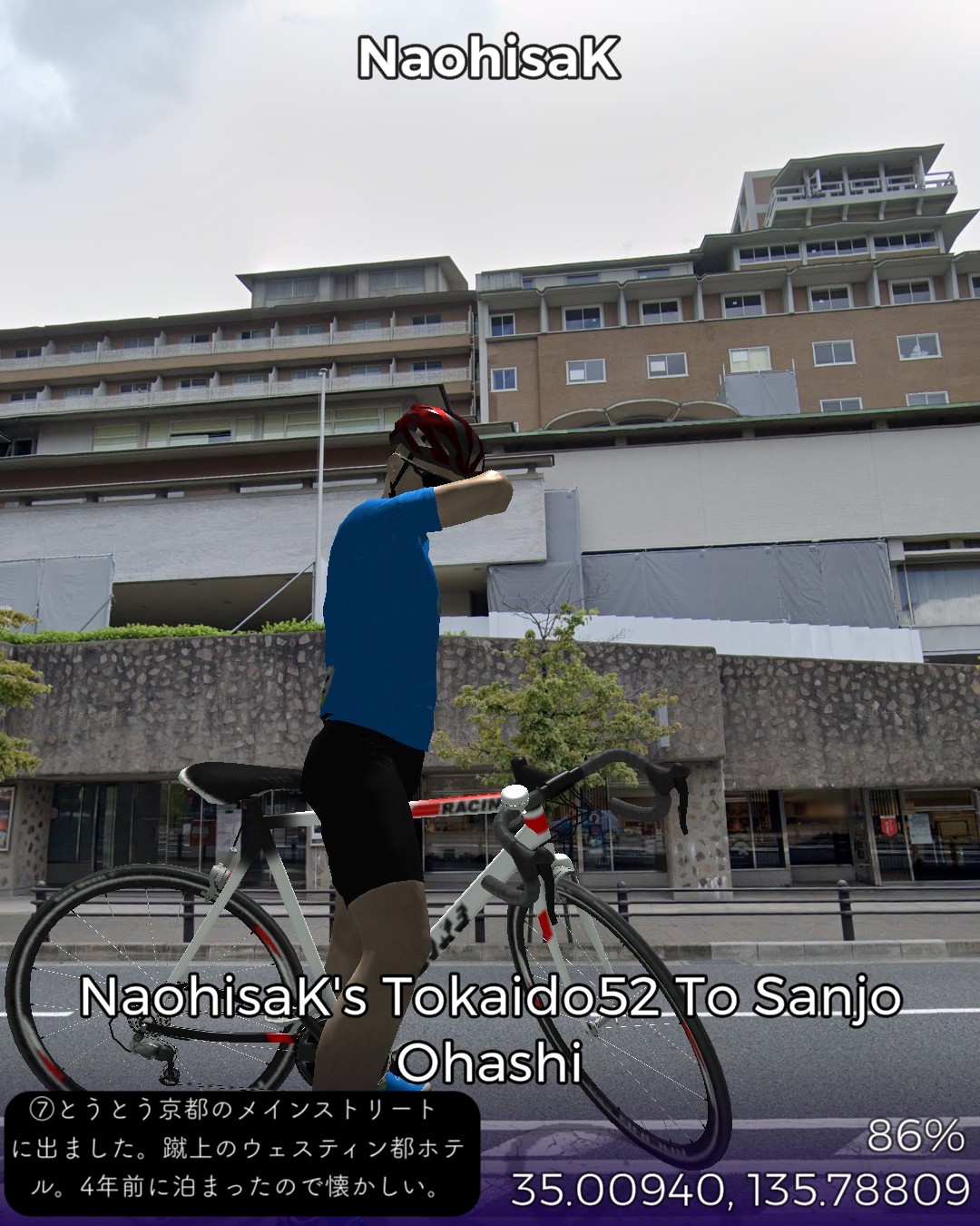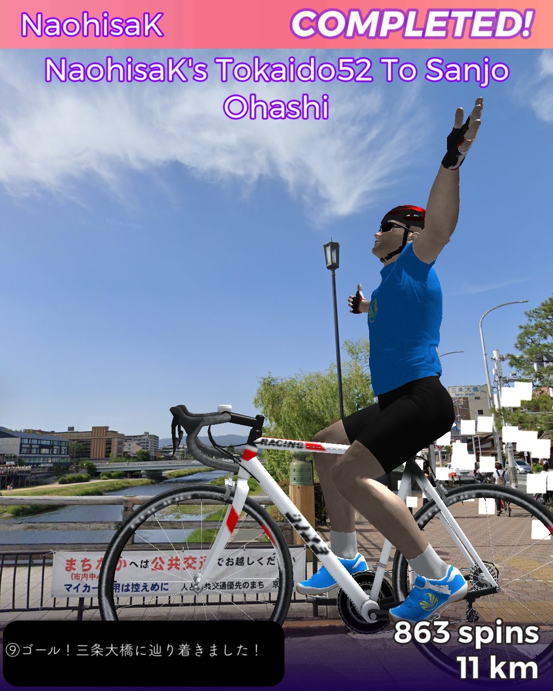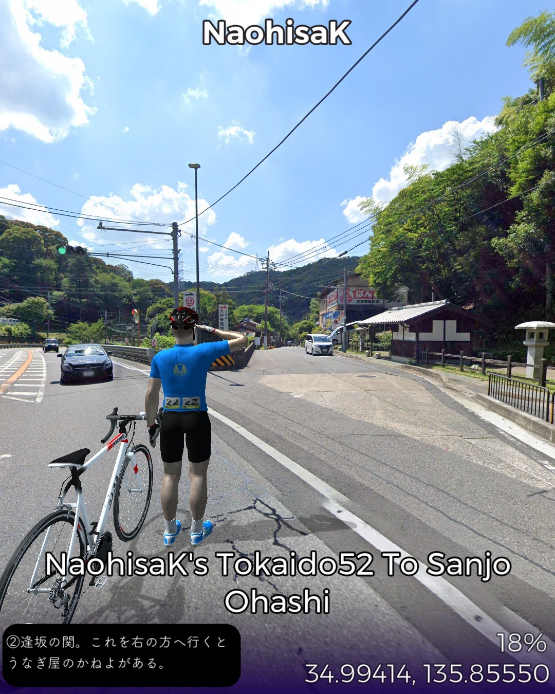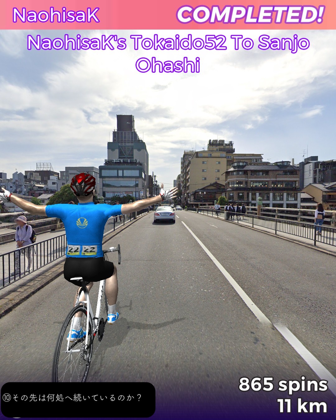 東海道バーチャルサイクリング53日目。ちょうど五十三次になってる!大津宿から京都の三条大橋の東海道終着点まで11kmの行程。大津の町中からあっという間に緑濃い逢坂山の登りに入り、峠の逢坂の関跡を超えてうなぎ屋のかねよを通りすぎて峠を下るとすぐ京都市内に入る。まず賑やかな山科の街並みが出迎えてくれる。その後その賑やかなまま終点まで行くのかと思いきや、東山の裏側のとてつもなくうらぶれた山道をしばし通るハメになり、それが広い道にでたと思ったらすぐに南禅寺とウェスティン都ホテルの間という京都の観光メインストリートにいるという劇的な展開が最後に用意されていた。そして無事三条大橋に到着しました。バーチャルとはいえVRなのでリアリティは結構あるんですね。私としては自分の魂の一部を旅に出したような気がしております。旅に出た以上簡単に戻ることはありません。展開によっては一生戻ることはなくさすらいの旅を続けることになるかもしれません。とりあえず京都で旅の荷を解き次にどこへ行くかしばらく構想を練りたいと考えております。