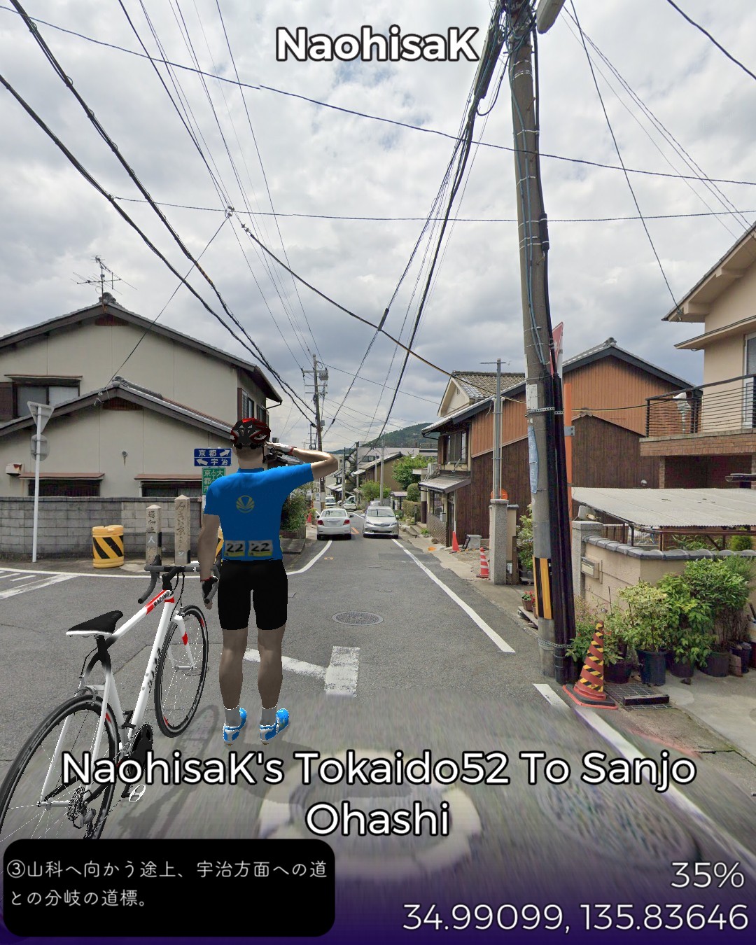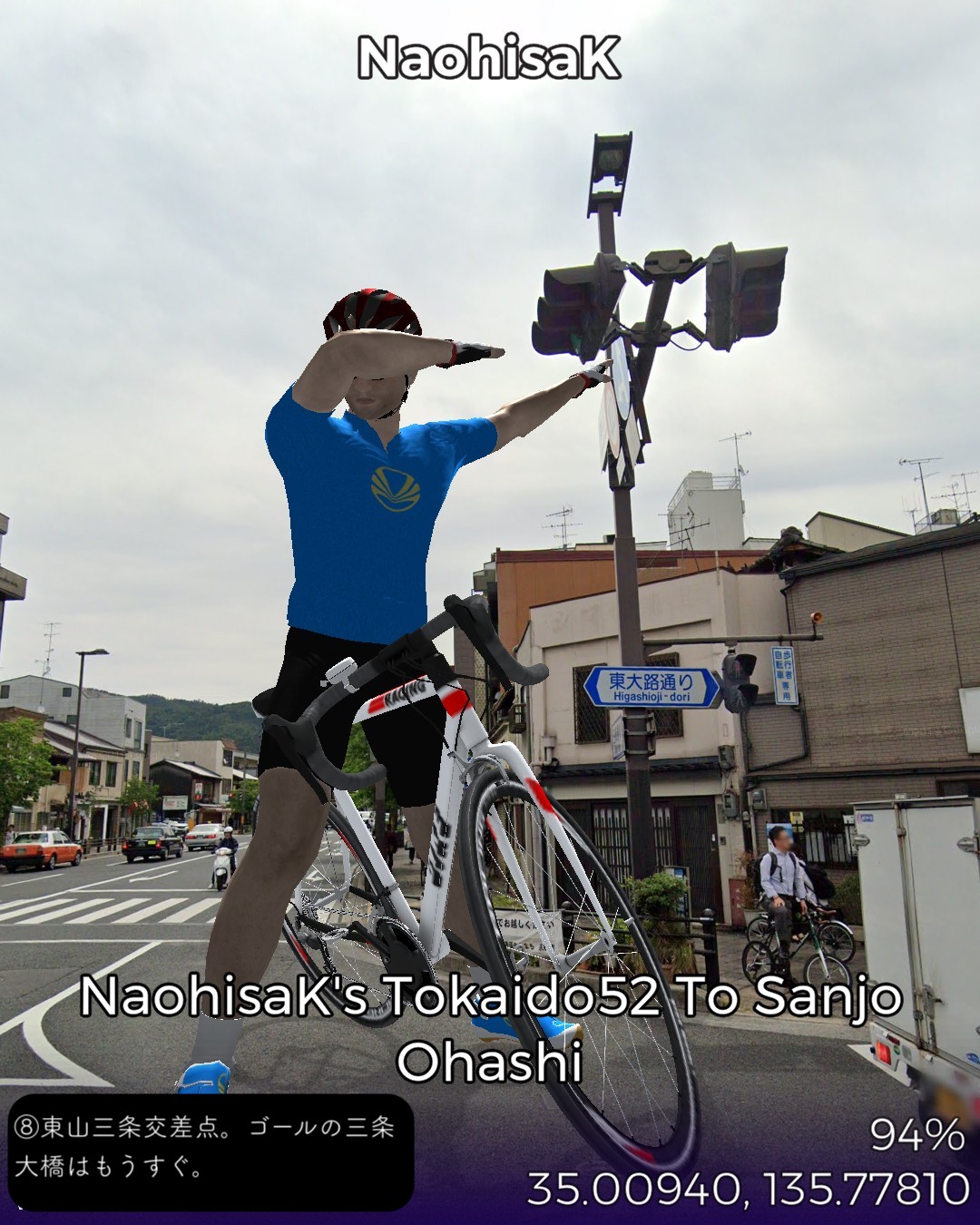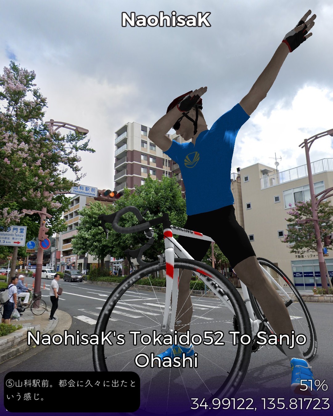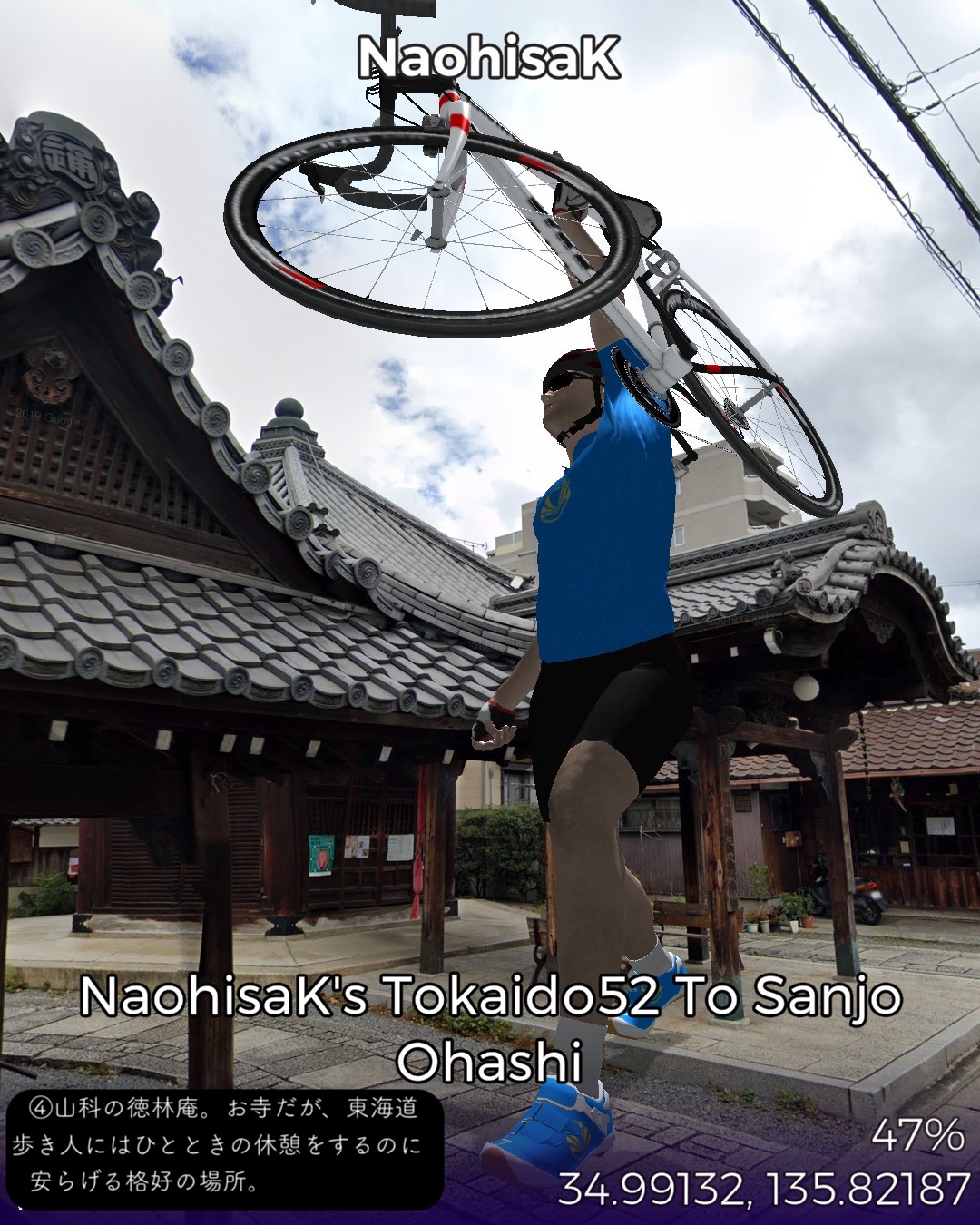 東海道バーチャルサイクリング53日目。ちょうど五十三次になってる!大津宿から京都の三条大橋の東海道終着点まで11kmの行程。大津の町中からあっという間に緑濃い逢坂山の登りに入り、峠の逢坂の関跡を超えてうなぎ屋のかねよを通りすぎて峠を下るとすぐ京都市内に入る。まず賑やかな山科の街並みが出迎えてくれる。その後その賑やかなまま終点まで行くのかと思いきや、東山の裏側のとてつもなくうらぶれた山道をしばし通るハメになり、それが広い道にでたと思ったらすぐに南禅寺とウェスティン都ホテルの間という京都の観光メインストリートにいるという劇的な展開が最後に用意されていた。そして無事三条大橋に到着しました。バーチャルとはいえVRなのでリアリティは結構あるんですね。私としては自分の魂の一部を旅に出したような気がしております。旅に出た以上簡単に戻ることはありません。展開によっては一生戻ることはなくさすらいの旅を続けることになるかもしれません。とりあえず京都で旅の荷を解き次にどこへ行くかしばらく構想を練りたいと考えております。