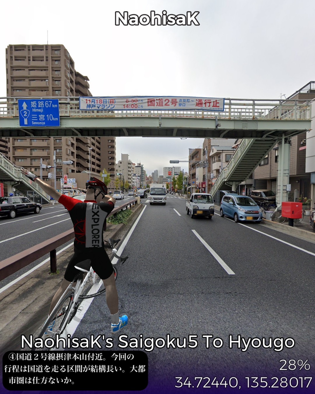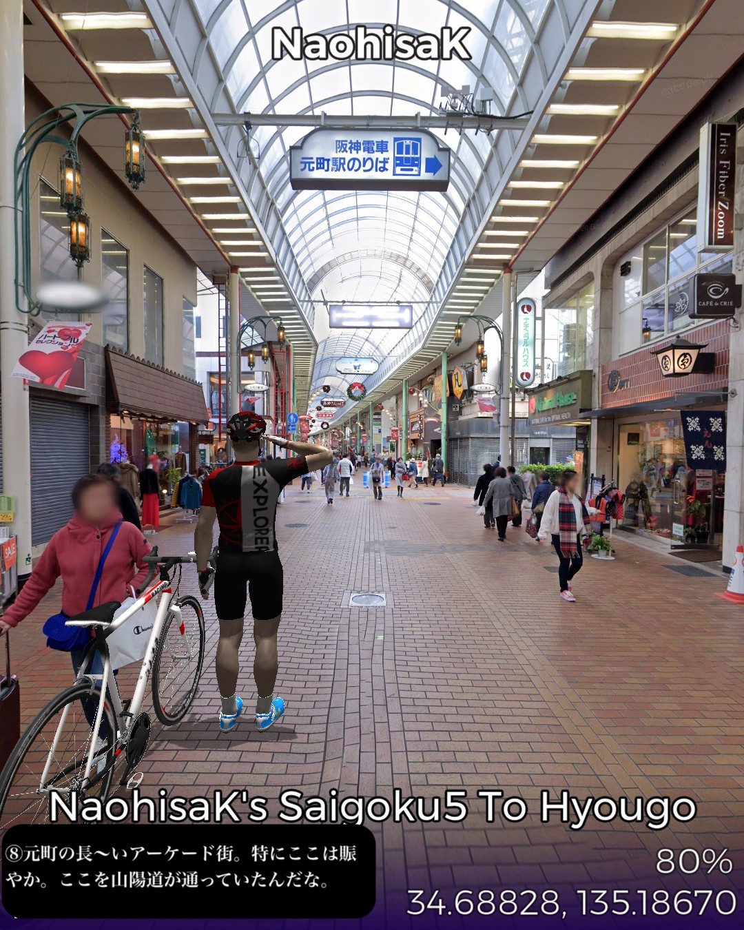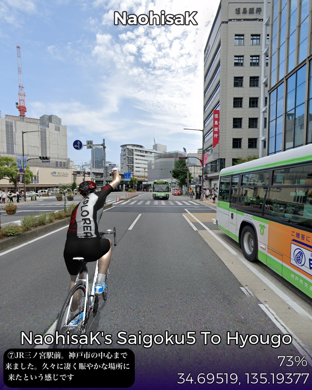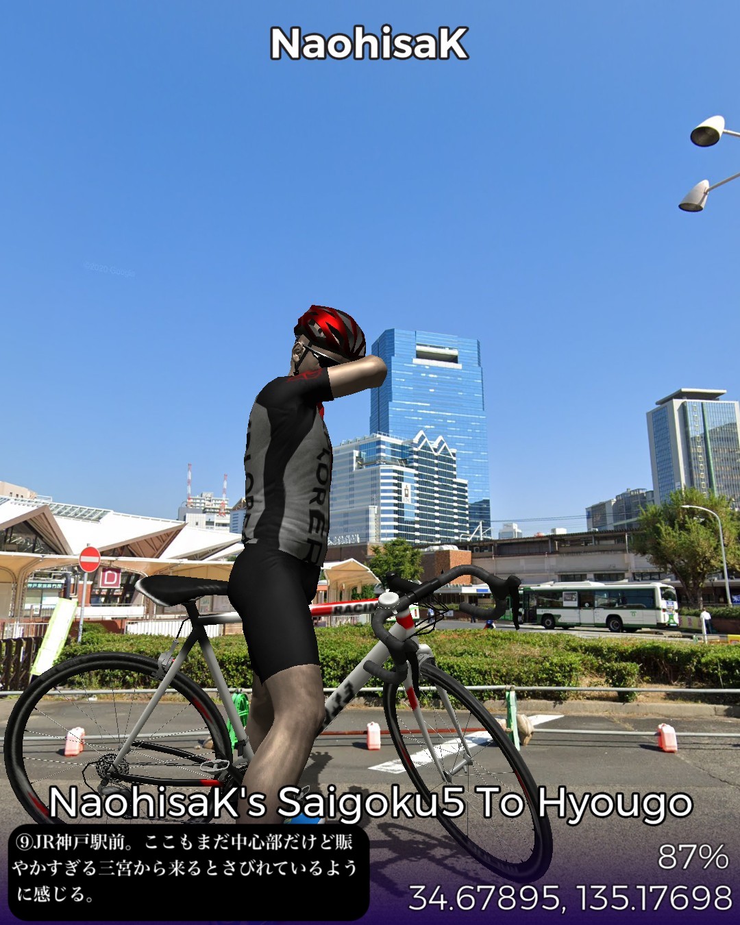 西宮宿からさらに西を目指す。西国街道としても良いが正式には山陽道とするのが通例のようなので山陽道1日目とする。本日は神戸市の西側に位置する兵庫宿まで宿場では1つ分だが距離は21kmと結構な長距離ルートとなった。西宮から高級住宅街芦屋市を抜けて東西に長い神戸市を横断してゆく。大都市圏なので、基本的にビル街であるが、国道2号線を走ったり、並行した細い路地を走ったりが現代における街道筋になる。海側の阪神線は下町っぽく、山側の阪急線は山手っぽいというのは走ってみるとよくわかる。本日のルートは主に阪神線の沿線に沿ってきたので下町っぽい感じの街並みを抜けてきた感じだ。たどり着いた神戸の中心地三ノ宮はこのVRサイクリングツアーで東京を出て以来、京都以上の大都市の雑踏でバーチャルでも不思議と目眩を覚えた。この先の西方ではここまでの大都市の雑踏はないだろう。
