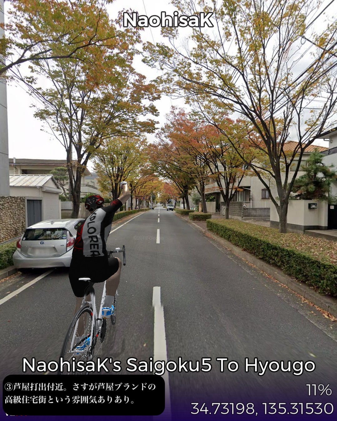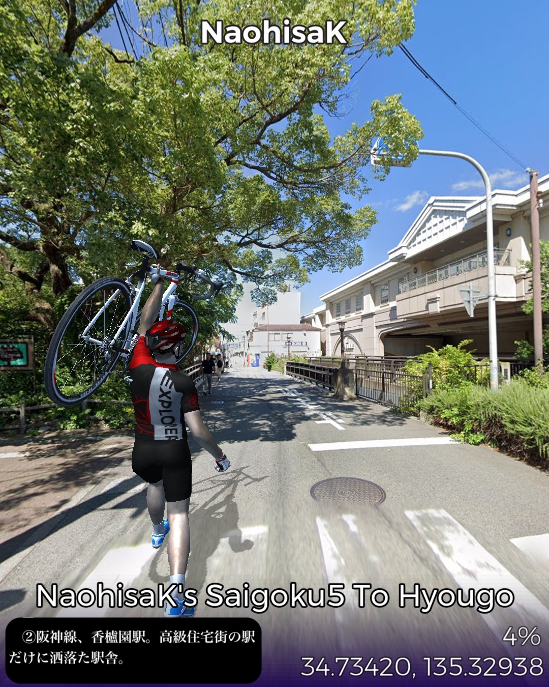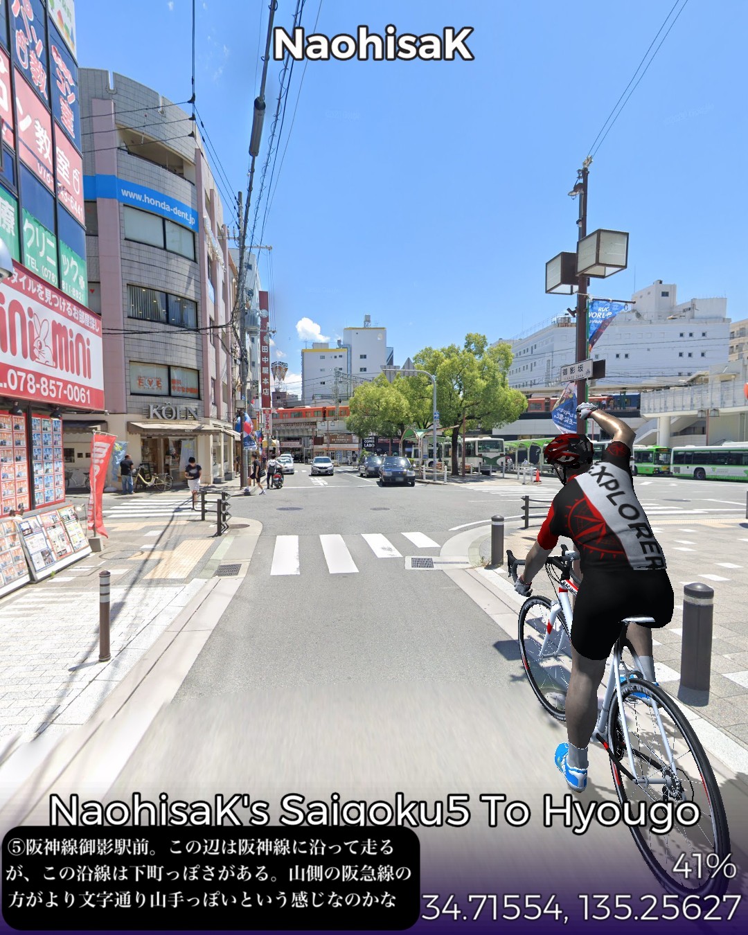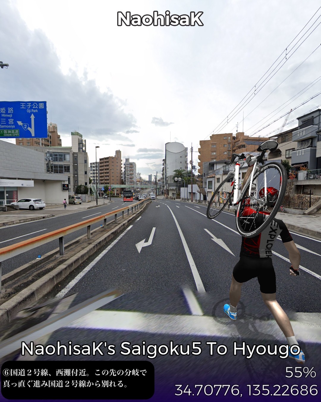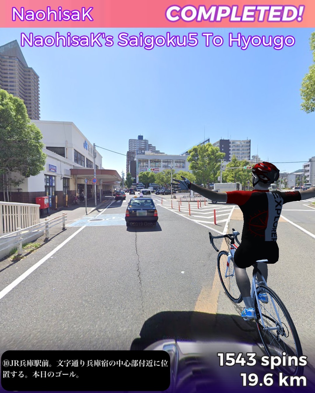 西宮宿からさらに西を目指す。西国街道としても良いが正式には山陽道とするのが通例のようなので山陽道1日目とする。本日は神戸市の西側に位置する兵庫宿まで宿場では1つ分だが距離は21kmと結構な長距離ルートとなった。西宮から高級住宅街芦屋市を抜けて東西に長い神戸市を横断してゆく。大都市圏なので、基本的にビル街であるが、国道2号線を走ったり、並行した細い路地を走ったりが現代における街道筋になる。海側の阪神線は下町っぽく、山側の阪急線は山手っぽいというのは走ってみるとよくわかる。本日のルートは主に阪神線の沿線に沿ってきたので下町っぽい感じの街並みを抜けてきた感じだ。たどり着いた神戸の中心地三ノ宮はこのVRサイクリングツアーで東京を出て以来、京都以上の大都市の雑踏でバーチャルでも不思議と目眩を覚えた。この先の西方ではここまでの大都市の雑踏はないだろう。