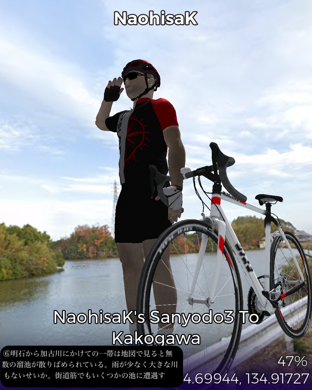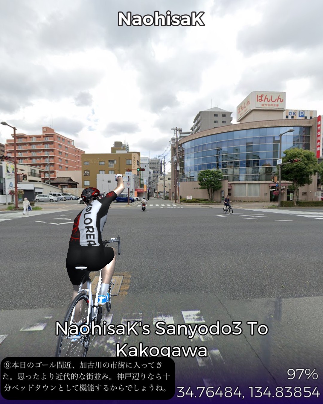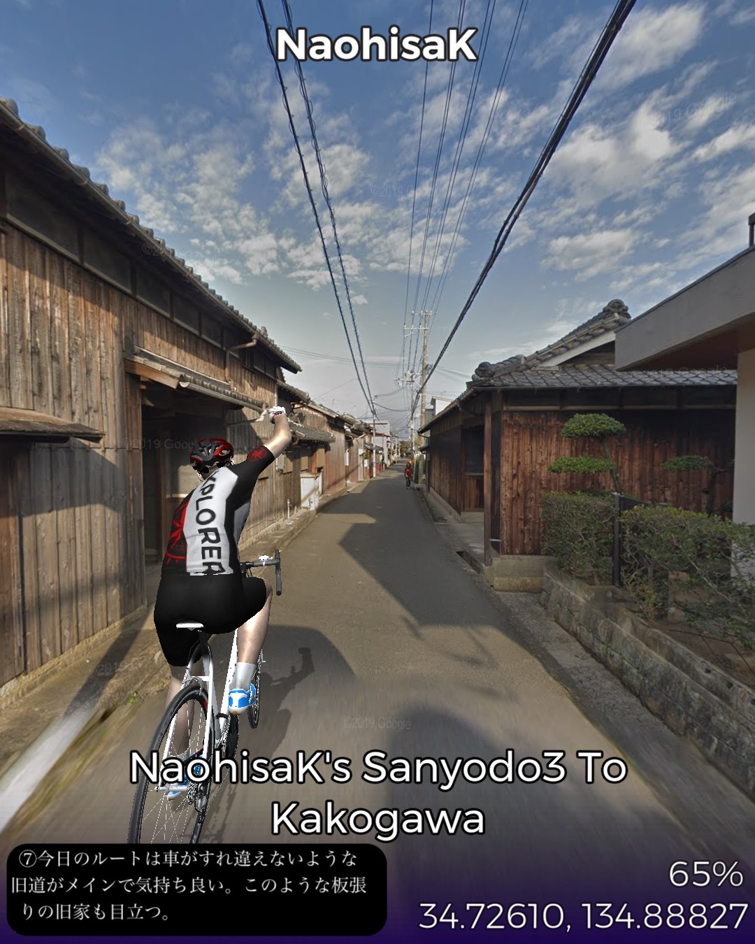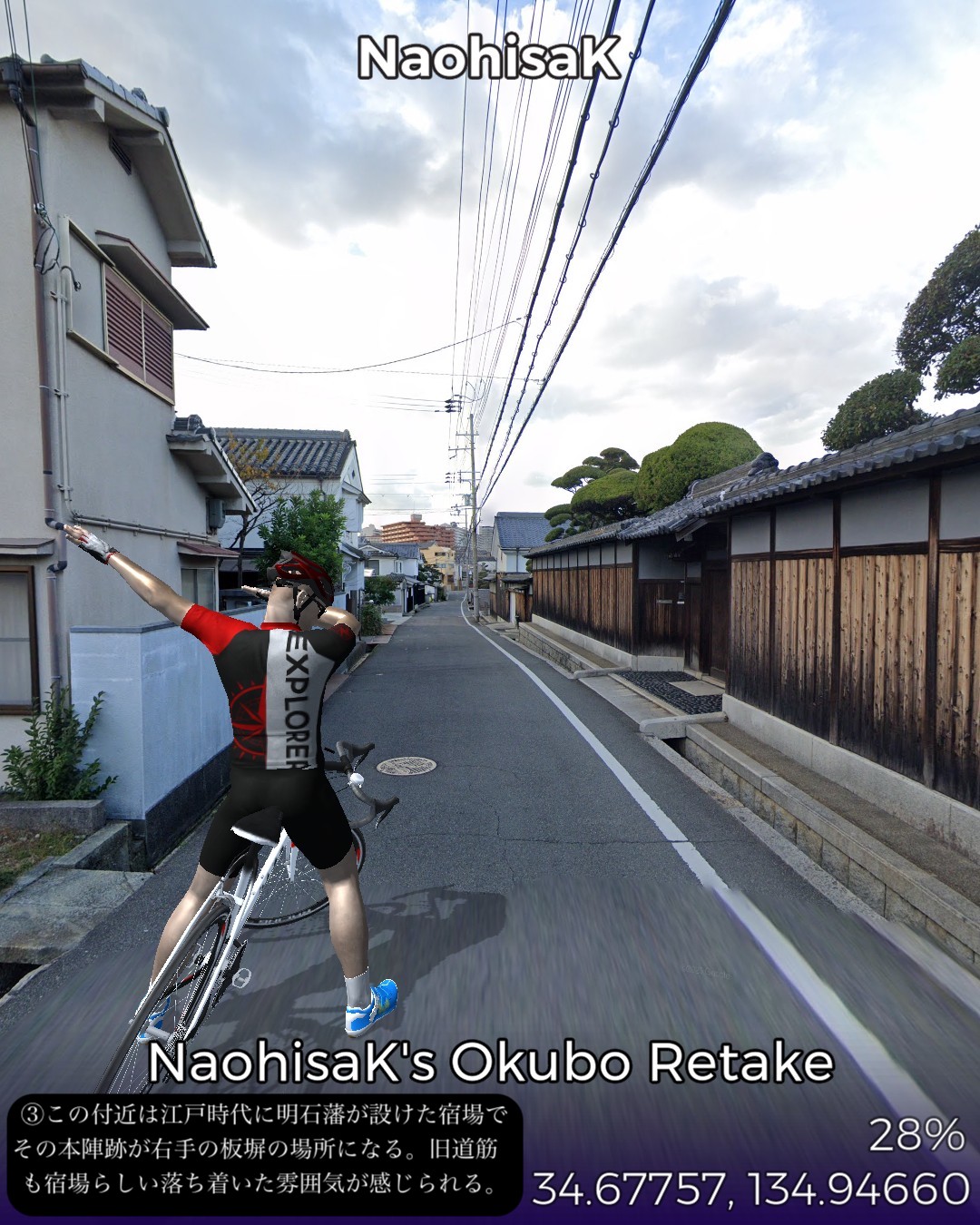 VRサイクリング、山陽道3日目は鯛と蛸と日本標準時の街明石宿から何のイメージも湧かない初めての街加古川宿まで22kmの行程。今日のルートは前日と異なり車がすれ違えないような狭くてウネウネした旧道を主に進む。旧道沿いは現代的な住宅街がメインだが板張りの旧家が点在して古い街道の雰囲気を醸し出している。この地域は地図で見ると溜池が至るところに散りばめられフィンランド辺りの湖沼地帯のようだ。街道沿いでもそのうちのいくつかの池の辺りを通る。加古川はベッドタウンとしても機能する場所柄だが、街道の通る寺家町商店街というアーケード街は半ばシャッター商店街と化してはいるが昭和レトロな時が止まったような佇まいが旅情をそそる。