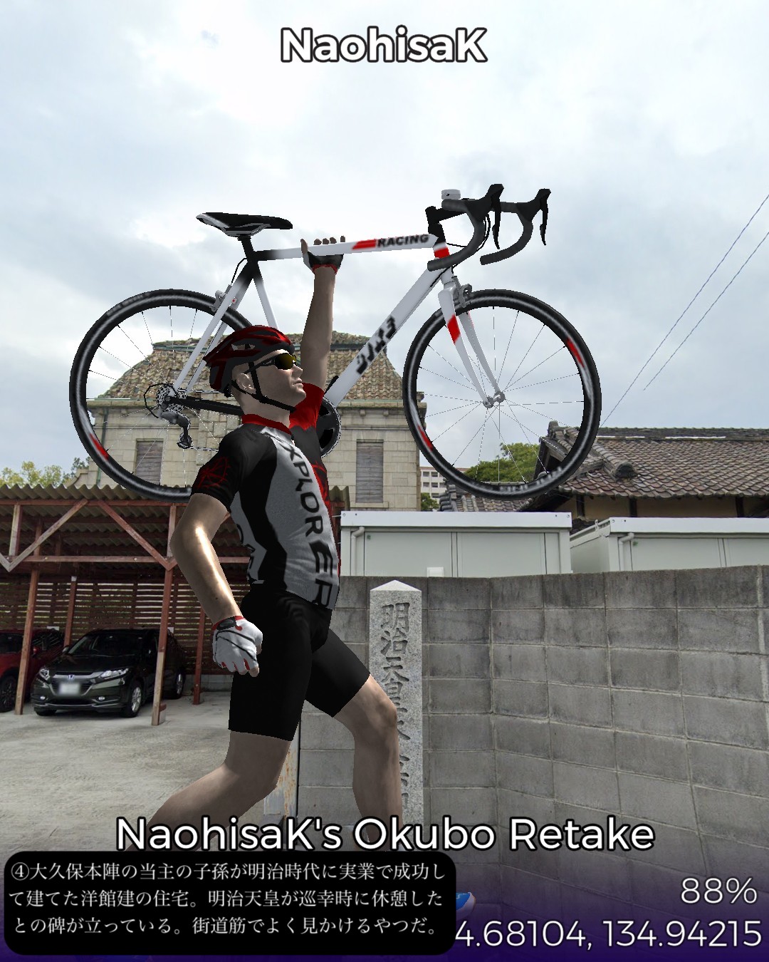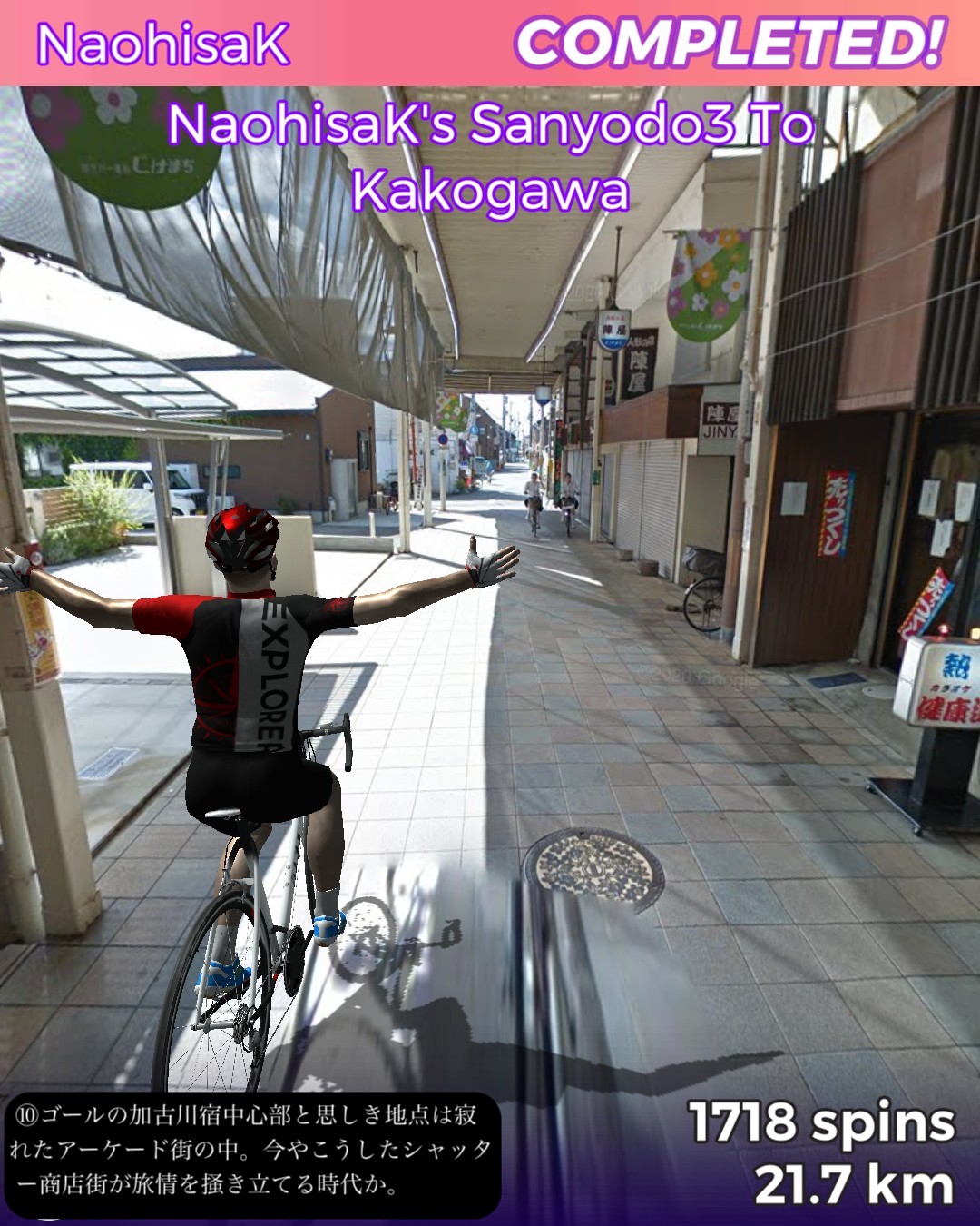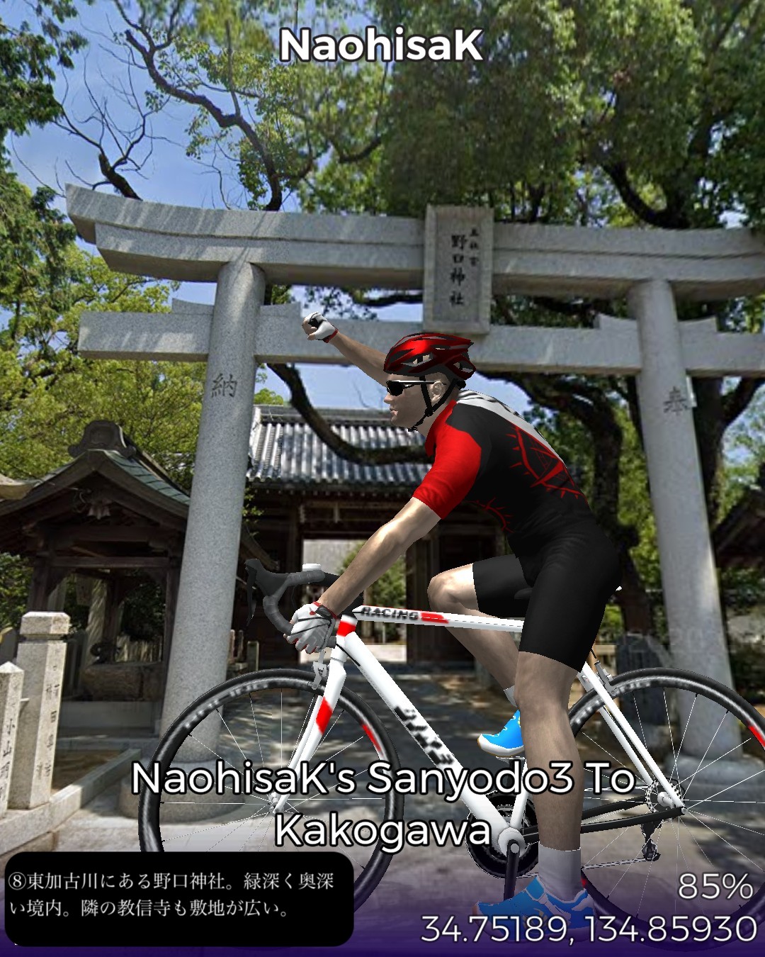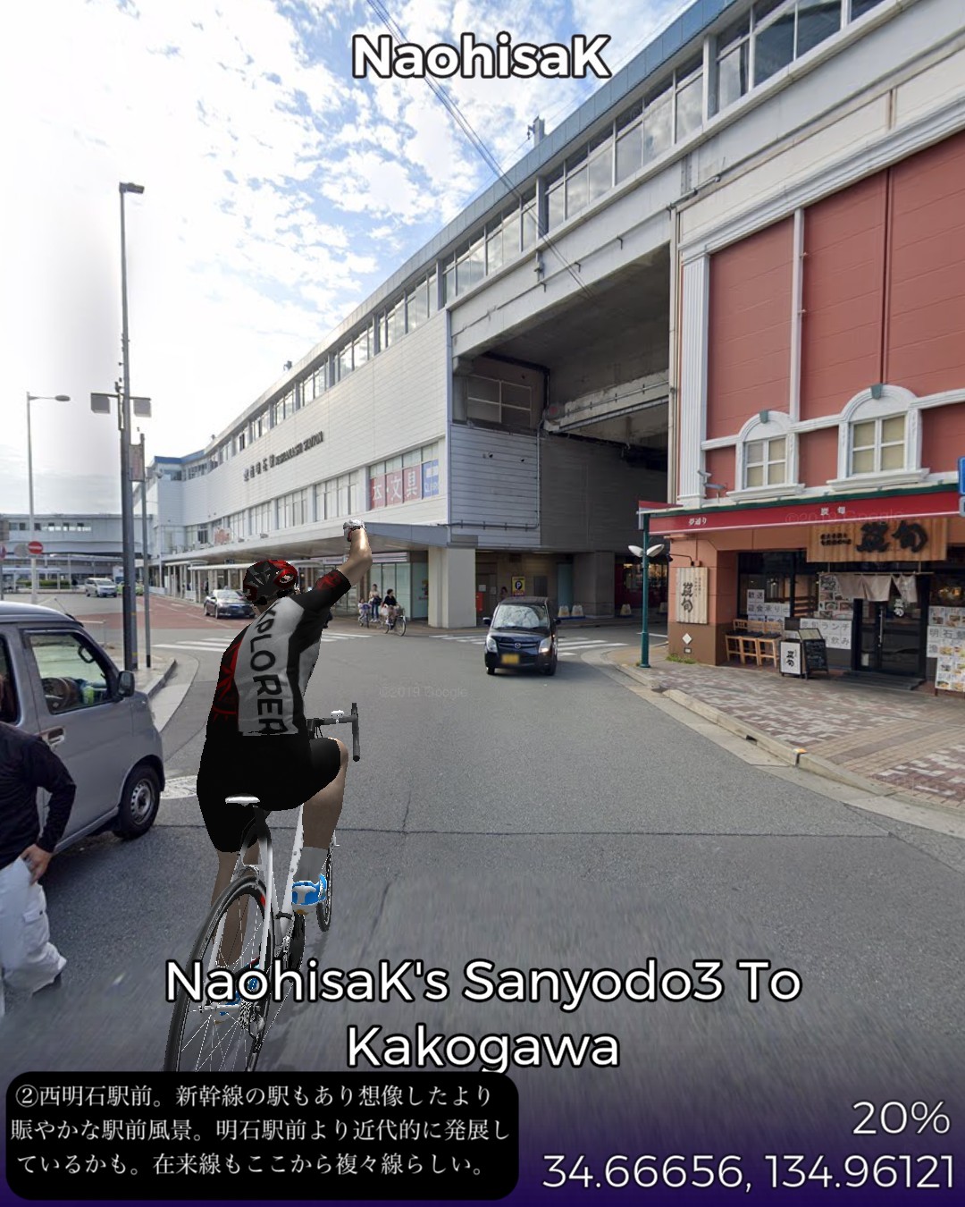 VRサイクリング、山陽道3日目は鯛と蛸と日本標準時の街明石宿から何のイメージも湧かない初めての街加古川宿まで22kmの行程。今日のルートは前日と異なり車がすれ違えないような狭くてウネウネした旧道を主に進む。旧道沿いは現代的な住宅街がメインだが板張りの旧家が点在して古い街道の雰囲気を醸し出している。この地域は地図で見ると溜池が至るところに散りばめられフィンランド辺りの湖沼地帯のようだ。街道沿いでもそのうちのいくつかの池の辺りを通る。加古川はベッドタウンとしても機能する場所柄だが、街道の通る寺家町商店街というアーケード街は半ばシャッター商店街と化してはいるが昭和レトロな時が止まったような佇まいが旅情をそそる。