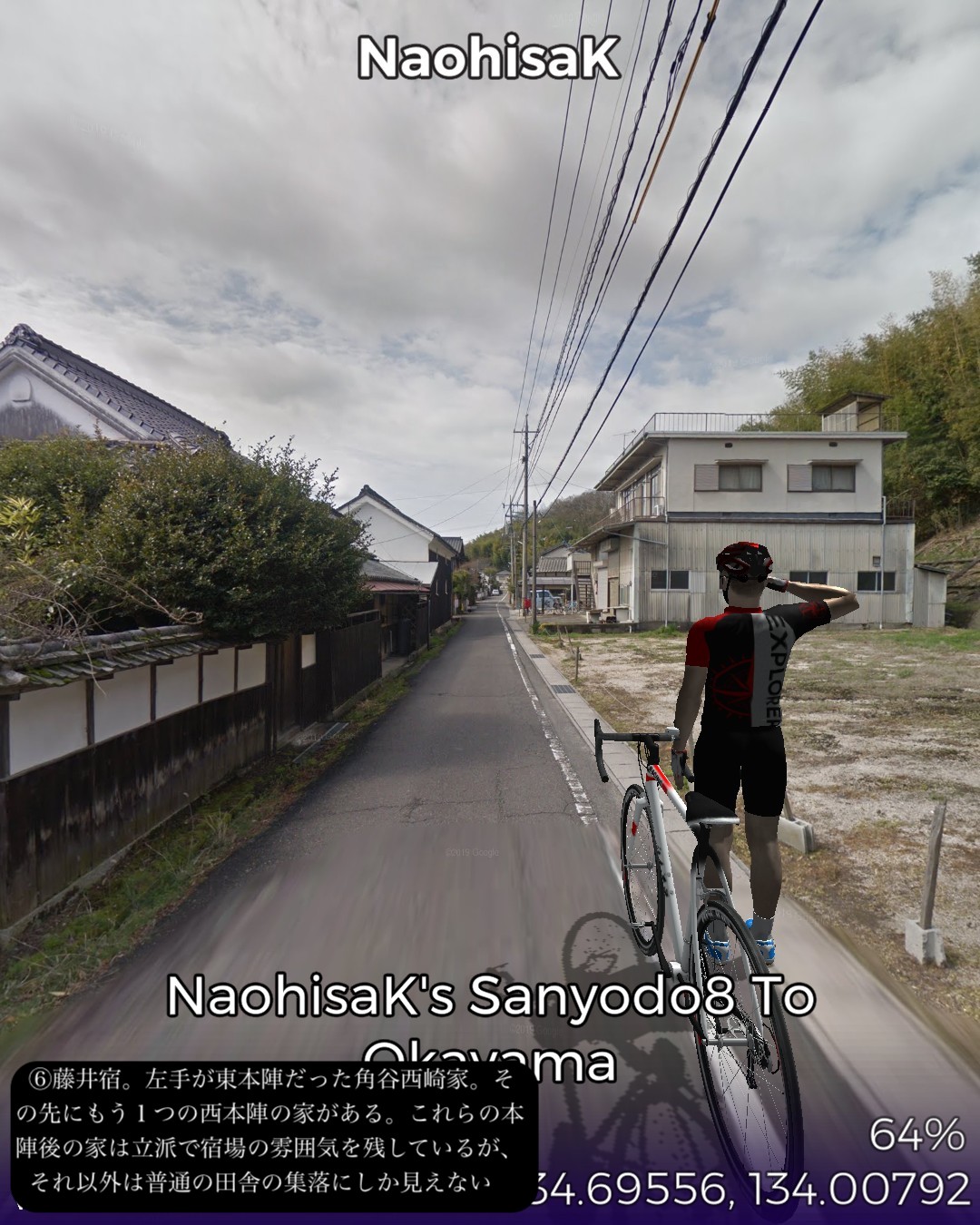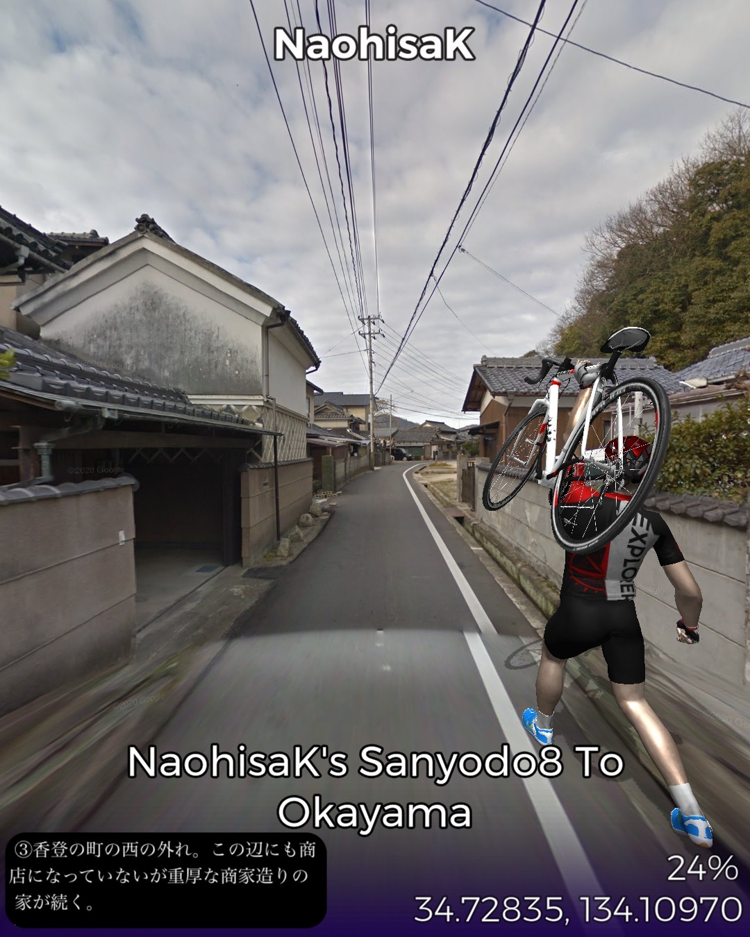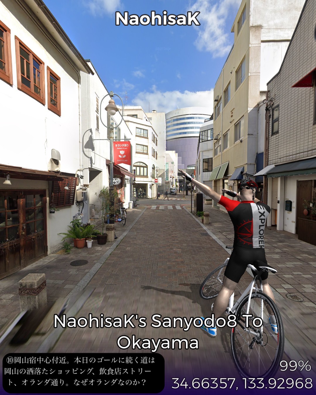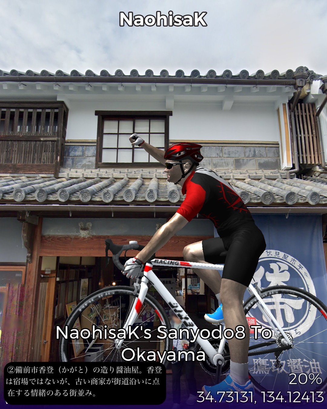 VRサイクリング、山陽道8日目は備前市片山宿をスタートし、藤井宿を経て、いよいよ岡山市街中心部に位置する岡山宿までの29kmの長丁場。実は今回リアルにはまとまった時間が取れず、昨日の夜と本日昼間の2回に分けてバイクを漕いだ。このパターンもありだね。備前焼については前日のルートでも触れたが、今日のルートで備前市内の片山宿の隣町伊部が備前焼の中心地であることが分かった。そう言えば伊部焼という別名も聞いたことがある。街道は備前焼の窯や陶器・陶芸の店が並ぶ伊部の町を通り抜ける。その後、古い商家が点在する香登の町並みも抜けて大河吉井川を渡る。その先の鄙びた田園風景もなかなか良い。さらにこれもまた鄙びた宿場、藤井宿を経て、久々の大都会岡山に至る。岡山ではちょっと街道から離れて、岡山のシンボル岡山城と後楽園を川越しに望んでから岡山の洒落たショッピングストリート、オランダ通りとなっている街道を進み、岡山宿中心部と思しき本日のゴール地点に到達した。