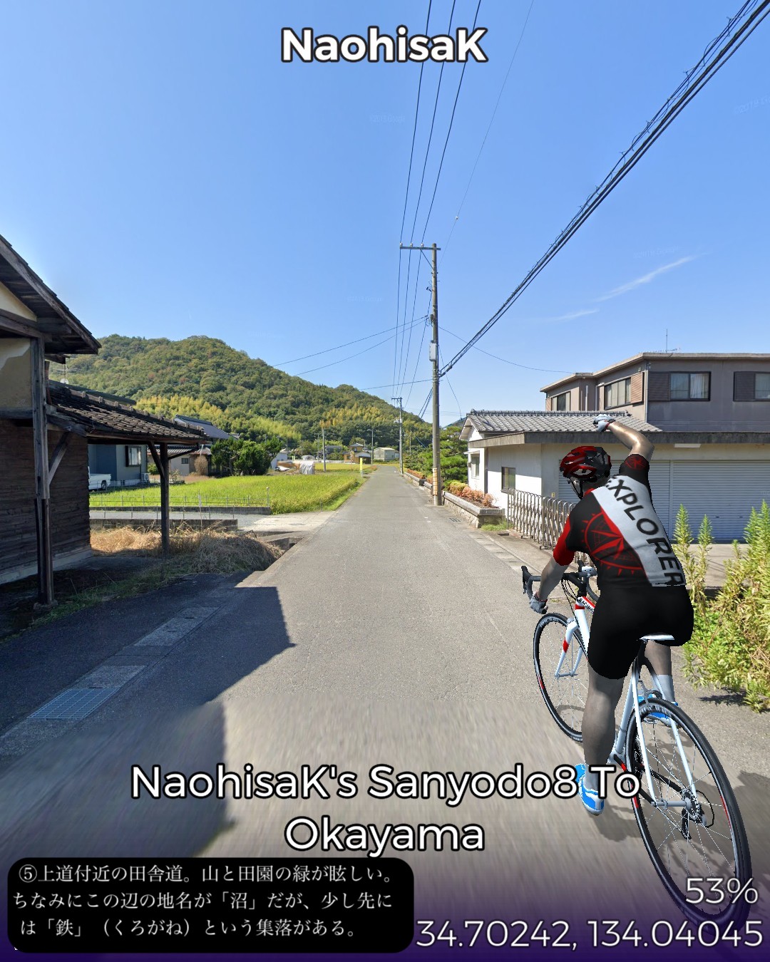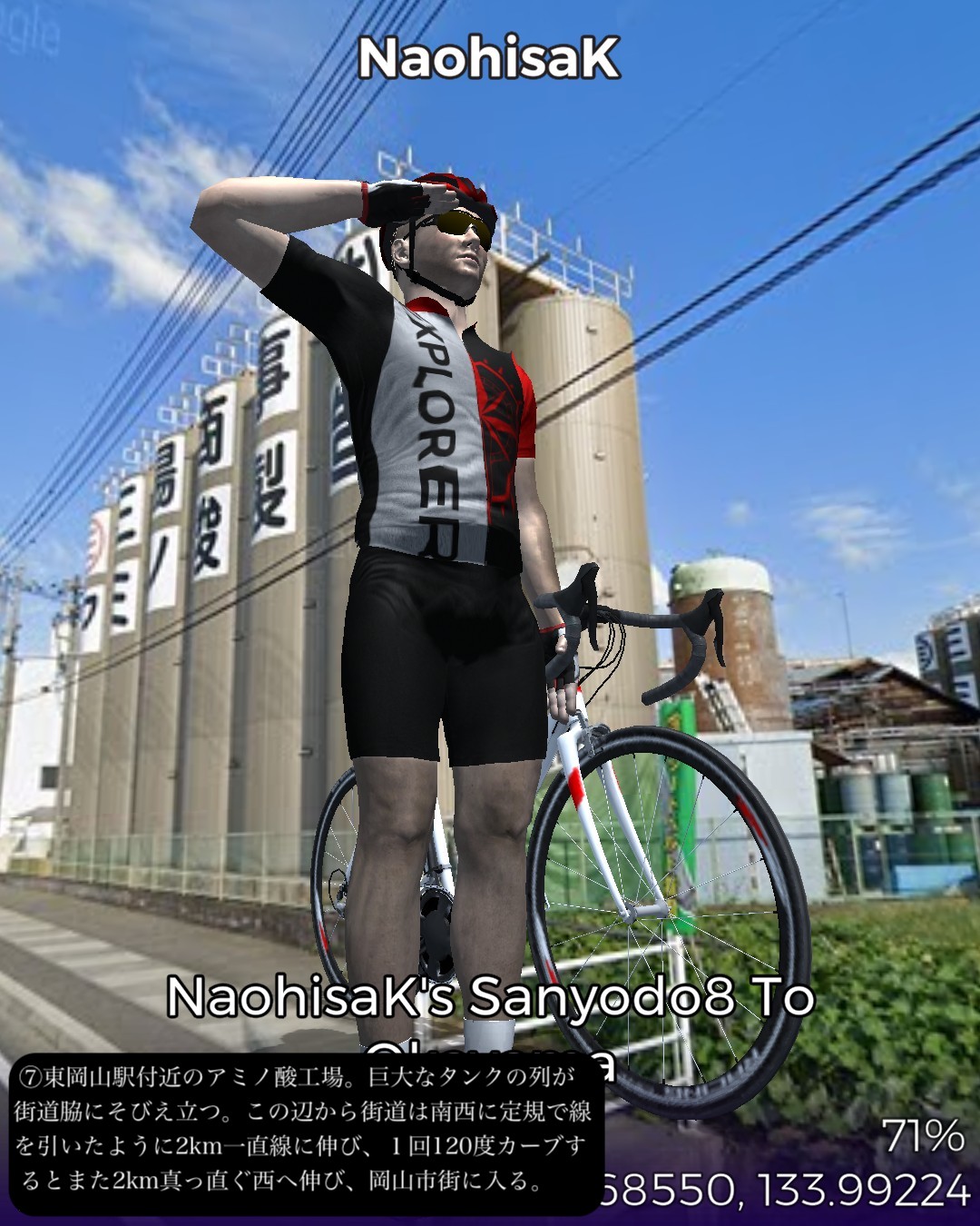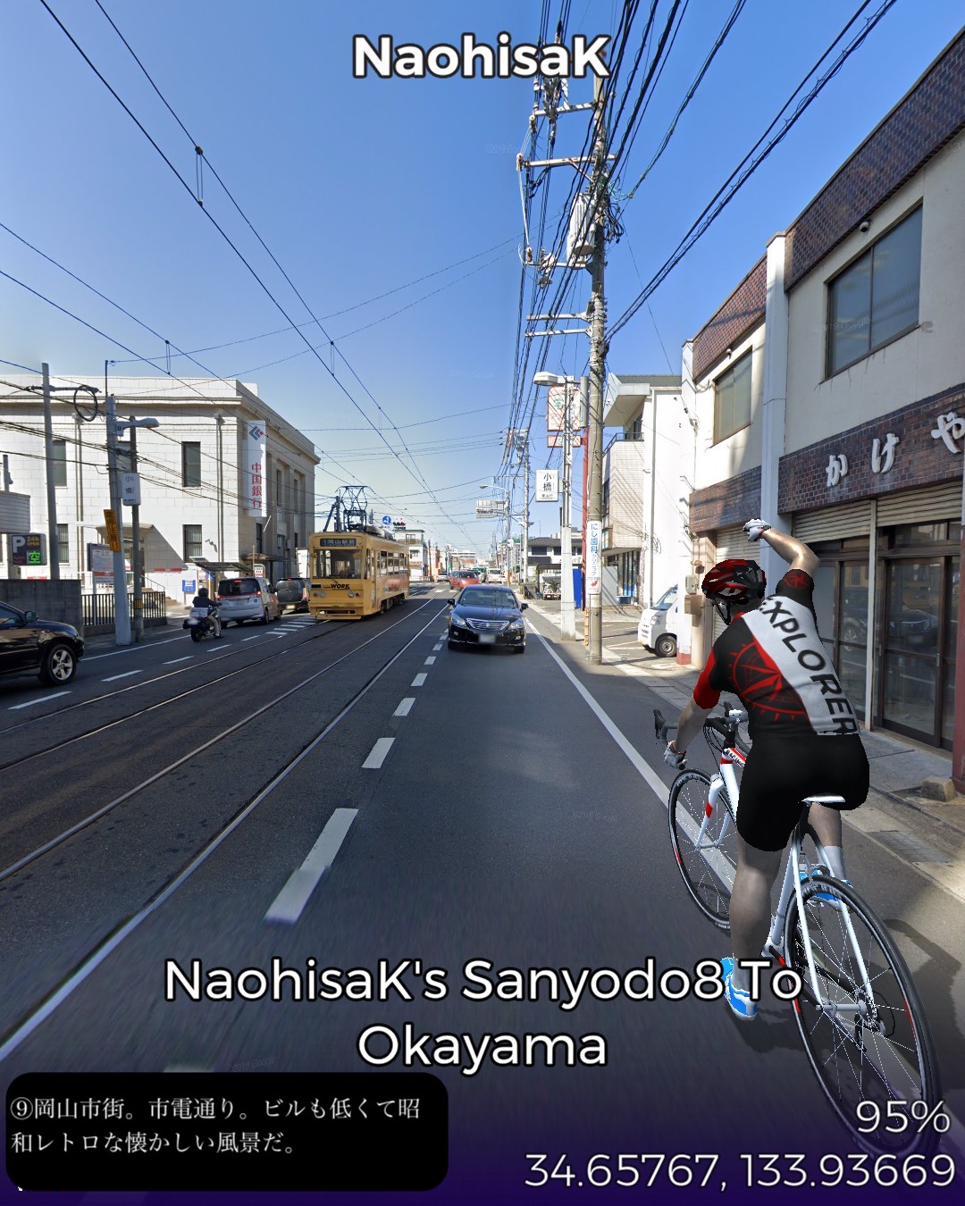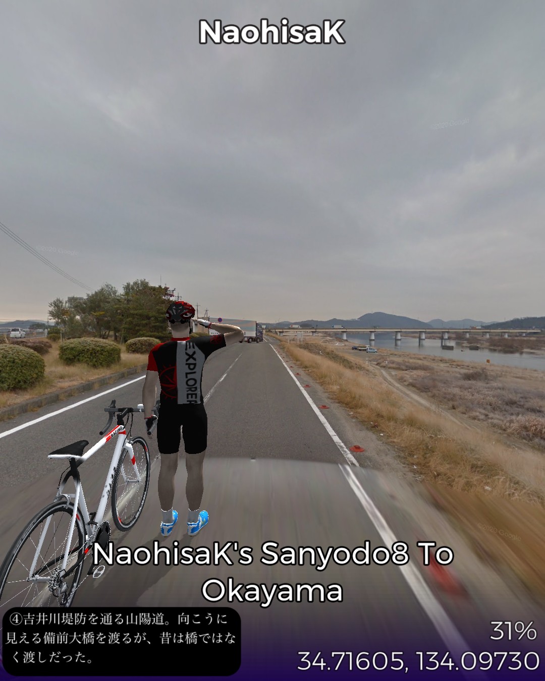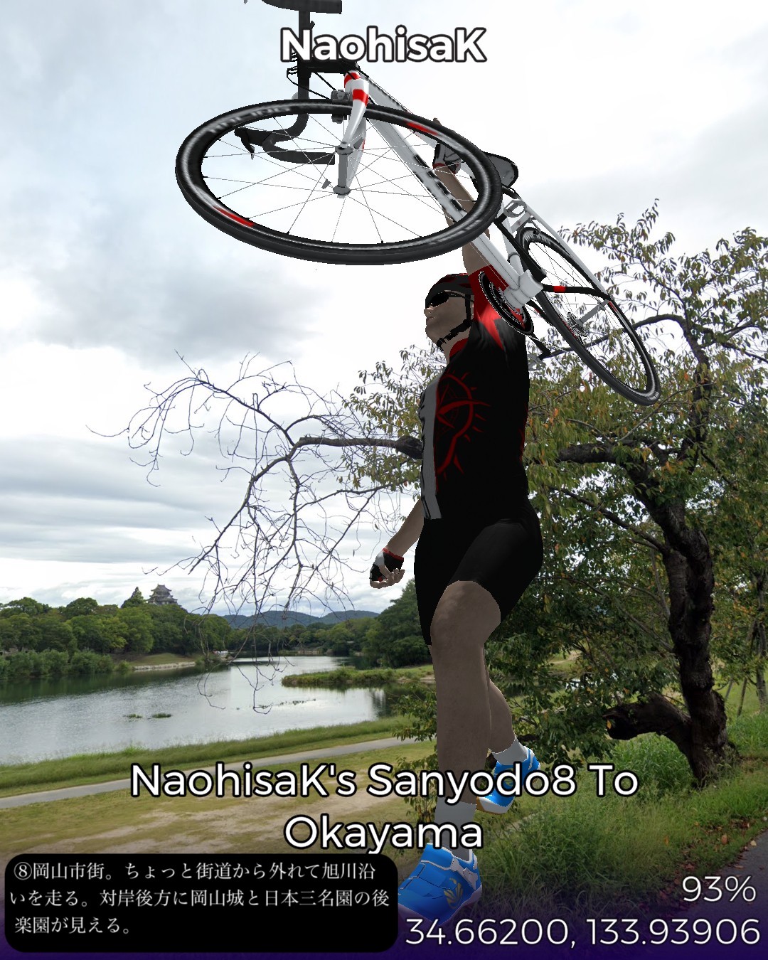 VRサイクリング、山陽道8日目は備前市片山宿をスタートし、藤井宿を経て、いよいよ岡山市街中心部に位置する岡山宿までの29kmの長丁場。実は今回リアルにはまとまった時間が取れず、昨日の夜と本日昼間の2回に分けてバイクを漕いだ。このパターンもありだね。備前焼については前日のルートでも触れたが、今日のルートで備前市内の片山宿の隣町伊部が備前焼の中心地であることが分かった。そう言えば伊部焼という別名も聞いたことがある。街道は備前焼の窯や陶器・陶芸の店が並ぶ伊部の町を通り抜ける。その後、古い商家が点在する香登の町並みも抜けて大河吉井川を渡る。その先の鄙びた田園風景もなかなか良い。さらにこれもまた鄙びた宿場、藤井宿を経て、久々の大都会岡山に至る。岡山ではちょっと街道から離れて、岡山のシンボル岡山城と後楽園を川越しに望んでから岡山の洒落たショッピングストリート、オランダ通りとなっている街道を進み、岡山宿中心部と思しき本日のゴール地点に到達した。