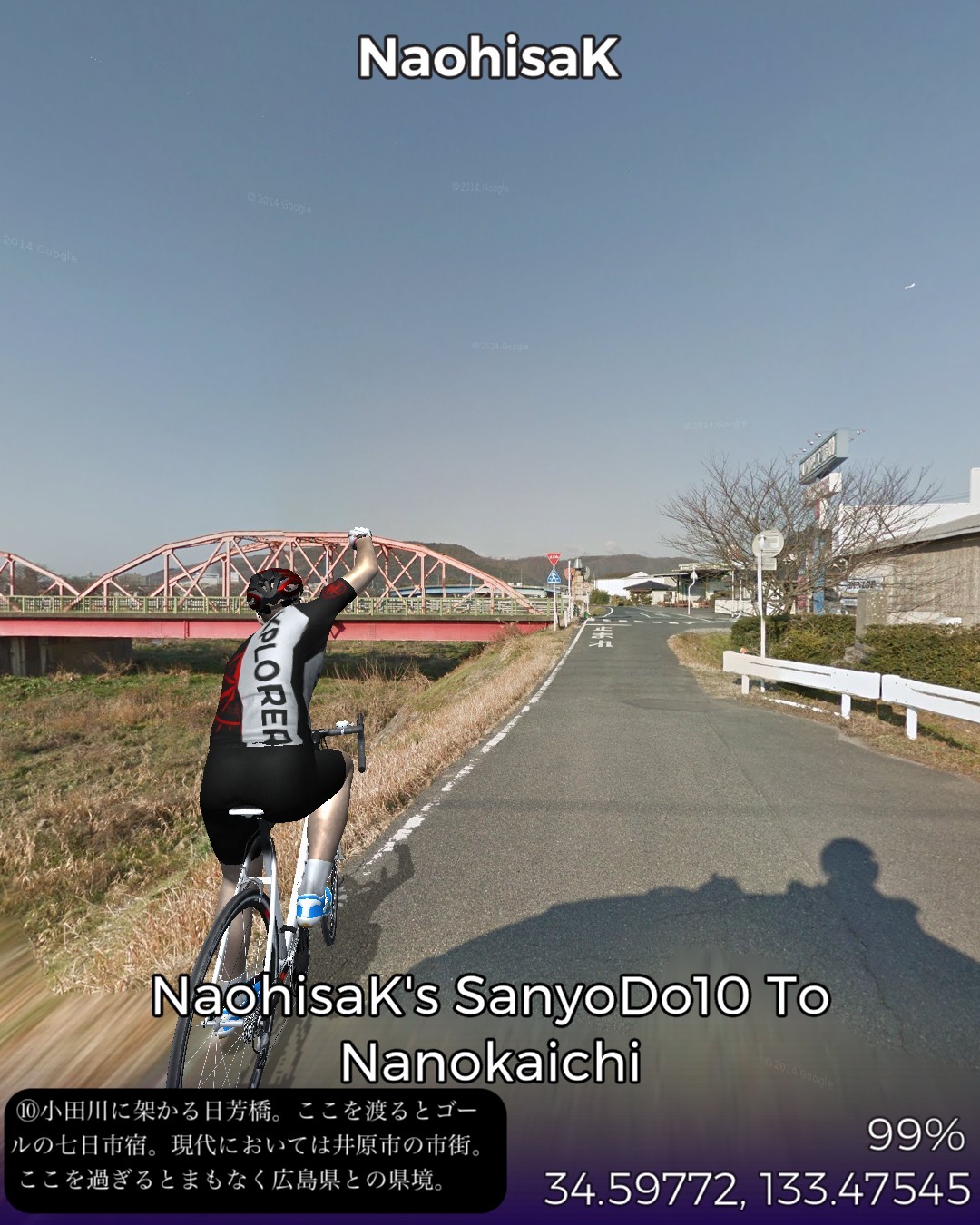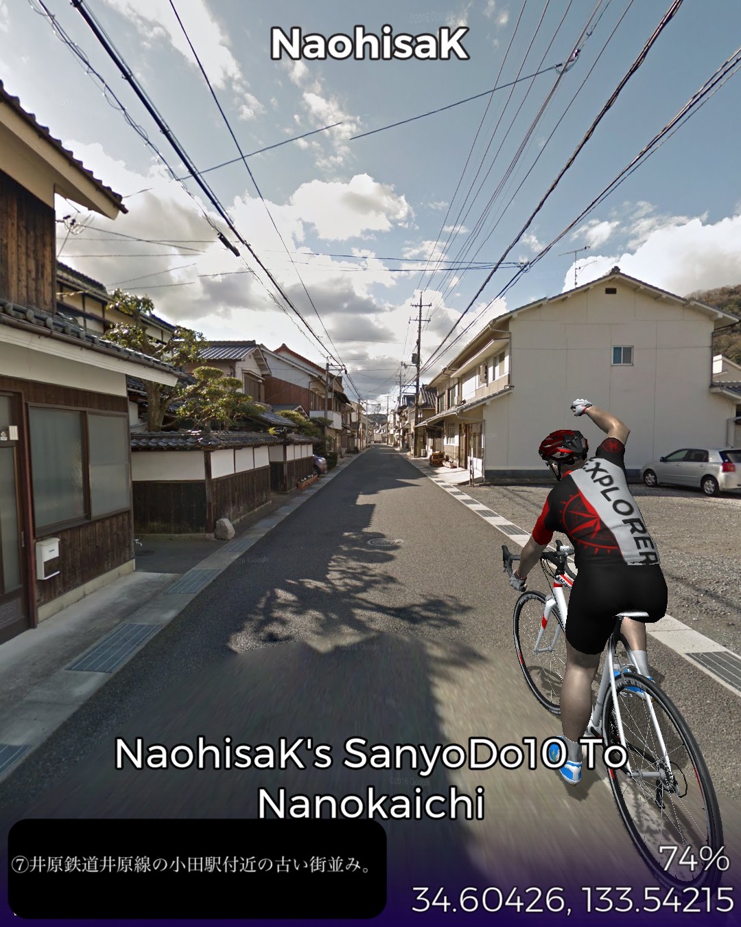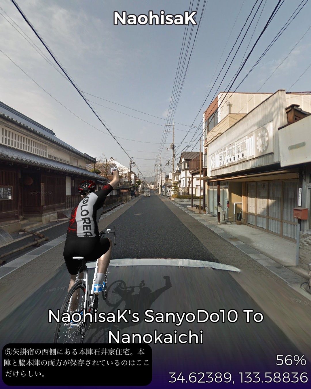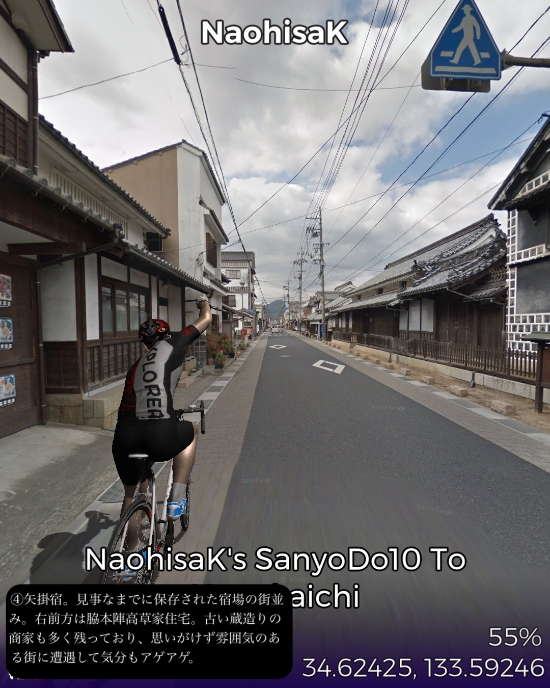 VRサイクリング、山陽道10日目。古代の偉人吉備真備に由来する真備町の川辺宿から井原市に位置する七日宿までの28kmの行程を一気に走り抜けた。真備町は記憶に新しい2018年の西日本豪雨の最大の被災地の1つ。前日に渡ったばかりの大河高梁川とその支流小田川に囲まれた広く田園の広がる土地柄だが、これらの川が8箇所で決壊してこの地域全域が広く洪水に見舞われ52人の死者を出した場所だ。VRで観ている映像のストリートビューは2019年の撮影によるものらしいので1年ほど経過した時点で復興商店街などの災害の傷痕が見られた。2021年現在はどうなっているのだろうか。本日のルートはその氾濫した小田川と井原鉄道井原線に沿って西進する道筋。途中の宿場、矢掛宿は思いがけず昔の宿場の街並みが究極に保存された町だった。本陣と脇本陣の両方が昔の佇まいで残る全国で唯一の宿場町らしい。ゴールの七日市宿は岡山県の西端の町井原市街にある。岡山県はほぼ3日で東端から西端まで走破したことになる。いいペースだ。いよいよ次回は広島県に入る。