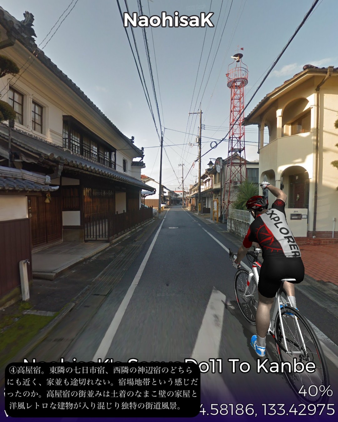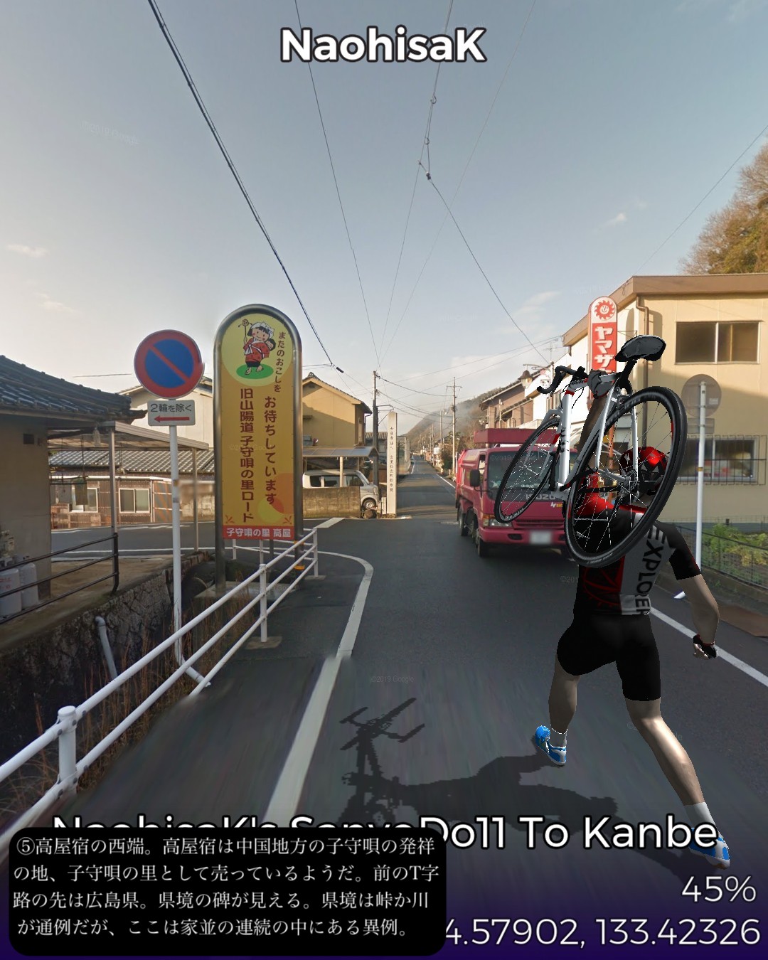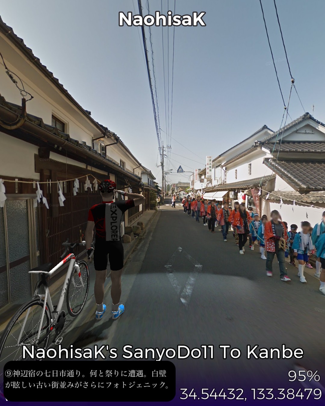 VRサイクリング、山陽道11日目は岡山県西端の井原市の七日市宿から、いよいよ広島県に乱入し、福山市の神辺宿までの12km。久々に短距離だがその間に高屋宿があり、街道沿いの古い家並がほぼ途切れない。山間から海の近くまで出てきて、その間に県境もあるが峠越えや川越えがあるわけではなく県境は家並の合間にある。多分この3つの宿場は繋がった1つの宿場地帯と見なされていたと想像する。高屋宿は土着のなまこ壁の建物と明治以降の洋風レトロな建物が入り混じる不思議な雰囲気を醸し出す街道筋。「ねんねこしゃっしゃりま〜せ」の中国地方の子守唄を世に広めた「上野耐之」出身地ということで子守唄の里で売っているようだ。近くの井原線の駅名も「子守歌の里高屋駅」となっている。ゴールの神辺宿ではストリートビューでは超珍しく「祭り」の現場に遭遇した。神辺宿は白い壁の街並みが美しい雰囲気のいい町。名酒を生む酒蔵もある。さていよいよ広島県。次は尾道へ向かう。