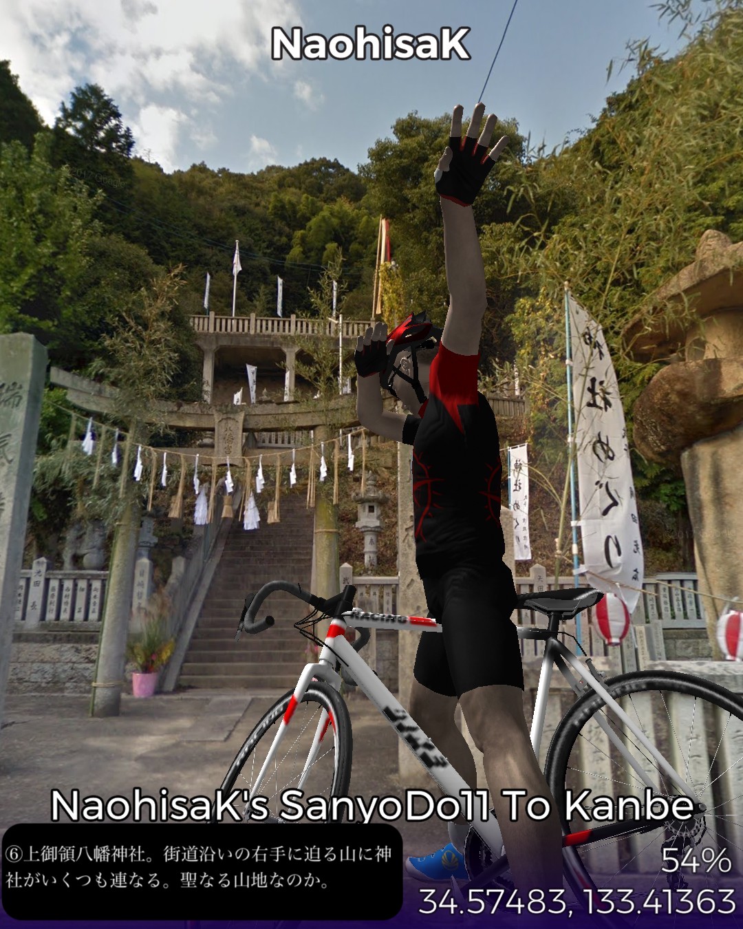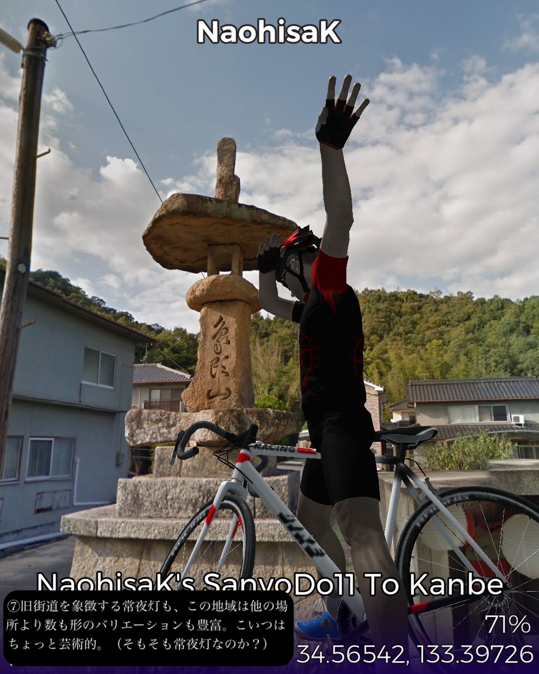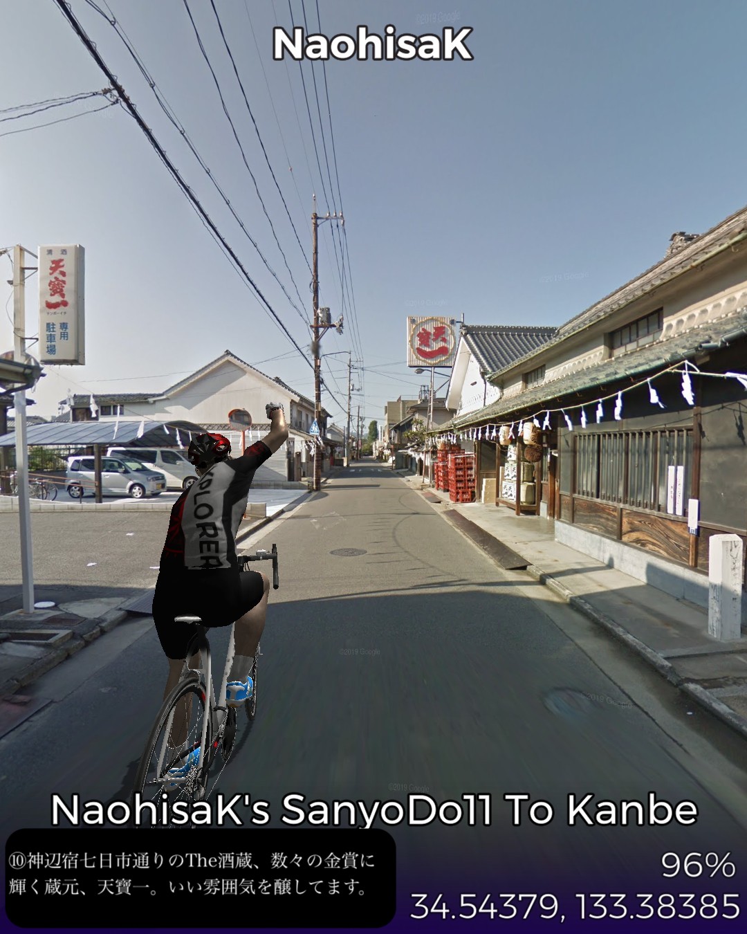 VRサイクリング、山陽道11日目は岡山県西端の井原市の七日市宿から、いよいよ広島県に乱入し、福山市の神辺宿までの12km。久々に短距離だがその間に高屋宿があり、街道沿いの古い家並がほぼ途切れない。山間から海の近くまで出てきて、その間に県境もあるが峠越えや川越えがあるわけではなく県境は家並の合間にある。多分この3つの宿場は繋がった1つの宿場地帯と見なされていたと想像する。高屋宿は土着のなまこ壁の建物と明治以降の洋風レトロな建物が入り混じる不思議な雰囲気を醸し出す街道筋。「ねんねこしゃっしゃりま〜せ」の中国地方の子守唄を世に広めた「上野耐之」出身地ということで子守唄の里で売っているようだ。近くの井原線の駅名も「子守歌の里高屋駅」となっている。ゴールの神辺宿ではストリートビューでは超珍しく「祭り」の現場に遭遇した。神辺宿は白い壁の街並みが美しい雰囲気のいい町。名酒を生む酒蔵もある。さていよいよ広島県。次は尾道へ向かう。