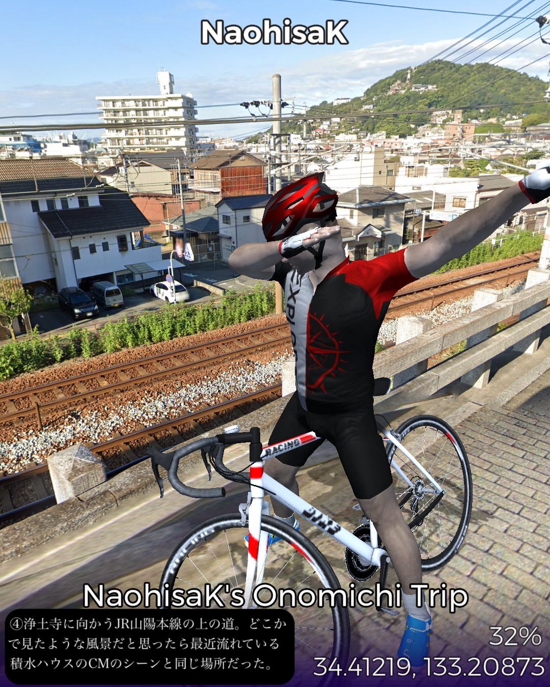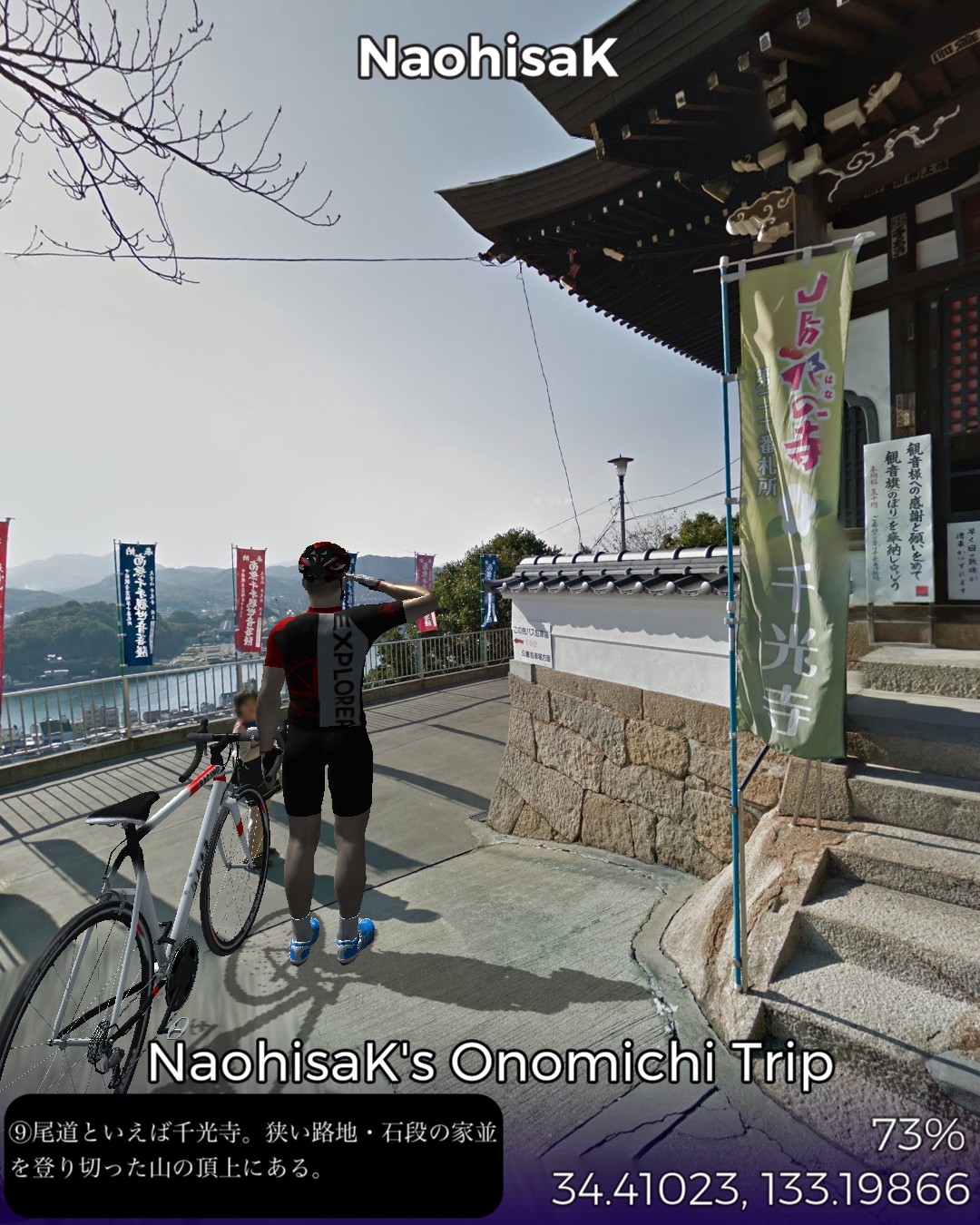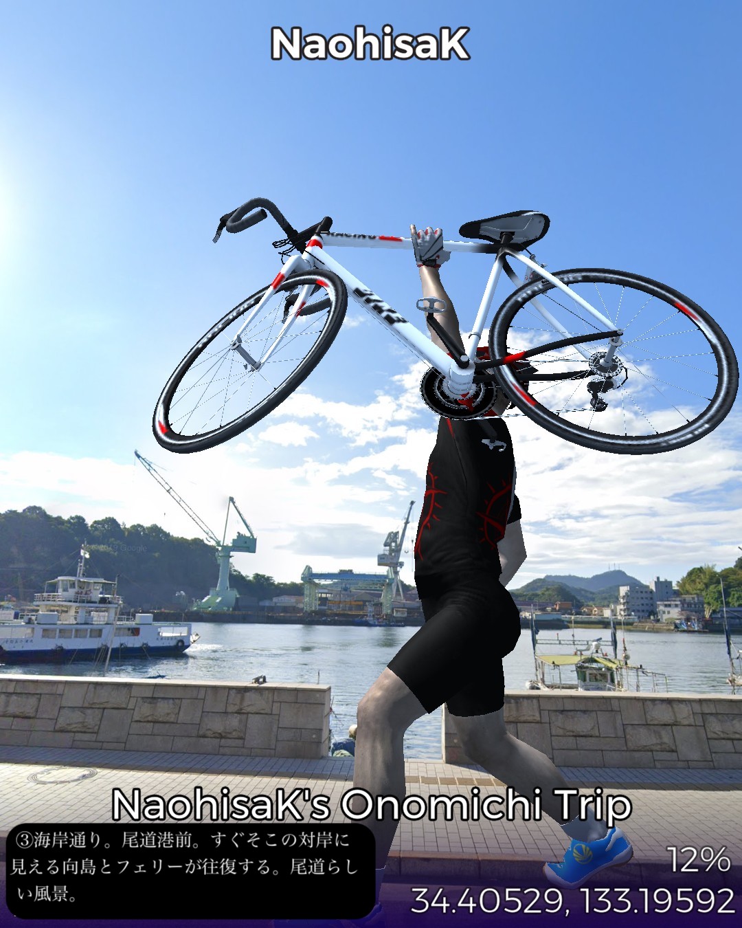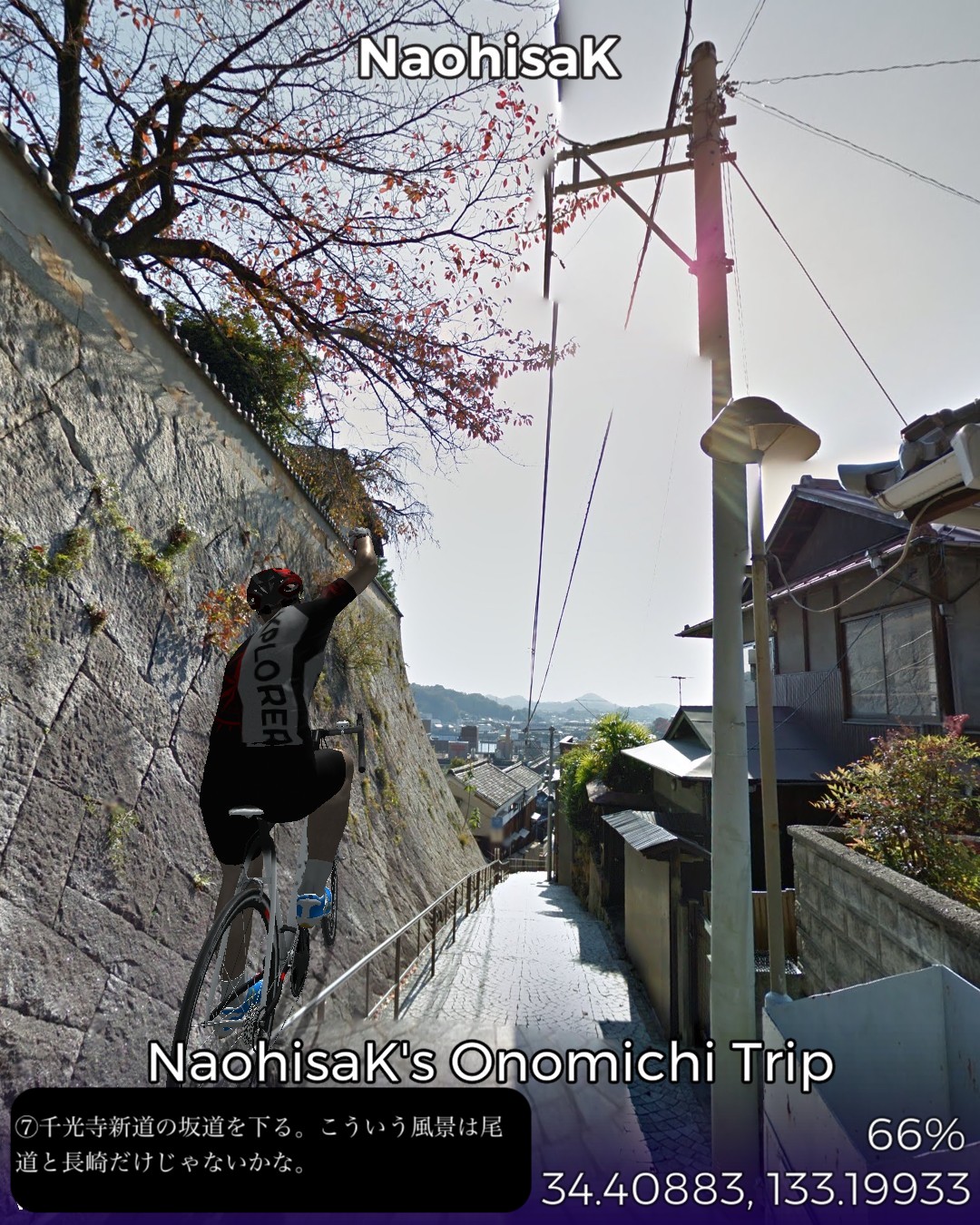 VRサイクリング@尾道滞在中。お気に入りの尾道で旅の疲れを癒してます。(笑)魅力の街、尾道を一巡り探訪してみました。やはり絵になる街ですね。どこを切り取ってもフォトジェニック。山があって海があって完璧にレトロな家並と寺社がある歴史ある町。「完璧にレトロ」という点は特筆ものです。建て替えて超モダンになってしまった駅の近辺を除くと、見事にレトロなビジュアルで統一されています。田中角栄の日本列島大改造以降どんな町も醜悪な近代化が進んでしまった日本の中でこんな町が他にあるでしょうか。海に向かって南向きの斜面なので陽光の量が半端なく明るい町という点もこの街の魅力を構成していると思います。尾道の代表的な景色と言えばやはり坂道を登った山の上にある千光寺からの眼下に広がる尾道市街と尾道水道の絶景ですね。何度観ても飽きることはありません。さて疲れが取れたところで山陽道の旅を西に向けて進むとしましょう。