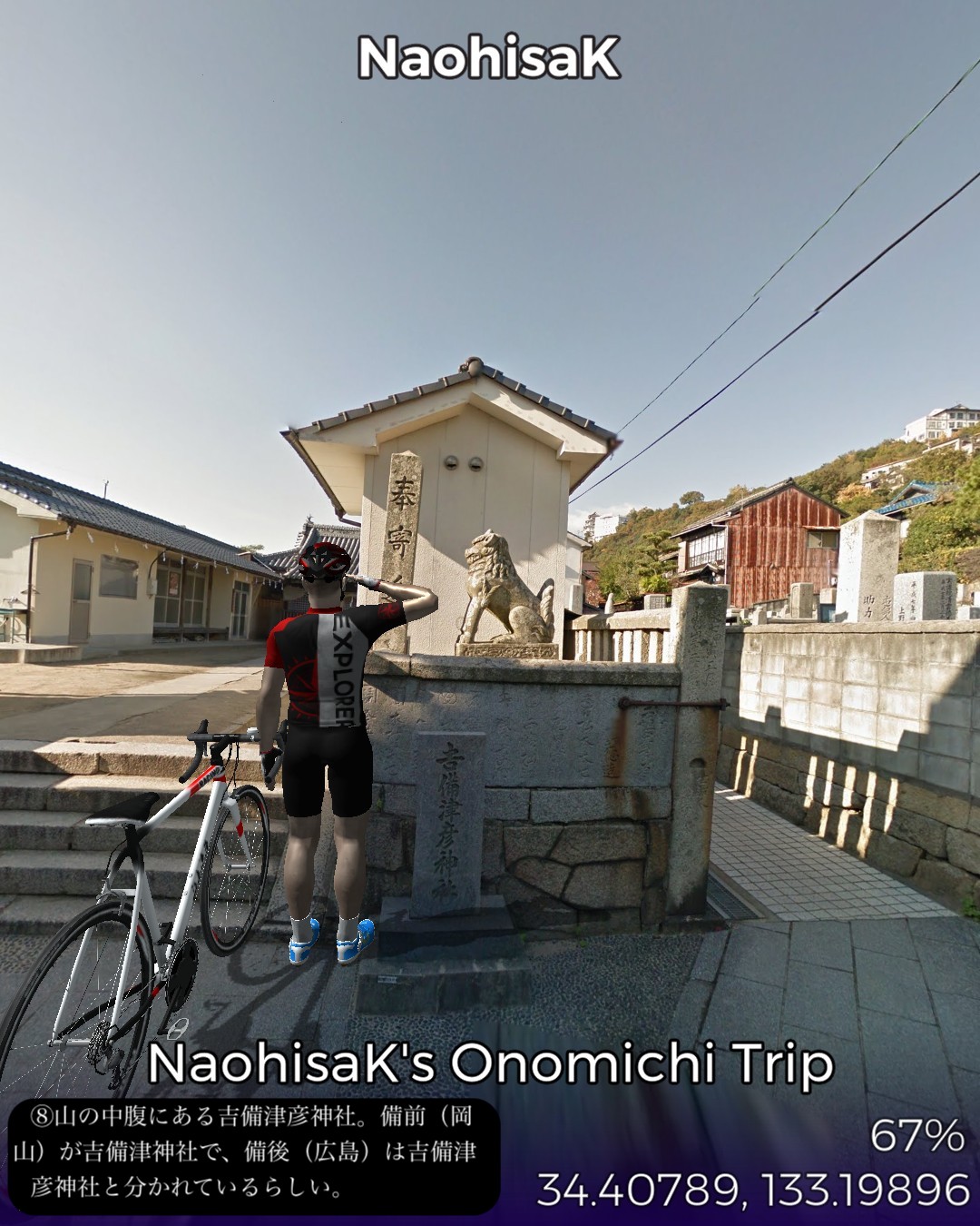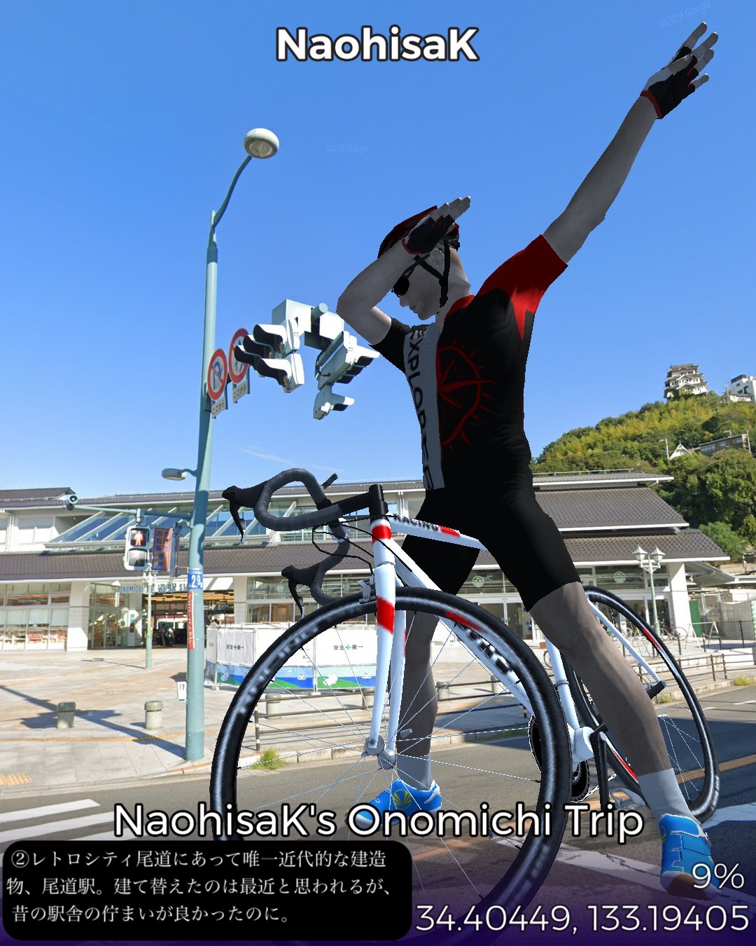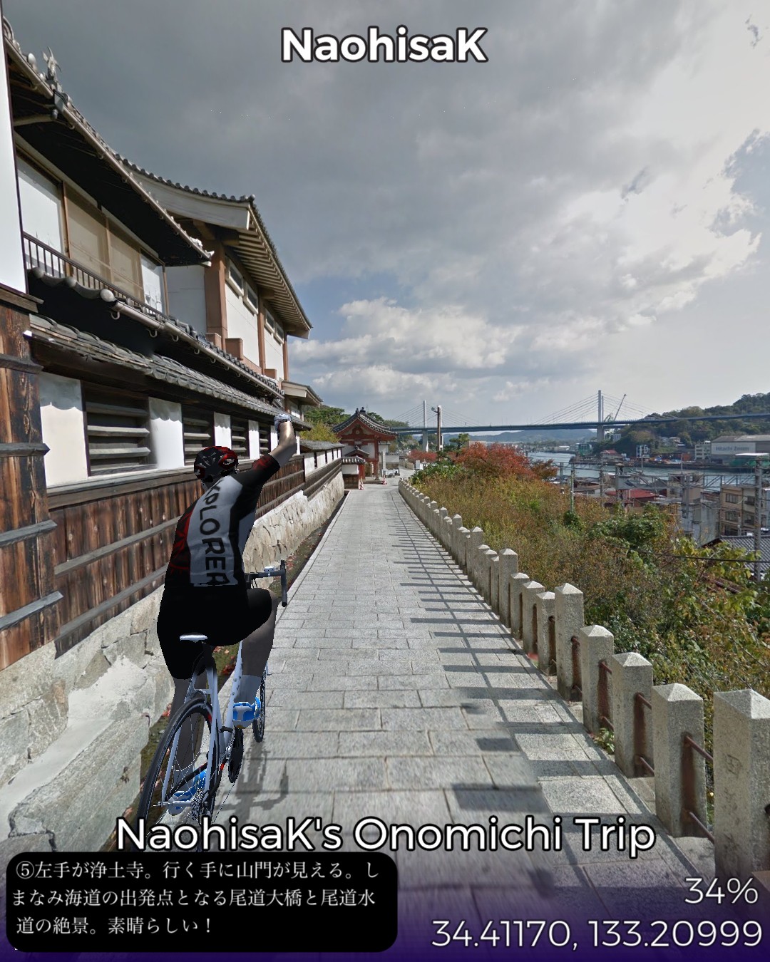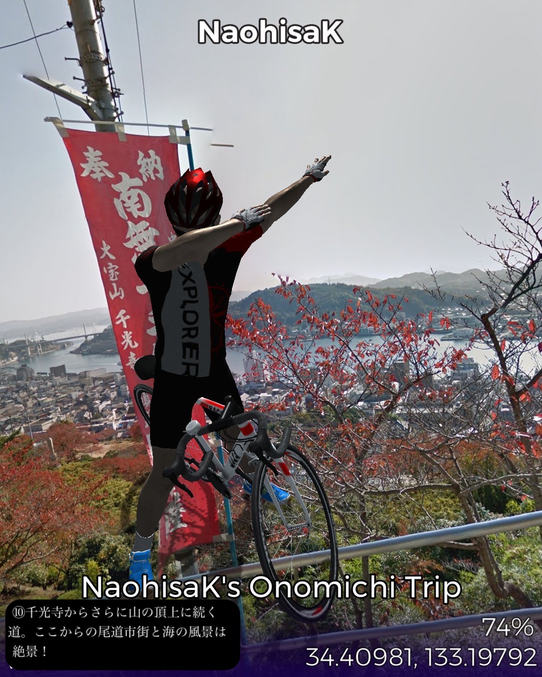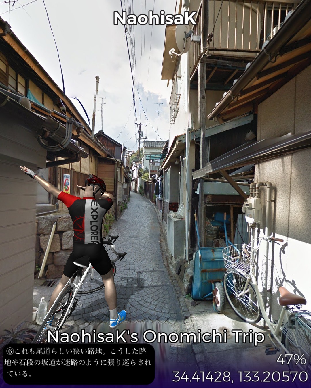 VRサイクリング@尾道滞在中。お気に入りの尾道で旅の疲れを癒してます。(笑)魅力の街、尾道を一巡り探訪してみました。やはり絵になる街ですね。どこを切り取ってもフォトジェニック。山があって海があって完璧にレトロな家並と寺社がある歴史ある町。「完璧にレトロ」という点は特筆ものです。建て替えて超モダンになってしまった駅の近辺を除くと、見事にレトロなビジュアルで統一されています。田中角栄の日本列島大改造以降どんな町も醜悪な近代化が進んでしまった日本の中でこんな町が他にあるでしょうか。海に向かって南向きの斜面なので陽光の量が半端なく明るい町という点もこの街の魅力を構成していると思います。尾道の代表的な景色と言えばやはり坂道を登った山の上にある千光寺からの眼下に広がる尾道市街と尾道水道の絶景ですね。何度観ても飽きることはありません。さて疲れが取れたところで山陽道の旅を西に向けて進むとしましょう。