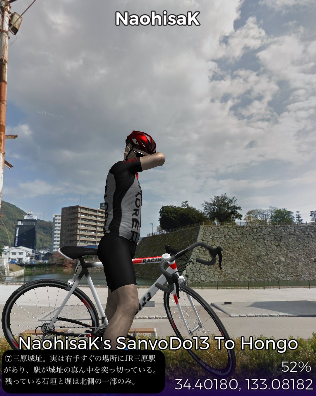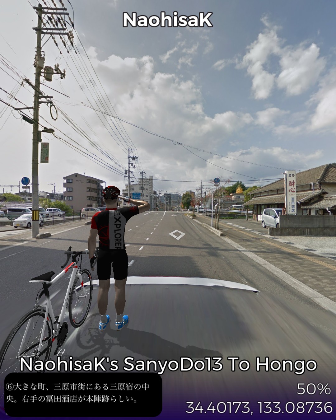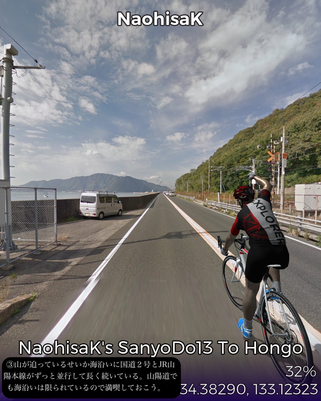 VRサイクリング、山陽道13日目。尾道で旅の垢を落として、さらに西へむかう。今日の行程は三原宿、本郷宿と宿場2コマ分距離にして24km。レトロシティ尾道は西に向かう途中もレトロな街並みがキープされていた。その後、三原の手前糸崎まで山が海岸に迫り自然と海岸沿いにJR山陽本線と並行した国道2号線を走る羽目になるが、ここからの島々を望む海の景色はまさに瀬戸内海。今までで一番素晴らしい海岸風景だ。三原は毛利元就の三男坊、つまり3本の矢の一人で小早川家の養子になった戦国武将、小早川隆景が開いた町で、海に浮かぶ城と呼ばれた三原城の城址が残っている。地図で見るとよくわかるが確かに海岸の近くだが現在残っているのは北側の石垣と堀だけで、JR山陽本線の三原駅が城址の真上に造られている。本日のゴールの本郷宿は、三原から沼田川沿いに上流に向かったところにある。小早川家の発祥の地で、本郷宿の北側の凸凹した特徴的な山並みの山中にある高山城が小早川隆景が三原に出てくるまで居城になっていたらしい。調べると小早川隆景は他家に養子にでながら毛利家に忠誠を尽くし、かつ武将としても大変優れた人だったらしい。そのうち大河ドラマで彼を扱ったらこの辺が舞台になるのだろうな。