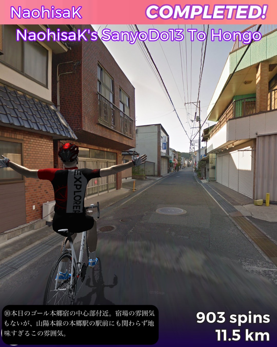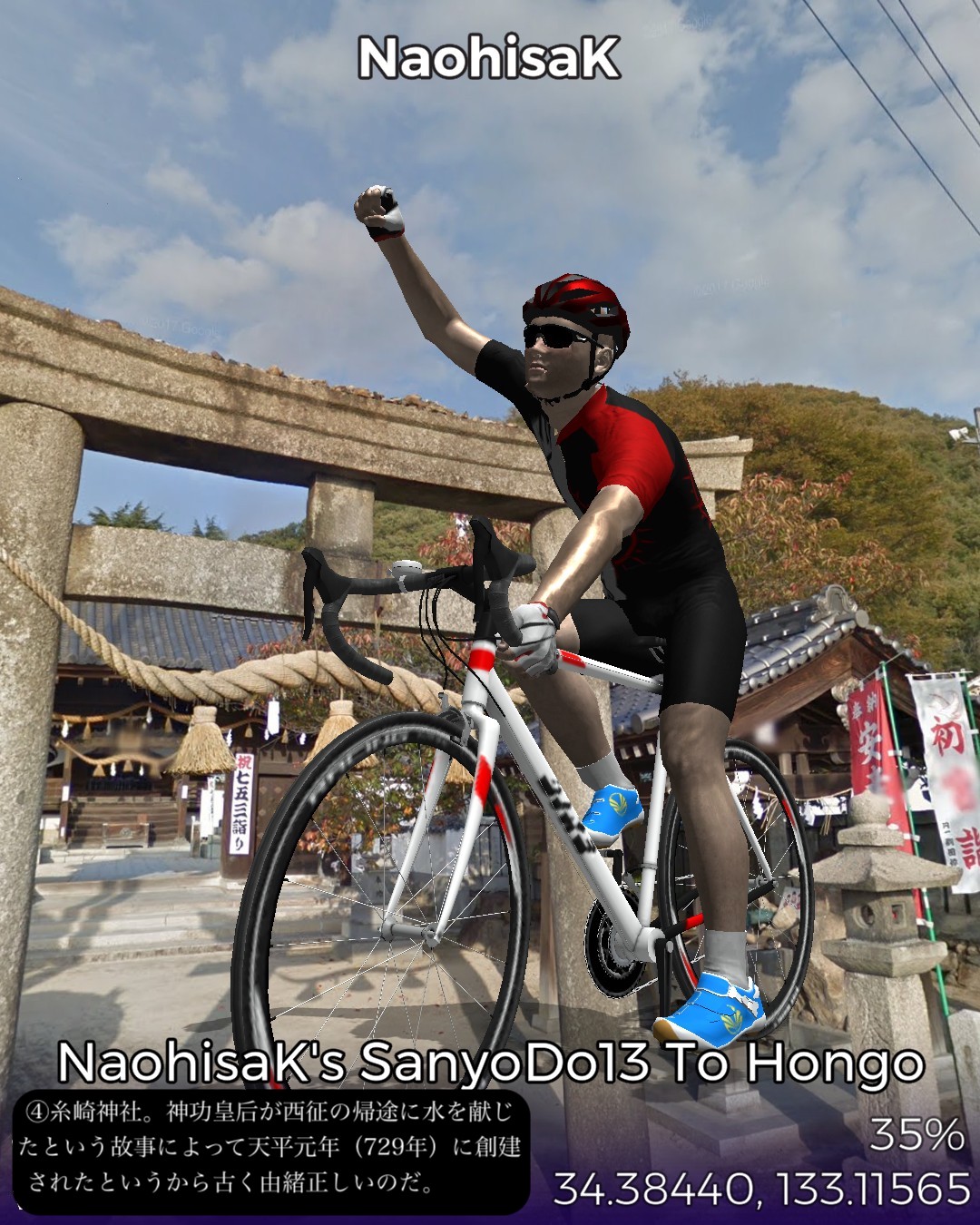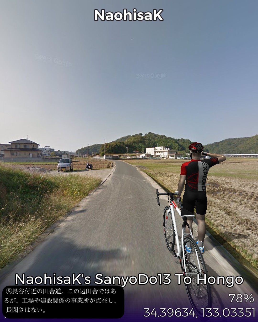 VRサイクリング、山陽道13日目。尾道で旅の垢を落として、さらに西へむかう。今日の行程は三原宿、本郷宿と宿場2コマ分距離にして24km。レトロシティ尾道は西に向かう途中もレトロな街並みがキープされていた。その後、三原の手前糸崎まで山が海岸に迫り自然と海岸沿いにJR山陽本線と並行した国道2号線を走る羽目になるが、ここからの島々を望む海の景色はまさに瀬戸内海。今までで一番素晴らしい海岸風景だ。三原は毛利元就の三男坊、つまり3本の矢の一人で小早川家の養子になった戦国武将、小早川隆景が開いた町で、海に浮かぶ城と呼ばれた三原城の城址が残っている。地図で見るとよくわかるが確かに海岸の近くだが現在残っているのは北側の石垣と堀だけで、JR山陽本線の三原駅が城址の真上に造られている。本日のゴールの本郷宿は、三原から沼田川沿いに上流に向かったところにある。小早川家の発祥の地で、本郷宿の北側の凸凹した特徴的な山並みの山中にある高山城が小早川隆景が三原に出てくるまで居城になっていたらしい。調べると小早川隆景は他家に養子にでながら毛利家に忠誠を尽くし、かつ武将としても大変優れた人だったらしい。そのうち大河ドラマで彼を扱ったらこの辺が舞台になるのだろうな。