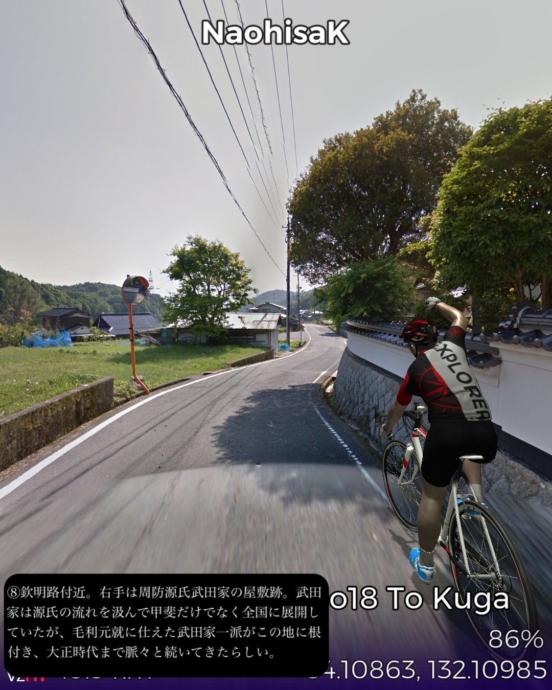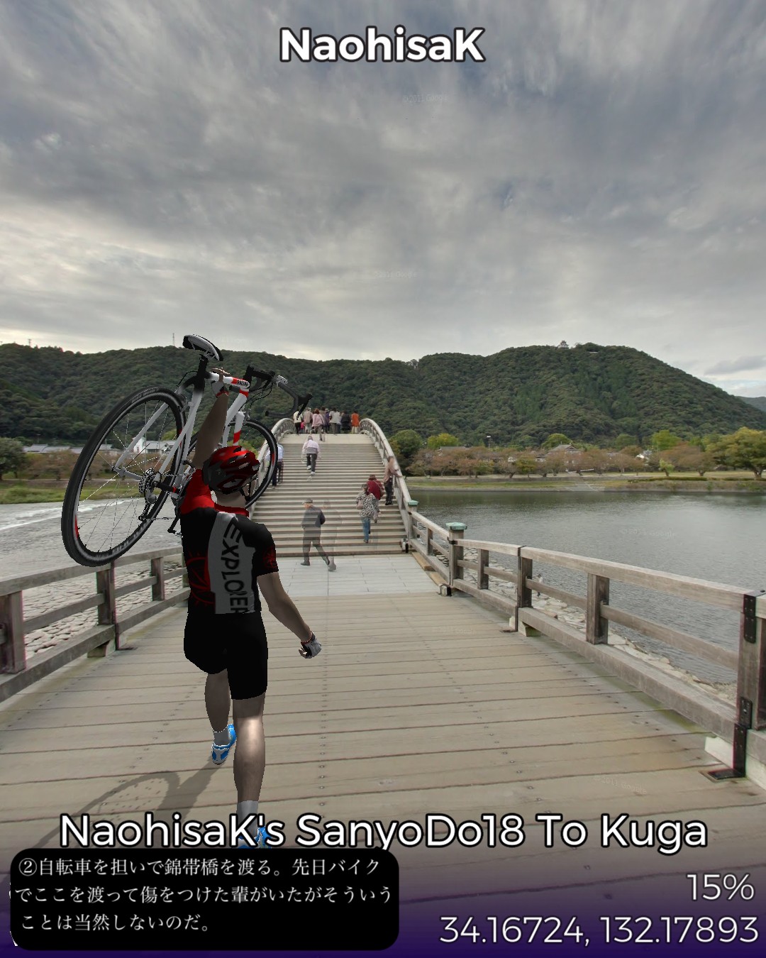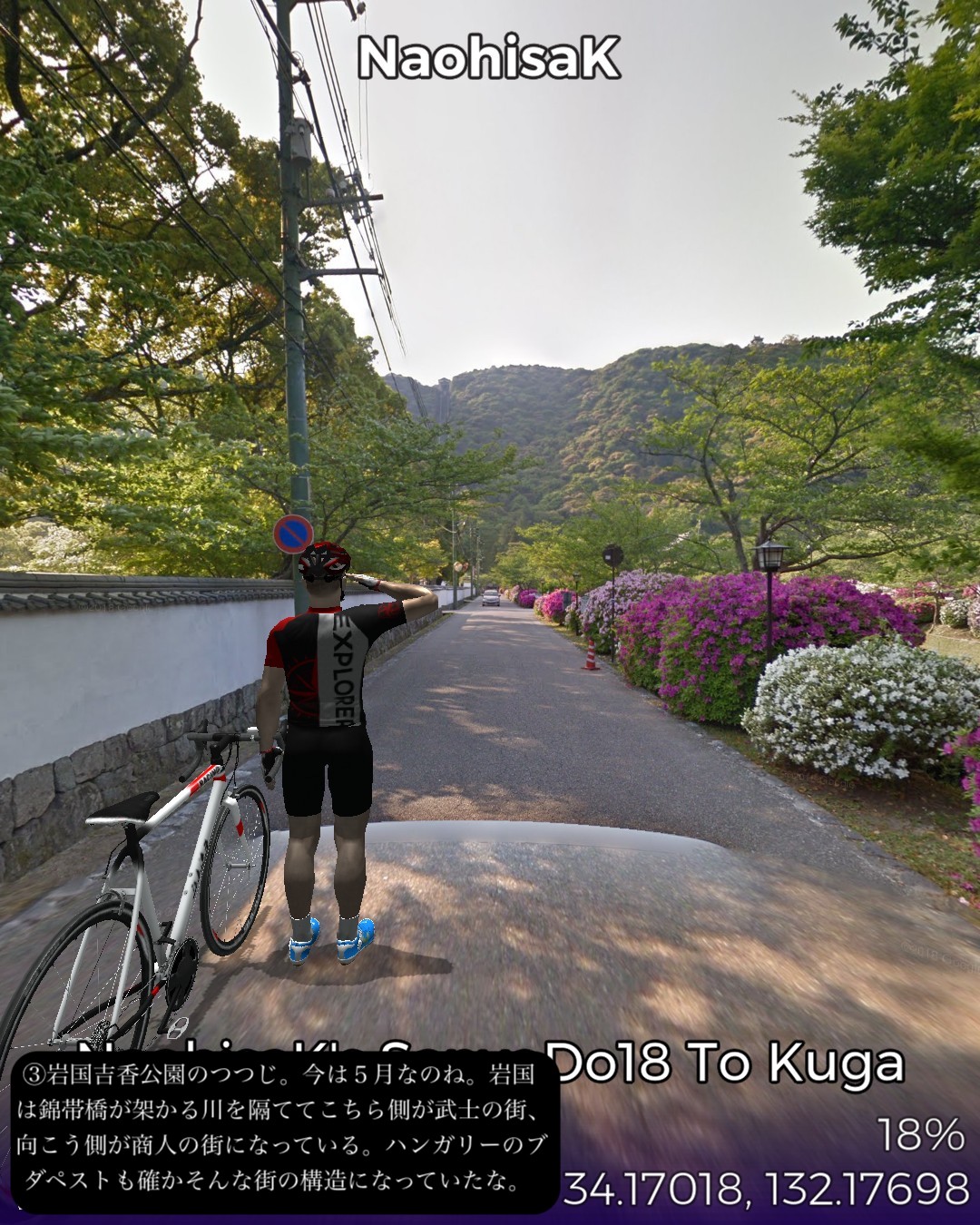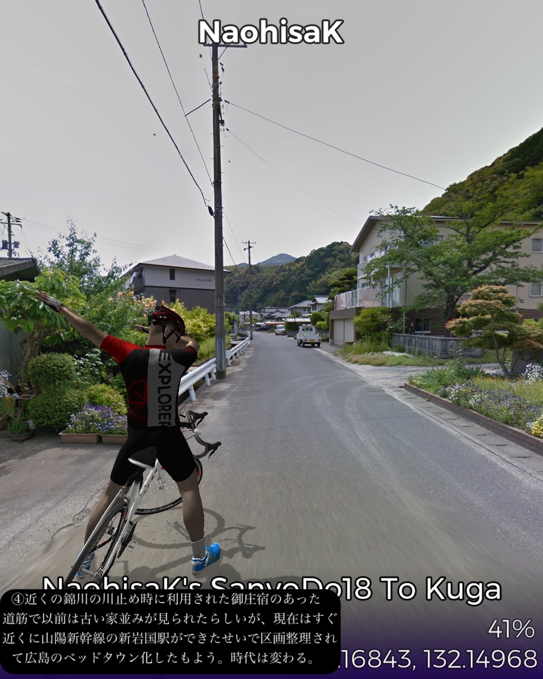 VRサイクリング 、山陽道18日目。岩国市の関戸宿から山陽道最後の山口県を横断するべくさらに西へ向かい玖珂宿までの23kmの行程。まず山陽道の街道筋から外れて、岩国旧市街と錦帯橋を観にかなりの寄り道。実は3年前に家族旅行で訪れたばかりの懐かしい風景。そして何度観ても錦帯橋のフォルムには惚れ惚れする。流されない橋を作るという先人の強い思いが作り上げた世界に類を見ない堅牢な建造物であり最高級の工芸品だ。山陽道に戻ってJR 岩徳線に沿ってさらに山に分け入ってゆく。峠を2つ超えて穏やかに田園が広がる盆地に出る。この間の山間の風景、田園風景は、田舎に入ると工場や廃棄場、工事現場で風景が汚されるパターンが多い山陽道の中で、自然美に溢れて思いがけず気持ちの良いサイクリングルートであった。