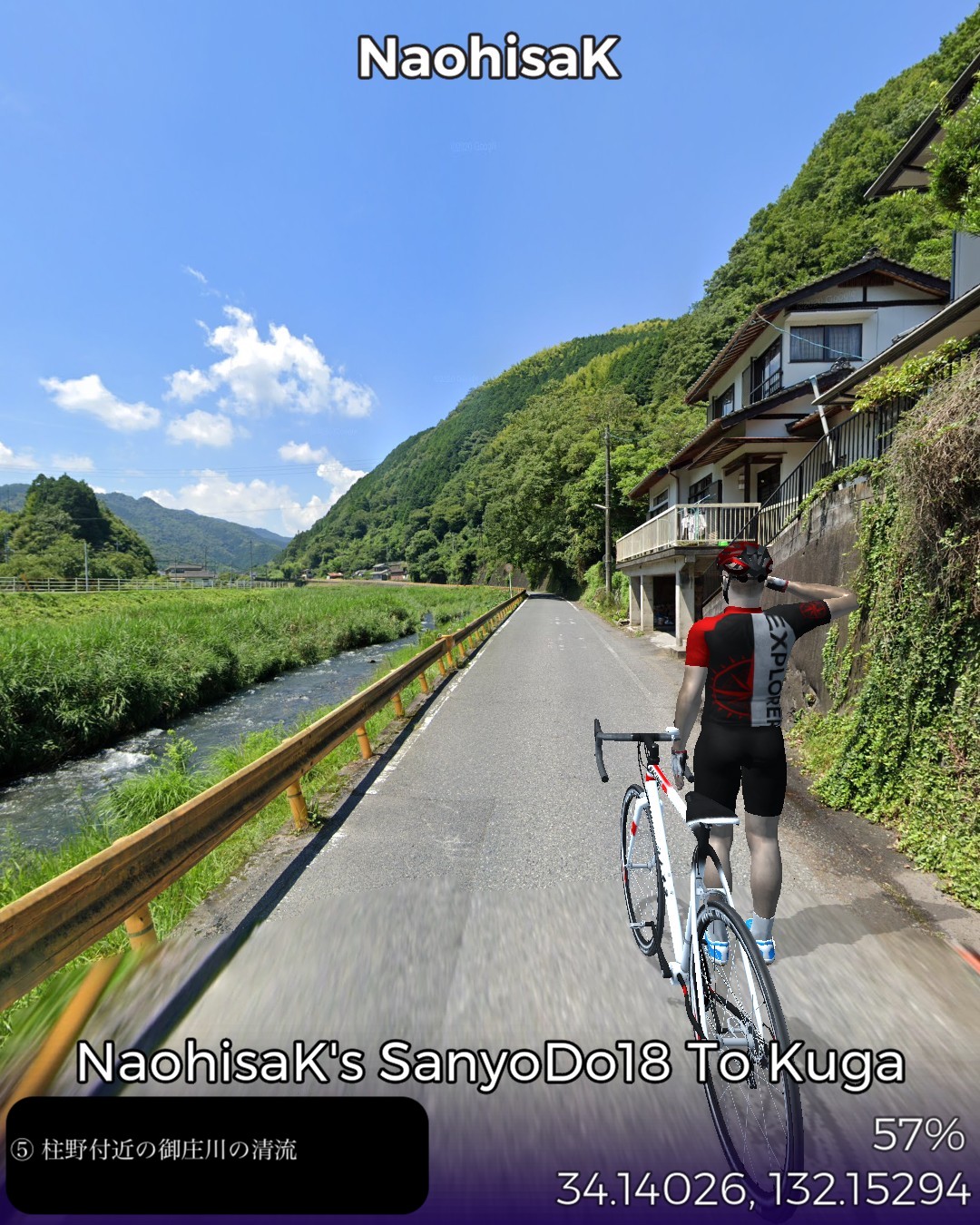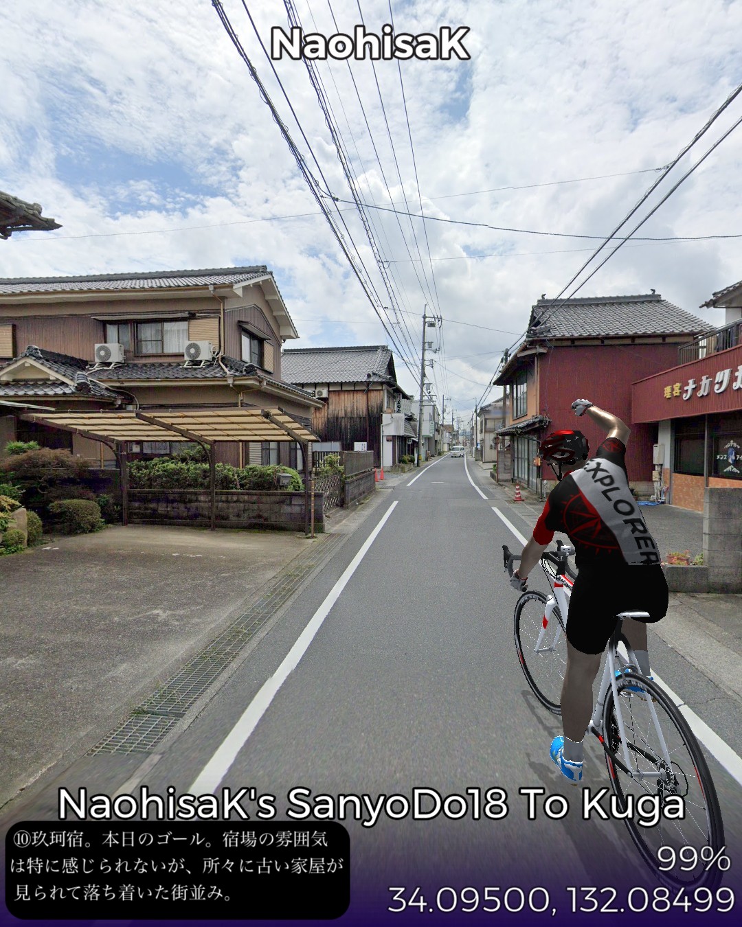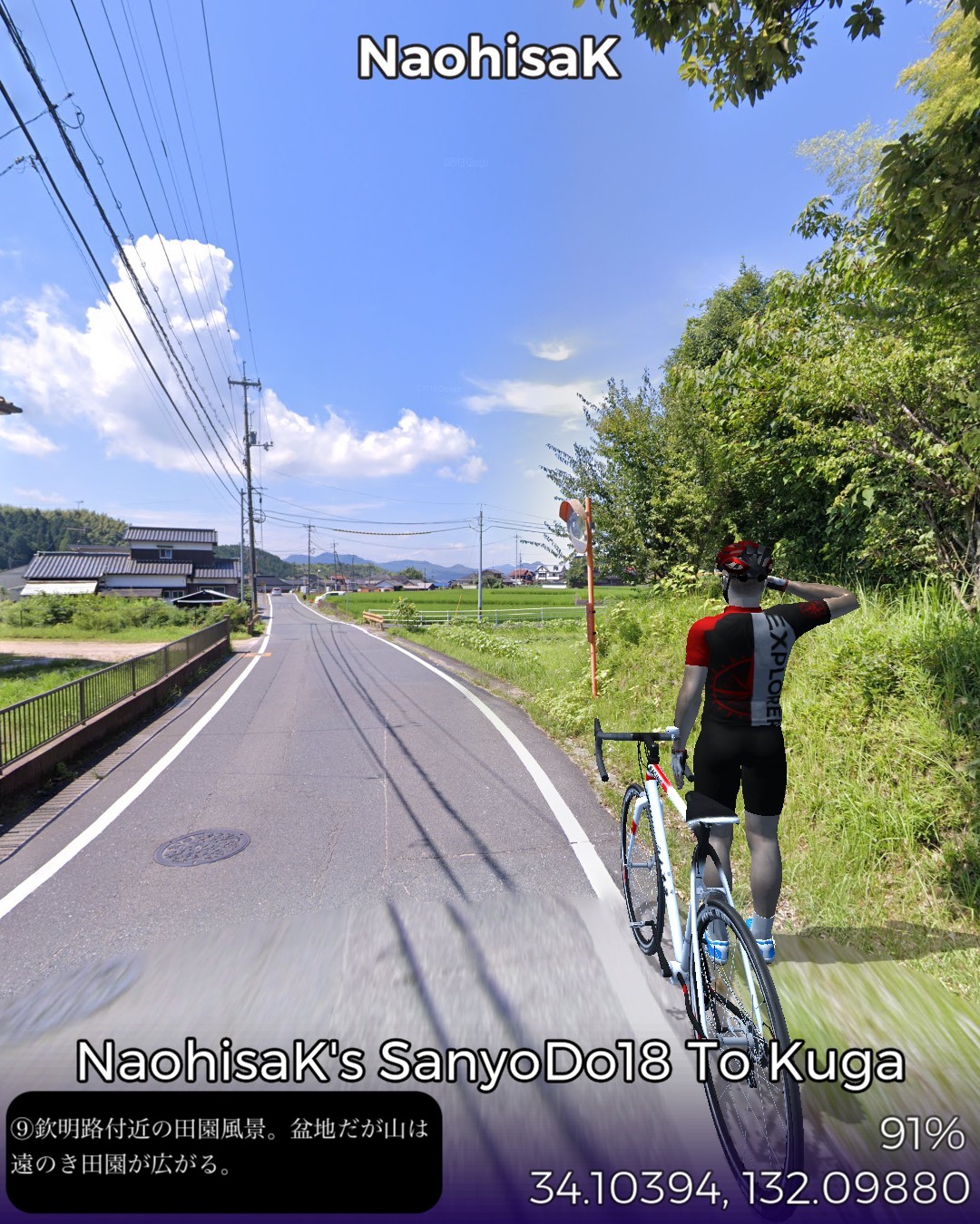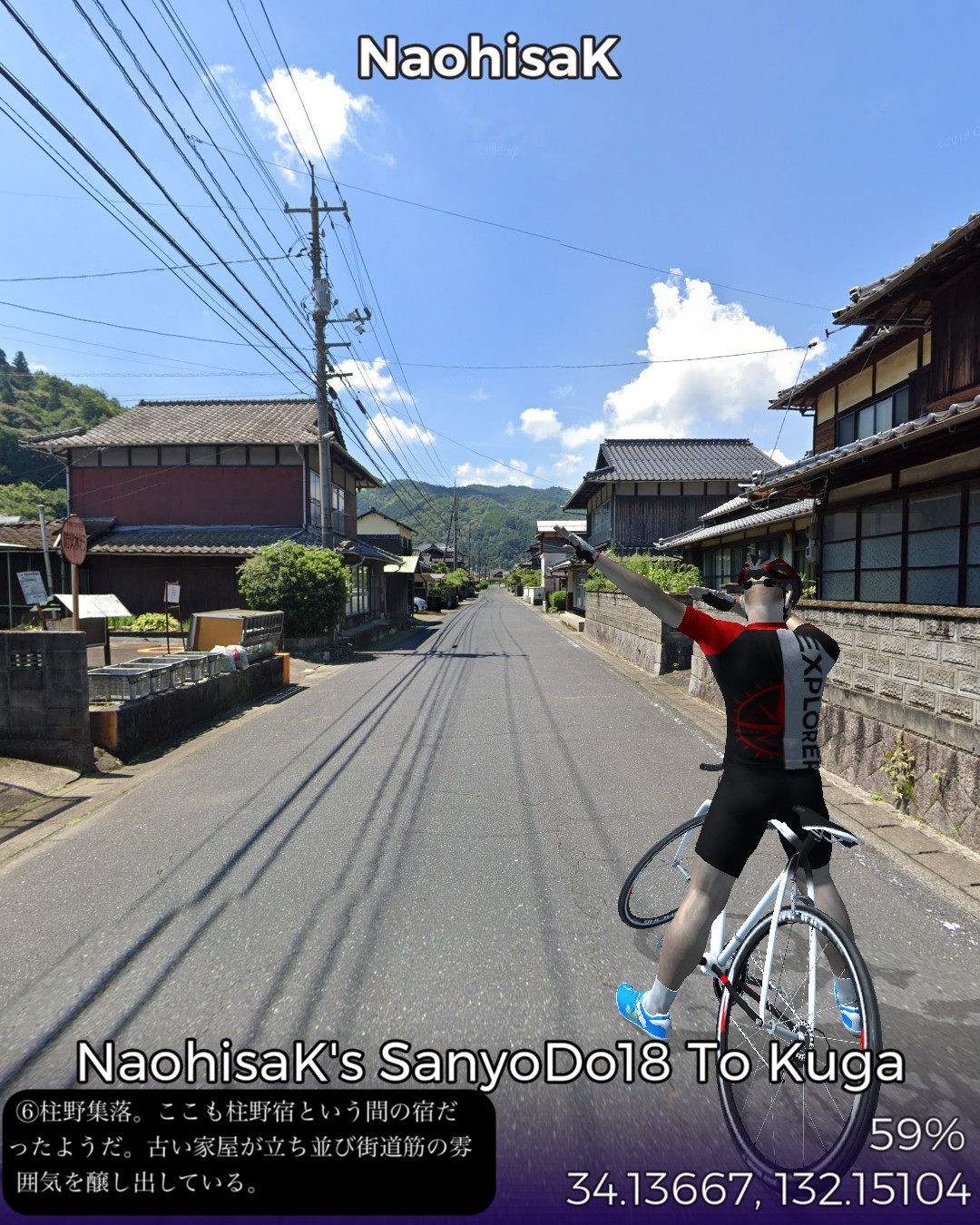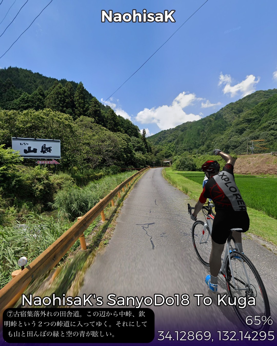 VRサイクリング 、山陽道18日目。岩国市の関戸宿から山陽道最後の山口県を横断するべくさらに西へ向かい玖珂宿までの23kmの行程。まず山陽道の街道筋から外れて、岩国旧市街と錦帯橋を観にかなりの寄り道。実は3年前に家族旅行で訪れたばかりの懐かしい風景。そして何度観ても錦帯橋のフォルムには惚れ惚れする。流されない橋を作るという先人の強い思いが作り上げた世界に類を見ない堅牢な建造物であり最高級の工芸品だ。山陽道に戻ってJR 岩徳線に沿ってさらに山に分け入ってゆく。峠を2つ超えて穏やかに田園が広がる盆地に出る。この間の山間の風景、田園風景は、田舎に入ると工場や廃棄場、工事現場で風景が汚されるパターンが多い山陽道の中で、自然美に溢れて思いがけず気持ちの良いサイクリングルートであった。