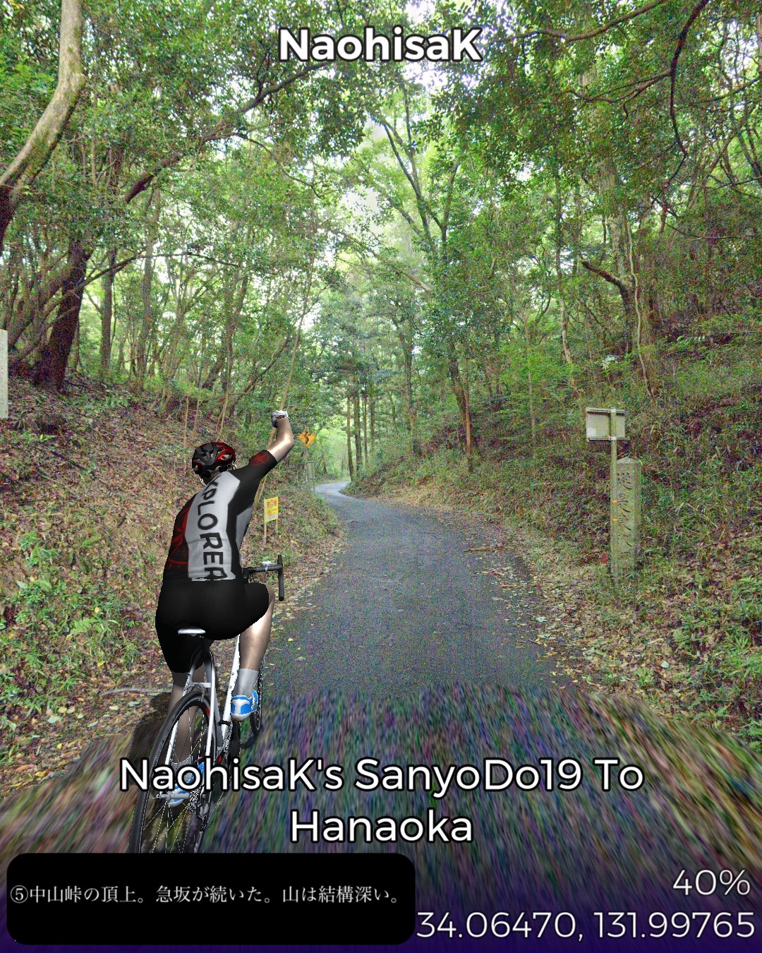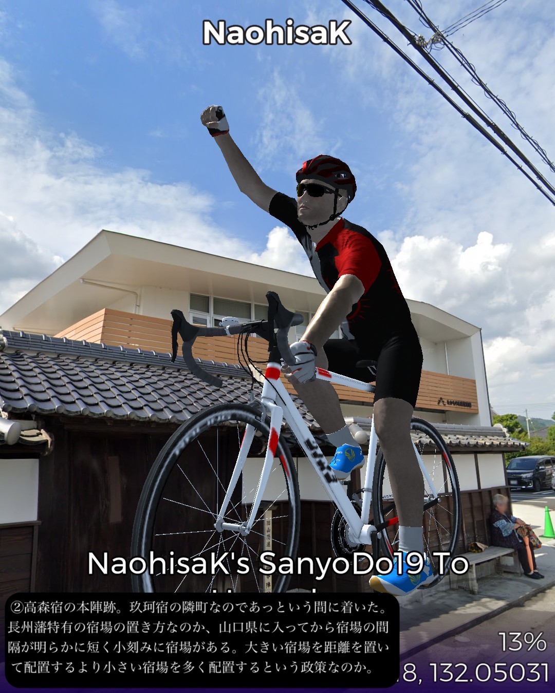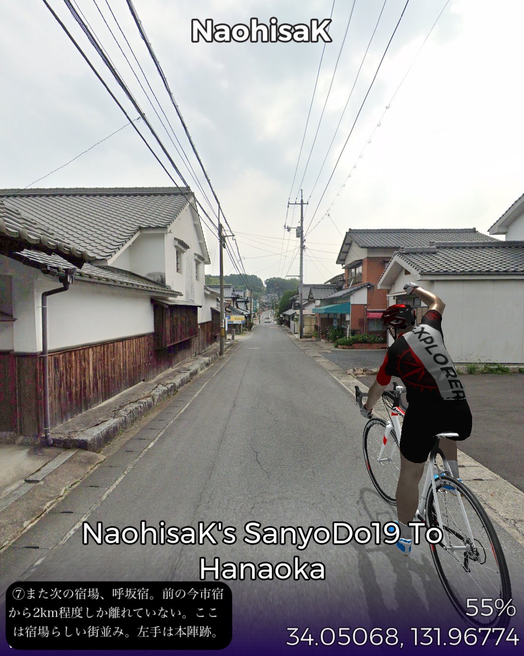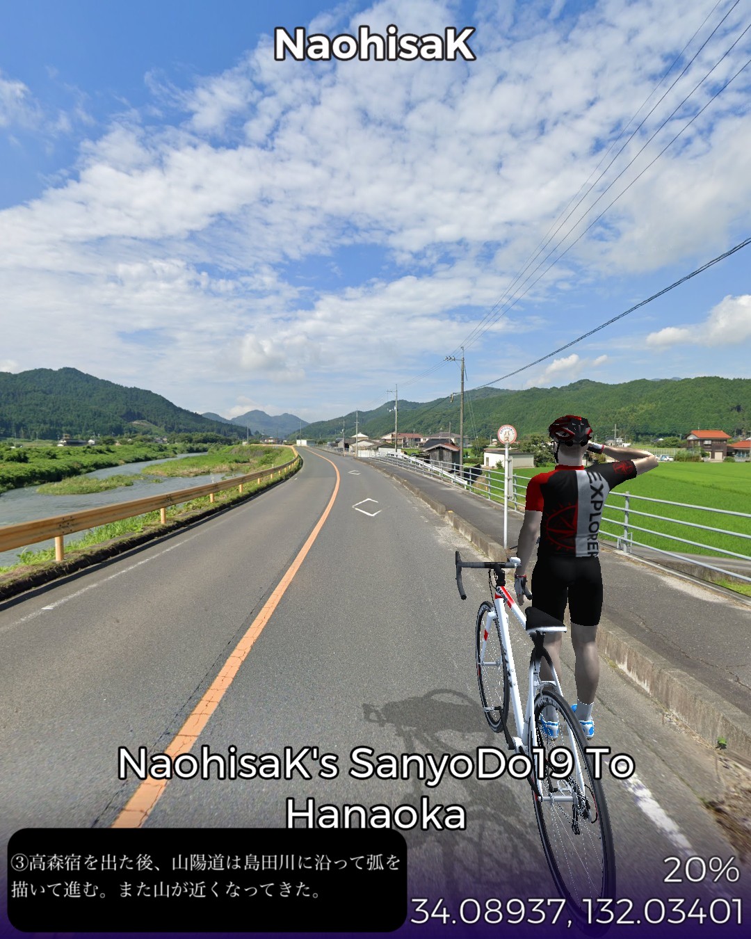 VRサイクリング、山陽道19日目は盆地の街玖珂宿から、山の合間をひた走り、その間短いインターバルで高森宿、今市宿、呼坂宿、久保市宿と4つの宿場を通りすぎて5つ目の花岡宿がゴールで距離はせいぜい23kmという今までにないパターン。東海道も含めてこんなに短いインターバルで宿場が配置されていたのはここが初めて。調べてみるとこの先も宿場間の距離が短め。多分長州藩の宿場配置ポリシーに依るのかな。ちょこちょこちょっとした峠道もあるので、旅人の便宜を図るために小さめの宿場を短めのインターバルで配置したのではないか、と想像した。今日のルートは特筆すべきランドマーク的な名所はなかったが、前回と同様、箱庭のような日本の山と田園の原風景が満喫できた。次回はまた海沿いの道に戻って徳山に進む。