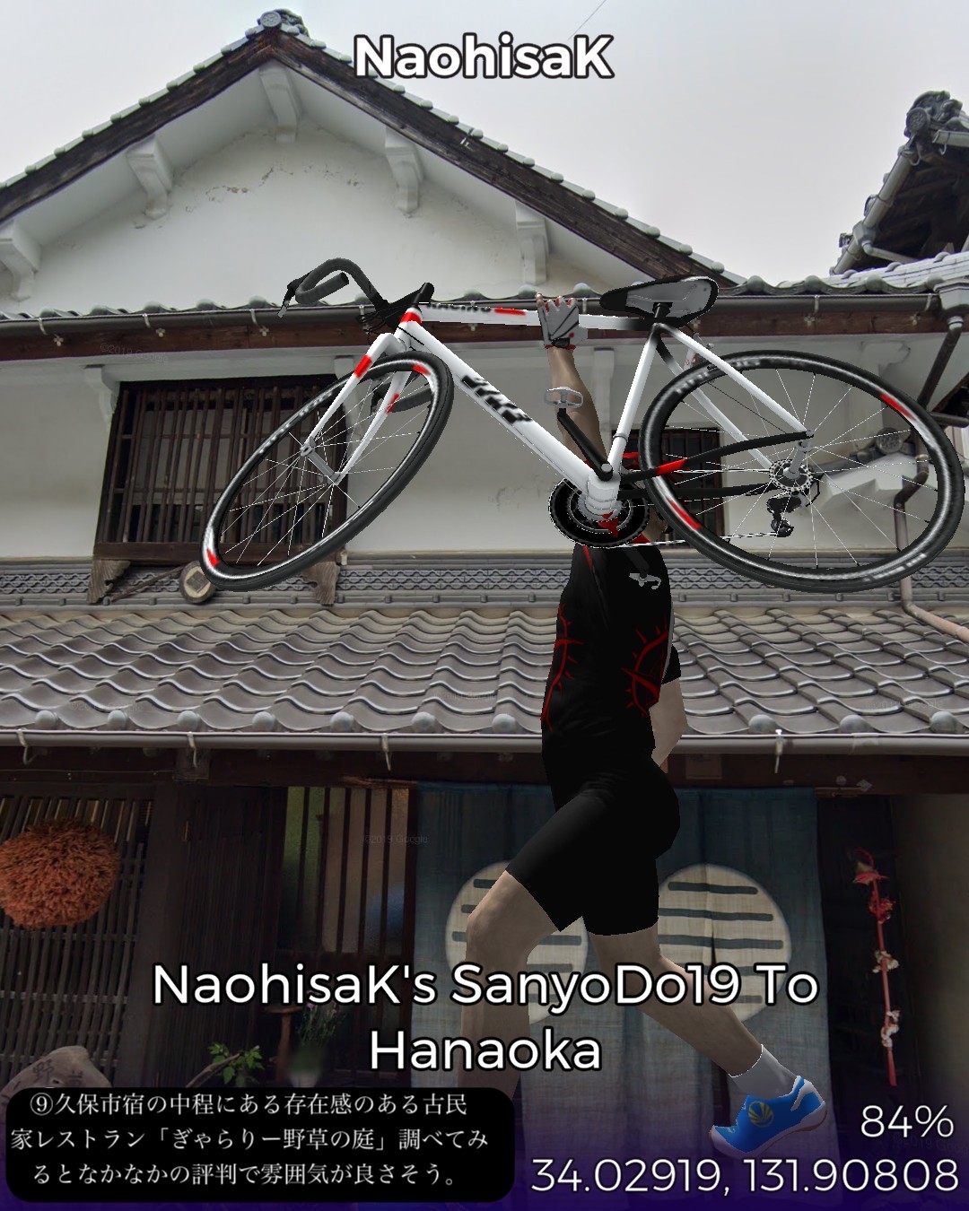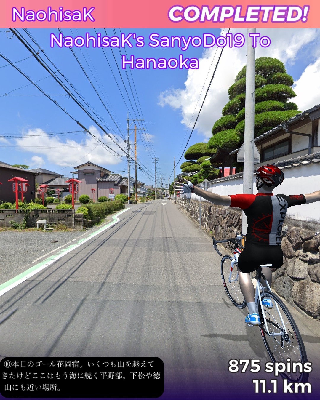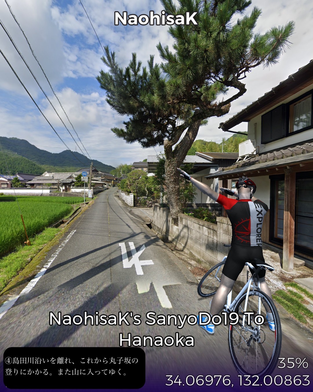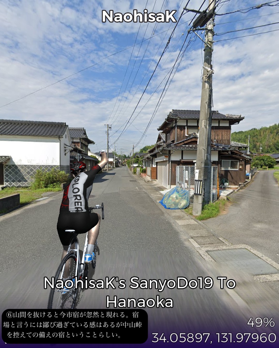 VRサイクリング、山陽道19日目は盆地の街玖珂宿から、山の合間をひた走り、その間短いインターバルで高森宿、今市宿、呼坂宿、久保市宿と4つの宿場を通りすぎて5つ目の花岡宿がゴールで距離はせいぜい23kmという今までにないパターン。東海道も含めてこんなに短いインターバルで宿場が配置されていたのはここが初めて。調べてみるとこの先も宿場間の距離が短め。多分長州藩の宿場配置ポリシーに依るのかな。ちょこちょこちょっとした峠道もあるので、旅人の便宜を図るために小さめの宿場を短めのインターバルで配置したのではないか、と想像した。今日のルートは特筆すべきランドマーク的な名所はなかったが、前回と同様、箱庭のような日本の山と田園の原風景が満喫できた。次回はまた海沿いの道に戻って徳山に進む。