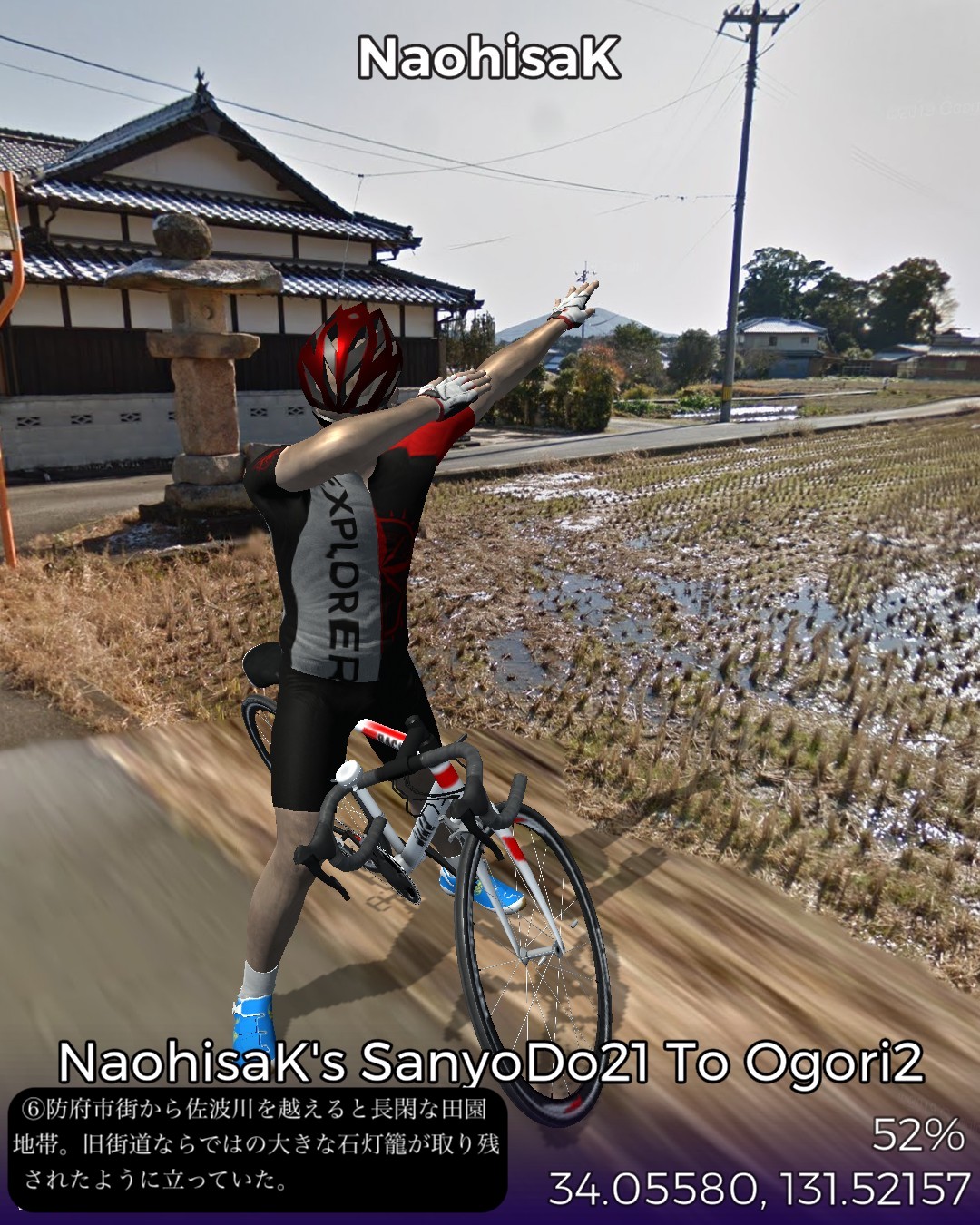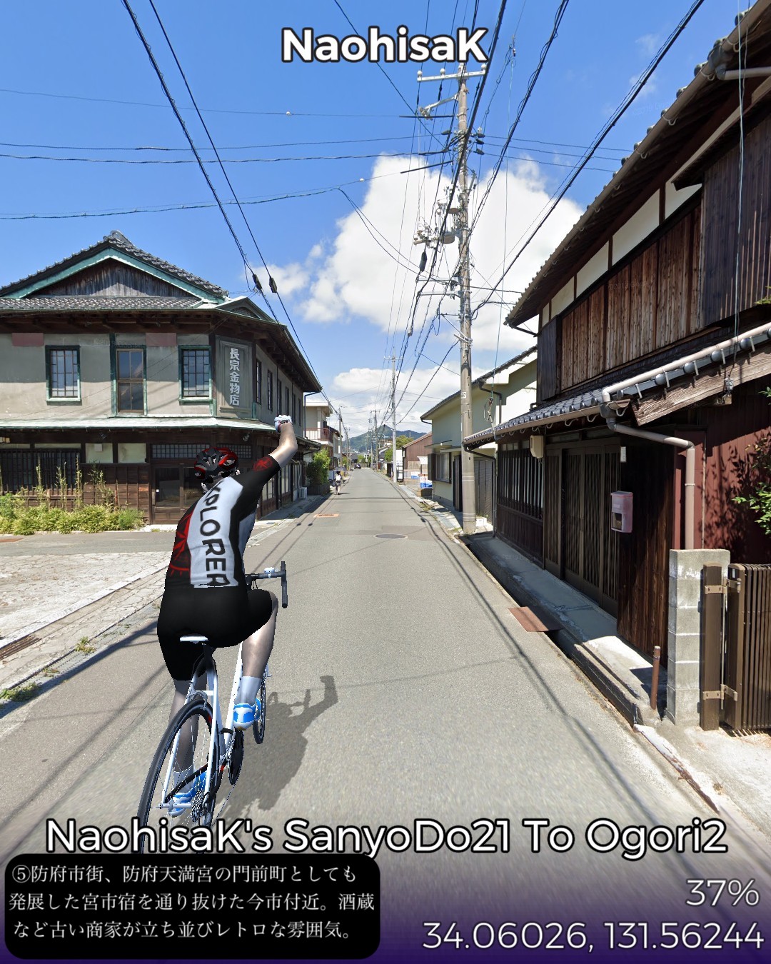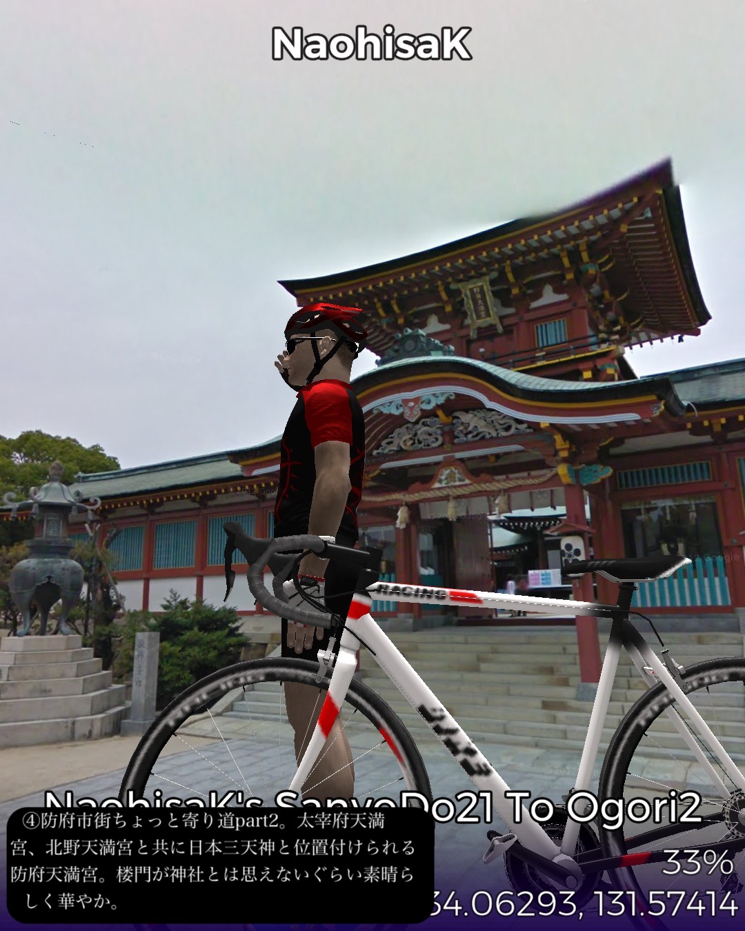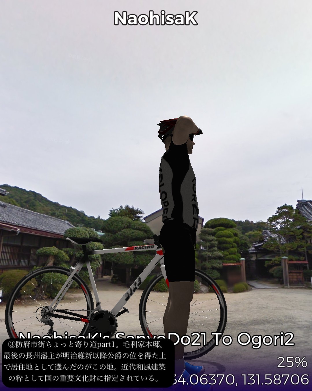 VRサイクリング、山陽道21日目。周囲から山で隔離された海辺の街富海宿を出て、名所史跡に富む古き良き都市、防府の宮市宿を経て、交通の要所小郡宿まで、今までで最長の31kmの長丁場のコース。防府は名前は知っていたがこれほど史跡の多い町というのは初めて知った。特に山陽道の沿道に史跡は集中していたので、明治維新以降公爵となった毛利家が居住した国の重要文化財毛利家本邸と日本三天神の1つ防府天満宮に寄り道をしてみた。他にも古代律令制の役所があった周防国衛跡や、創建当時の伽藍を残す周防国分寺などのさらにいにしえの史跡と共に、豊かな緑の中ゆったりした間隔で低い建造物が立ち並ぶ美しい街並みから大和時代の面影さえ感じられる稀有な町である。防府市街を離れた後は、目立ったランドマークはなかったが田園地帯を進み、山口県の県庁所在地山口市の玄関口となる小郡宿に着いた。山陽本線、山口線、山陽新幹線の新山口駅(昔は小郡駅)があり、昔の街道としても山陰道の分岐点があった交通の要所であるが、ちょっと山間に入りかけた意外とこじんまりした長閑な町である。ここまで来ると山陽道の終着点下関が道路のサインなどでも見えてくる。この勢いで一気に行ってしまおう。