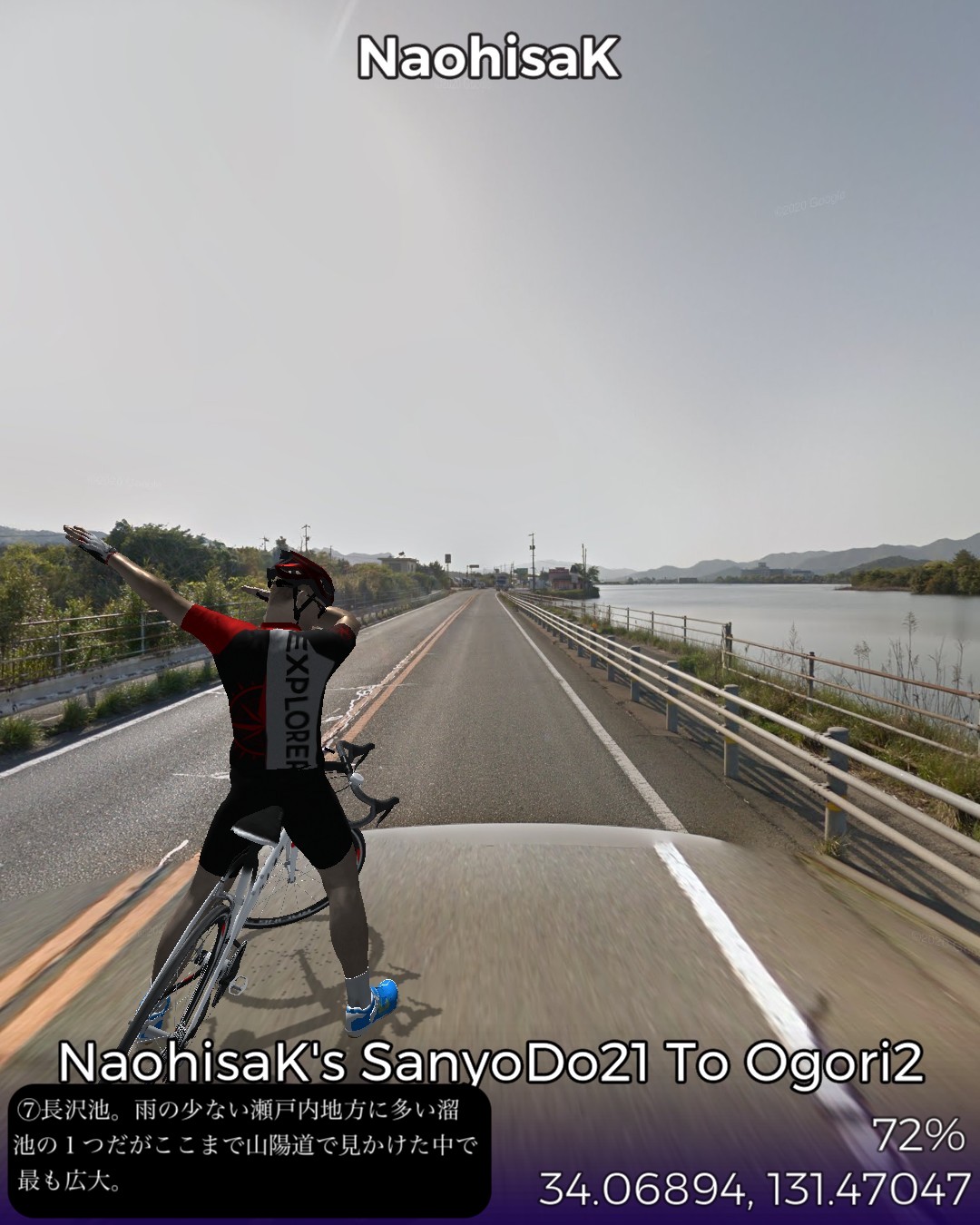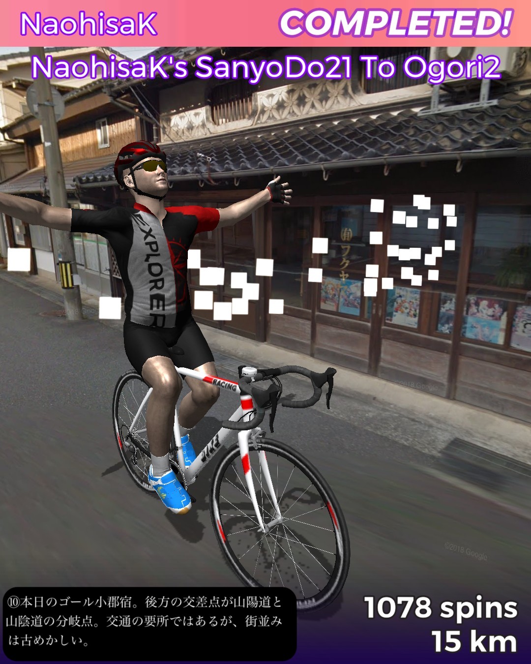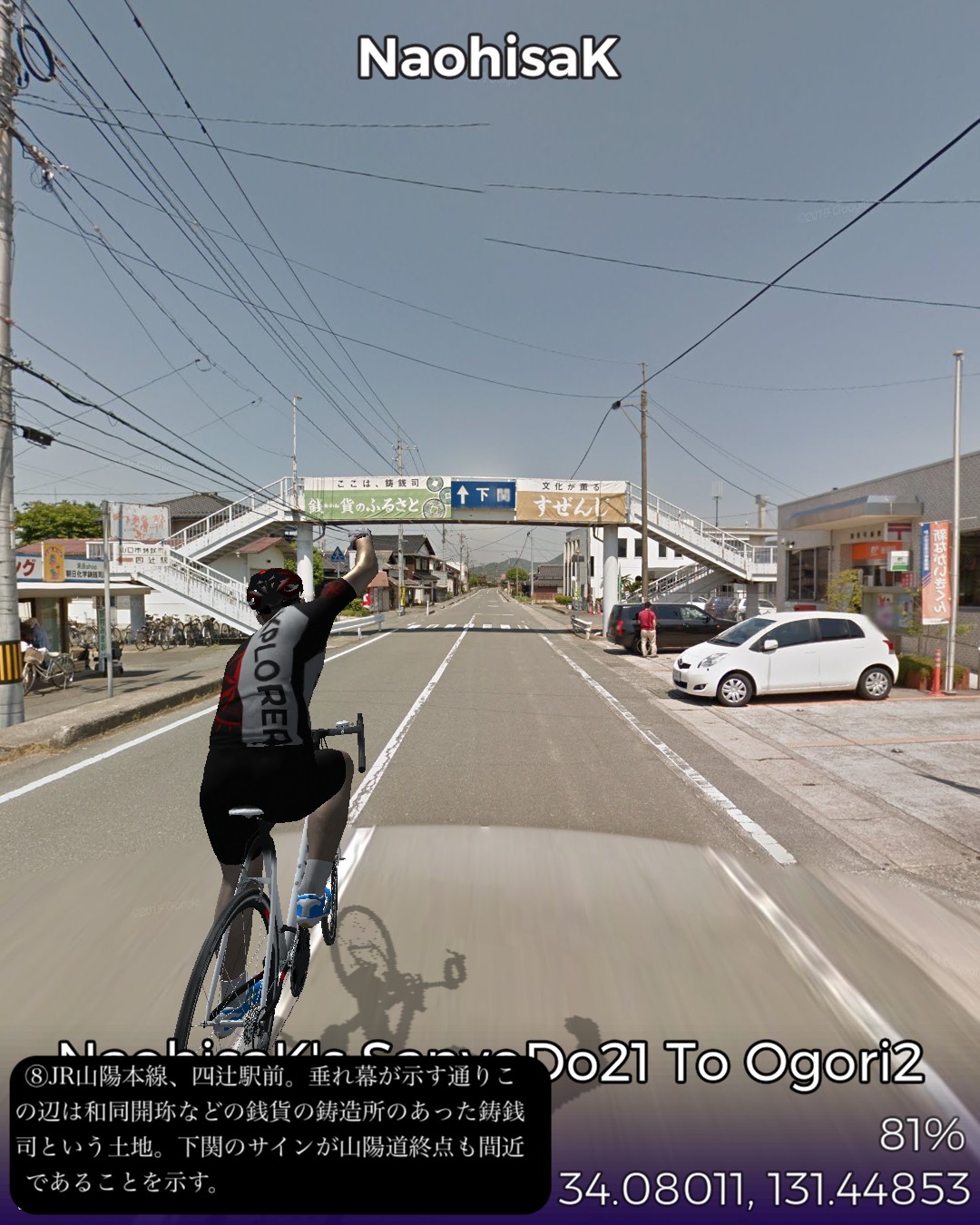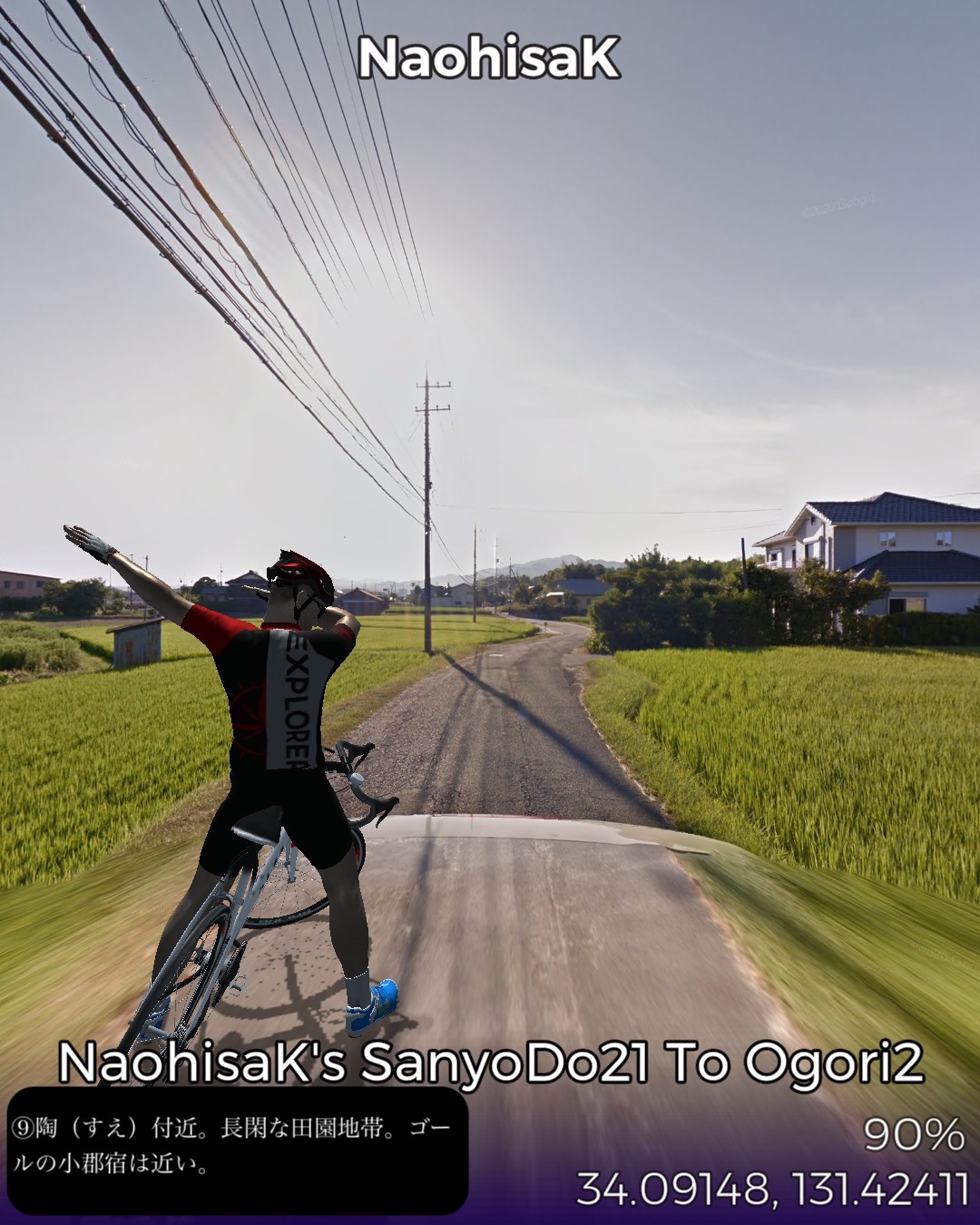 VRサイクリング、山陽道21日目。周囲から山で隔離された海辺の街富海宿を出て、名所史跡に富む古き良き都市、防府の宮市宿を経て、交通の要所小郡宿まで、今までで最長の31kmの長丁場のコース。防府は名前は知っていたがこれほど史跡の多い町というのは初めて知った。特に山陽道の沿道に史跡は集中していたので、明治維新以降公爵となった毛利家が居住した国の重要文化財毛利家本邸と日本三天神の1つ防府天満宮に寄り道をしてみた。他にも古代律令制の役所があった周防国衛跡や、創建当時の伽藍を残す周防国分寺などのさらにいにしえの史跡と共に、豊かな緑の中ゆったりした間隔で低い建造物が立ち並ぶ美しい街並みから大和時代の面影さえ感じられる稀有な町である。防府市街を離れた後は、目立ったランドマークはなかったが田園地帯を進み、山口県の県庁所在地山口市の玄関口となる小郡宿に着いた。山陽本線、山口線、山陽新幹線の新山口駅(昔は小郡駅)があり、昔の街道としても山陰道の分岐点があった交通の要所であるが、ちょっと山間に入りかけた意外とこじんまりした長閑な町である。ここまで来ると山陽道の終着点下関が道路のサインなどでも見えてくる。この勢いで一気に行ってしまおう。