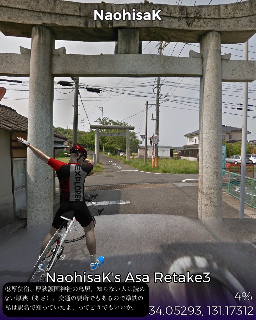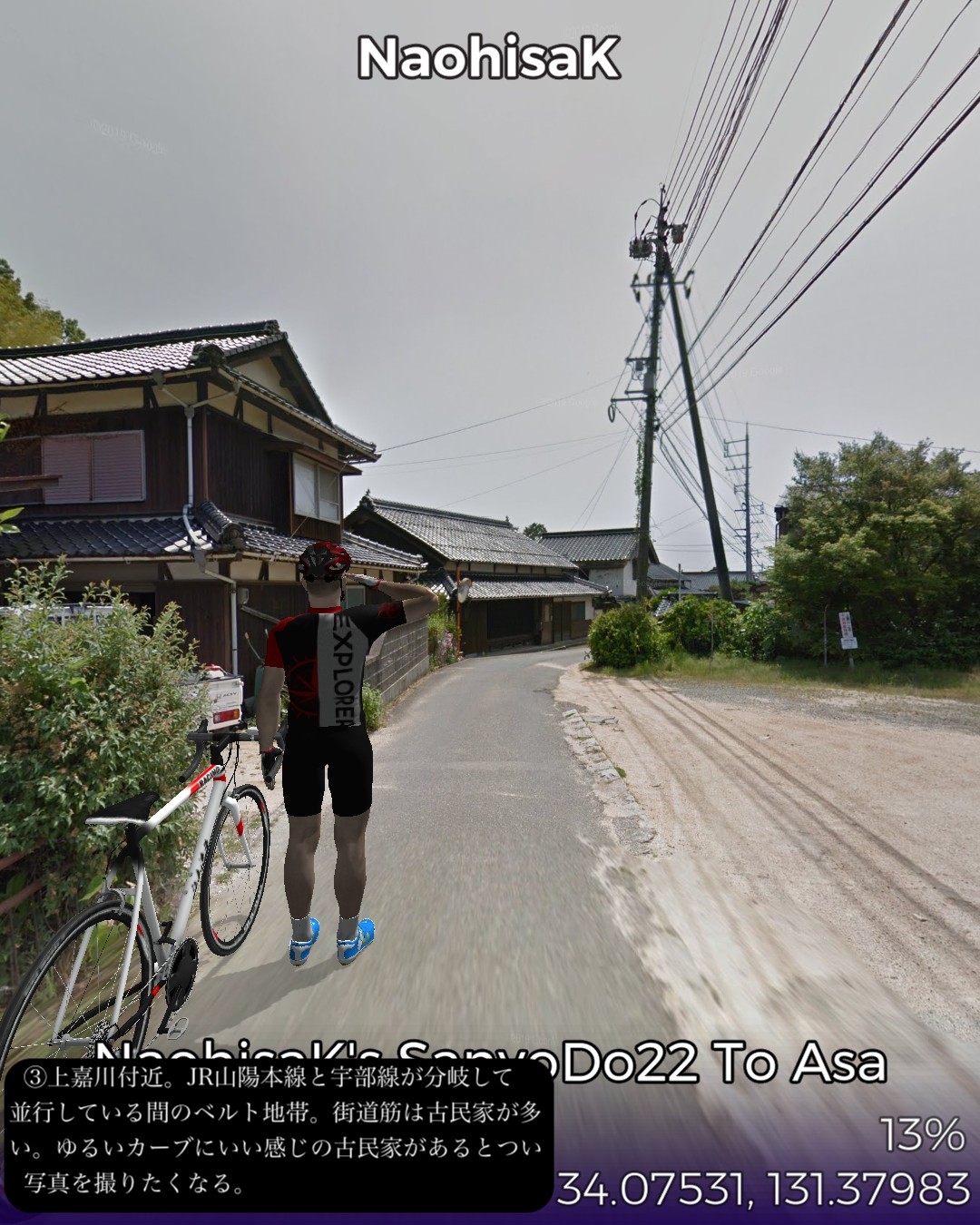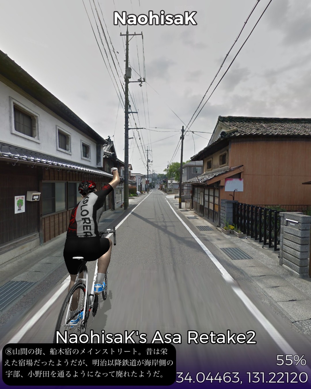 VRサイクリング、山陽道22日目。交通の要所、小郡宿を出て、ダラダラとした山間を進んで山中宿、船木宿を経てこれも山間の交通の要所厚狭宿までの28kmのコース。この区間は昔は街道沿いで栄えたが、JR山陽本線が外れて南側の宇部、小野田を通るようになり、こちらの方が、明治以降、石炭やセメント事業で栄え、現代はさらにハイテク産業が誘致されてさらに発展してきた。それに比べると北側の今日のルート周辺は市域としては宇部市や小野田市であるが、寂れた山里のままである。VRサイクリングのルートとしては山里で上等なのだが、旧道がストリートビューに対応していない等で8割方国道を走る羽目となり、ランドマークや名所旧跡もめぼしいものはなく結果としては面白みには欠けた。