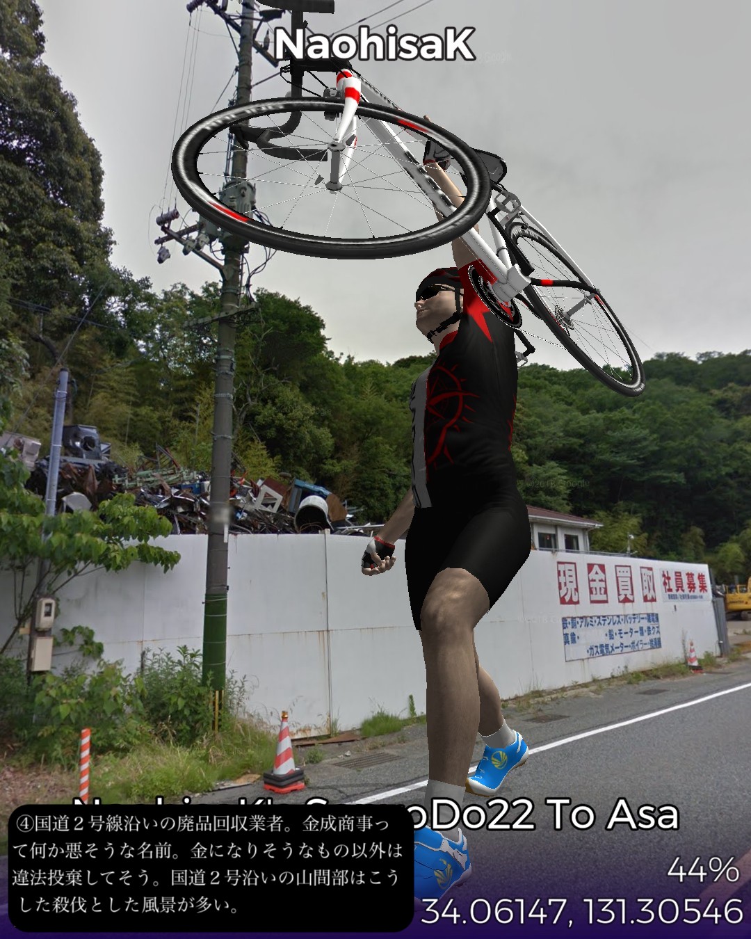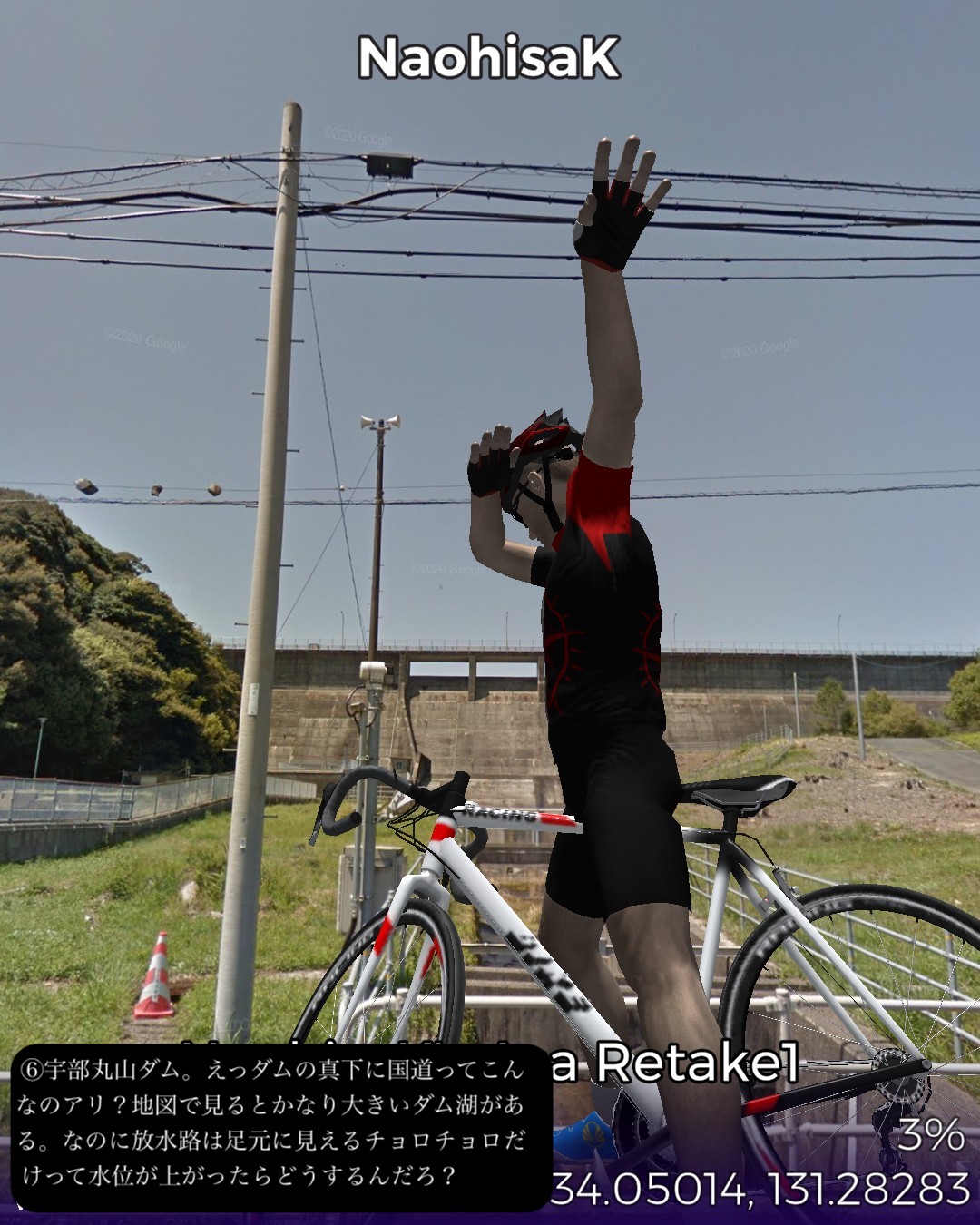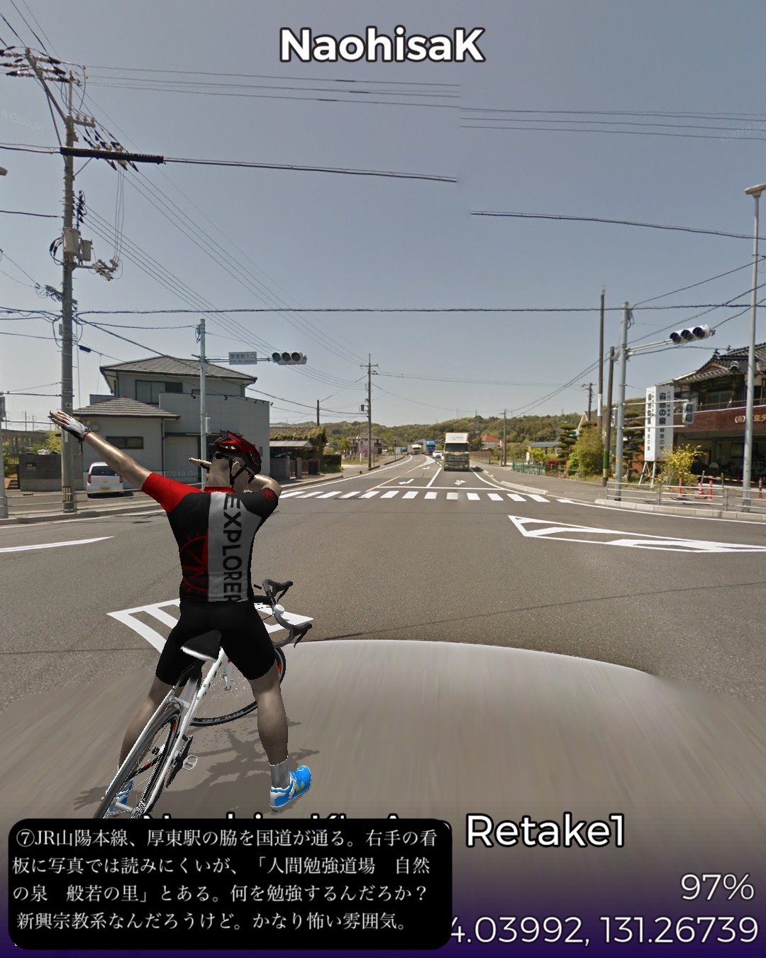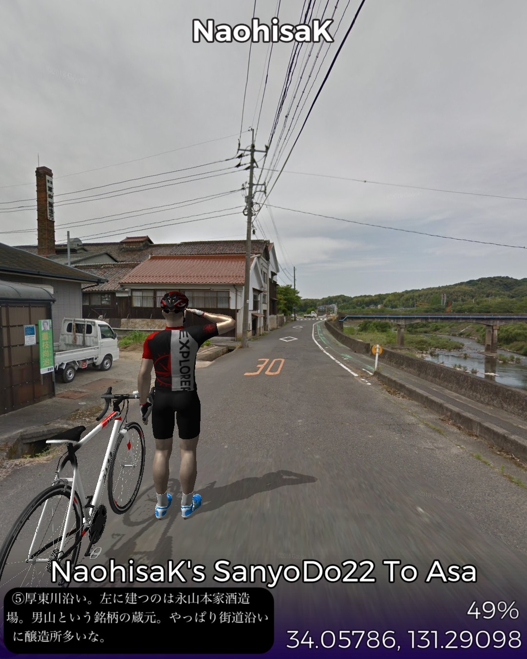 VRサイクリング、山陽道22日目。交通の要所、小郡宿を出て、ダラダラとした山間を進んで山中宿、船木宿を経てこれも山間の交通の要所厚狭宿までの28kmのコース。この区間は昔は街道沿いで栄えたが、JR山陽本線が外れて南側の宇部、小野田を通るようになり、こちらの方が、明治以降、石炭やセメント事業で栄え、現代はさらにハイテク産業が誘致されてさらに発展してきた。それに比べると北側の今日のルート周辺は市域としては宇部市や小野田市であるが、寂れた山里のままである。VRサイクリングのルートとしては山里で上等なのだが、旧道がストリートビューに対応していない等で8割方国道を走る羽目となり、ランドマークや名所旧跡もめぼしいものはなく結果としては面白みには欠けた。