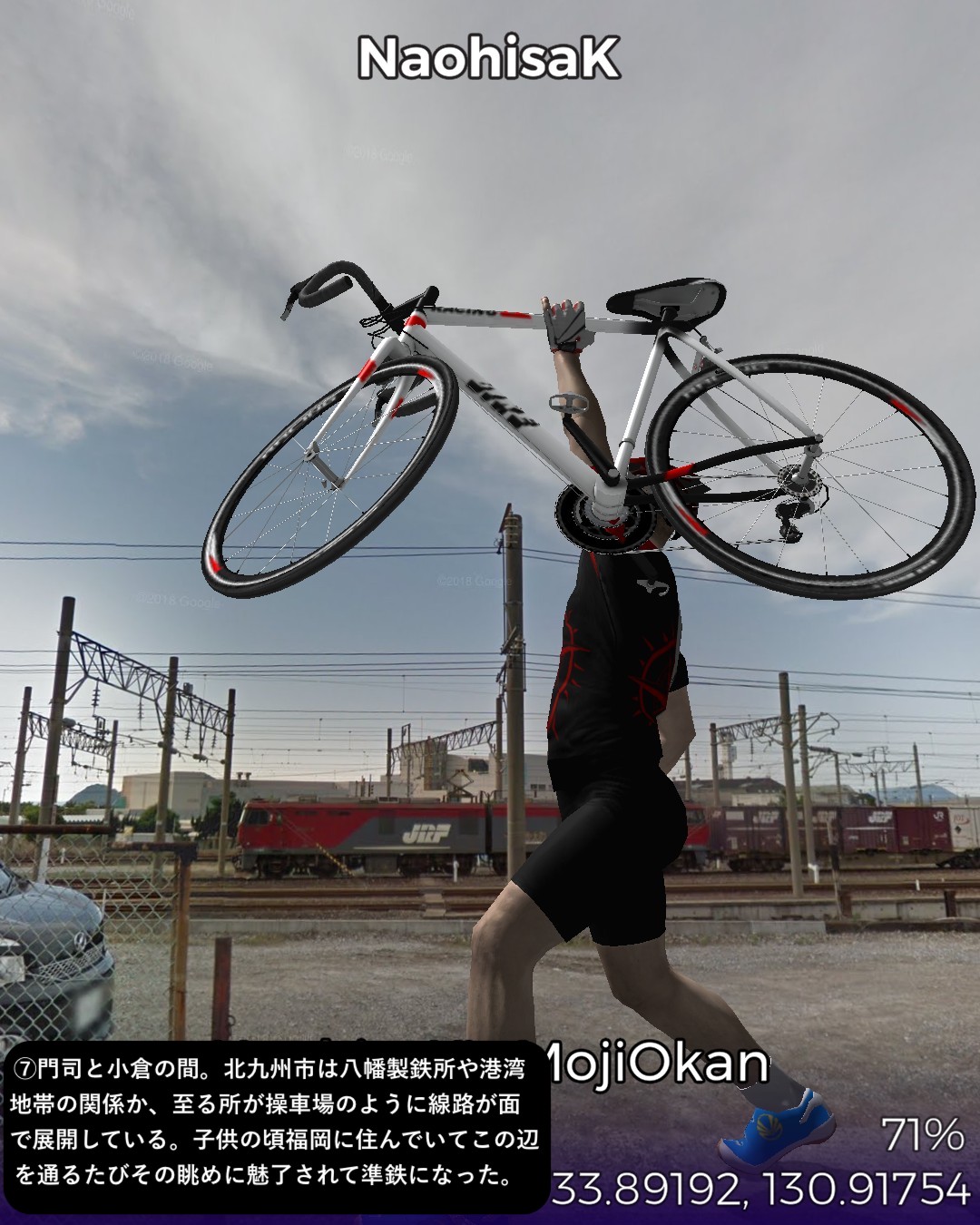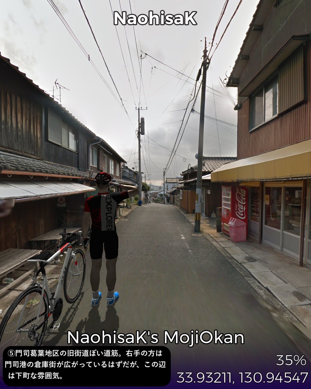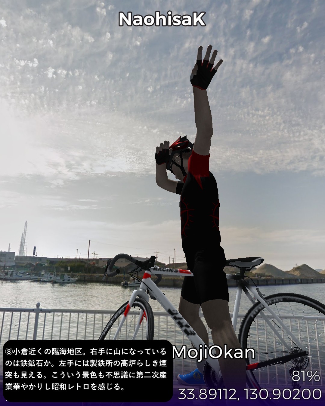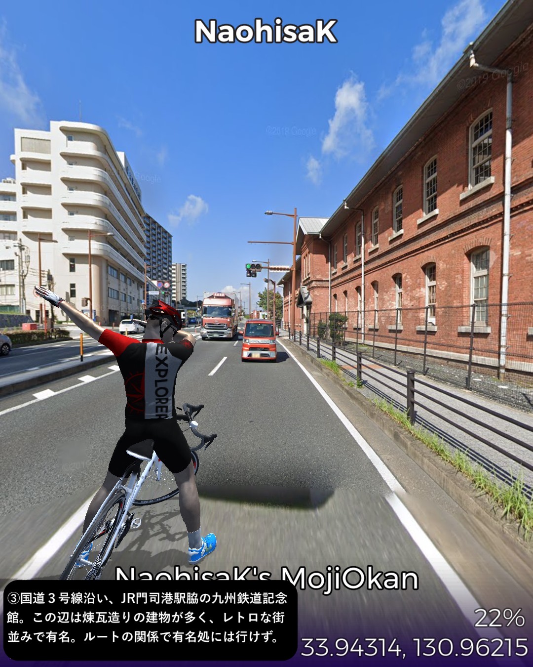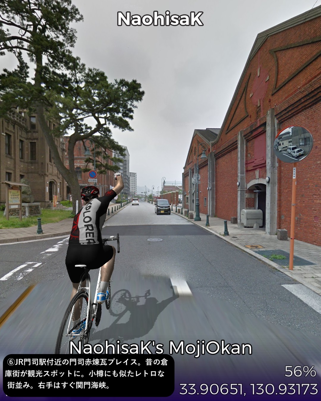 VRサイクリング、関門人道トンネルを通過して(したことにして)いよいよ九州に上陸しました。上陸地点は創建が弥生時代と言われる由緒ある和府刈(めかり)神社の脇です。関門橋の下を潜り、関門海峡と対岸の下関を間近に眺めつつ海岸伝いに小倉の常盤橋を目指す16kmの行程。今日のルートはレトロがキーワード。江戸時代以前の名残を感じるものはないですが、明治、大正、昭和の雰囲気が懐かしさと共にグッと迫ってきます。煉瓦造りの建物、港湾の倉庫街、素朴な昔ながらの商店街、むき出しの工場地帯、鉄道の引き込み線。諸々が懐かしさを感じさせます。私が幼少期を過ごした九州に入ってきたということもあるかもしれません。JR門司駅付近に位置するの大里(だいり)宿は倉庫街になっていますが、昔は下関からの渡し船による上陸地点で、ここから小倉の常盤橋までが門司往還という昔の街道筋になります。工業都市北九州市の商業地区である小倉の市街に入ると典型的な普通の都会です。ゴールの常盤橋は九州の日本橋的な存在で、江戸時代以前はここが長崎街道、秋月街道、中津街道の起点となり九州各地への出発地点になっていたようです。さてここからどこに進みましょうか。