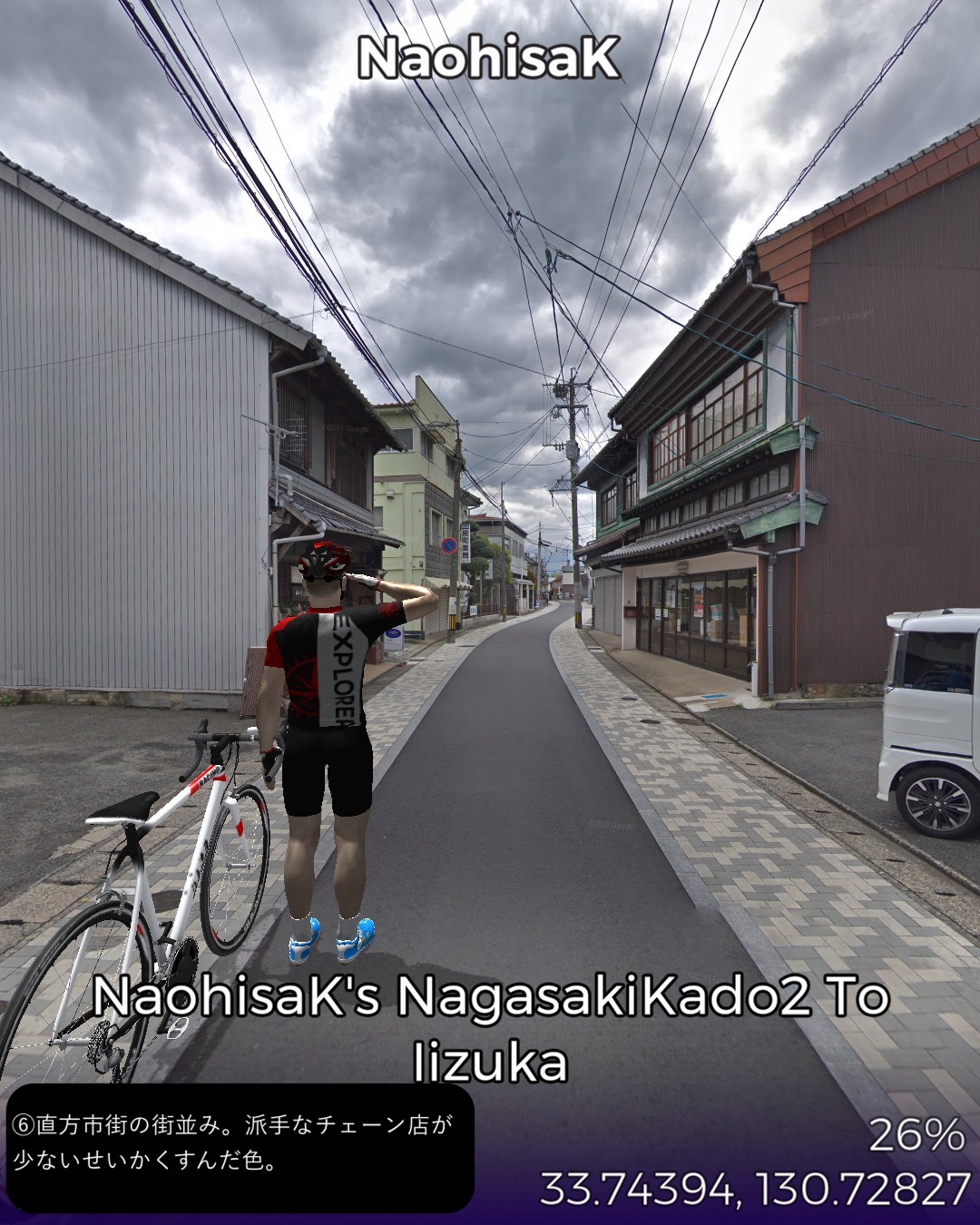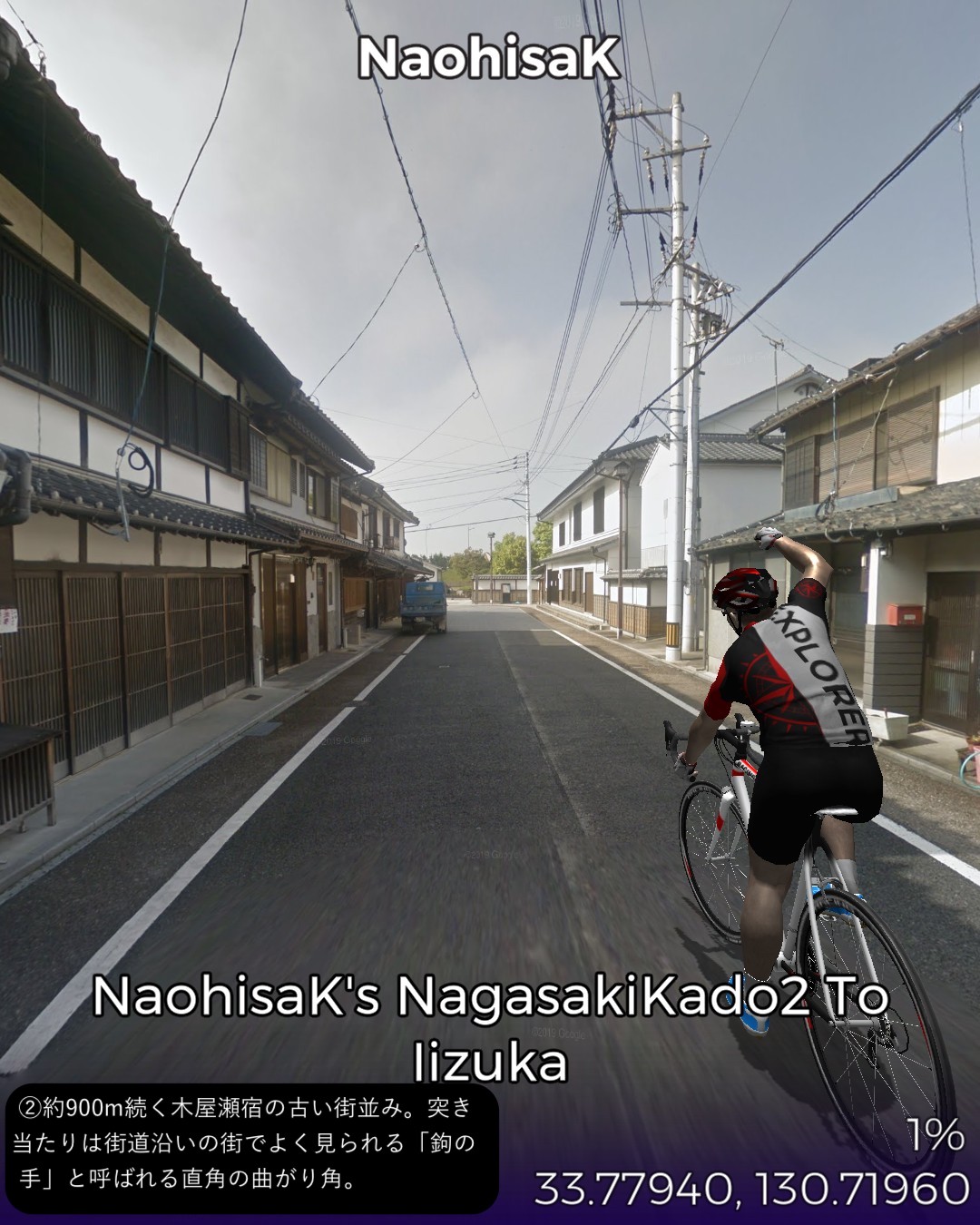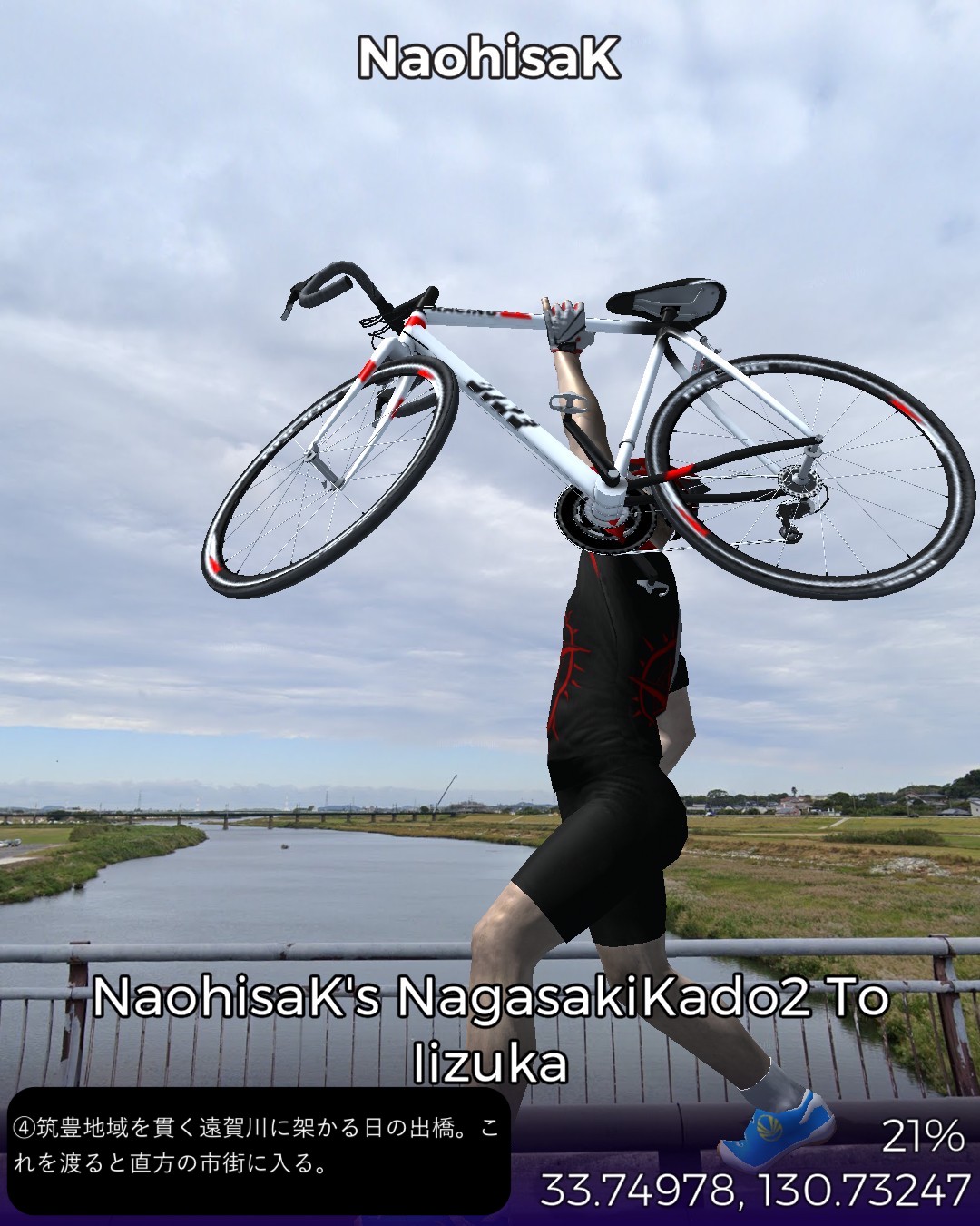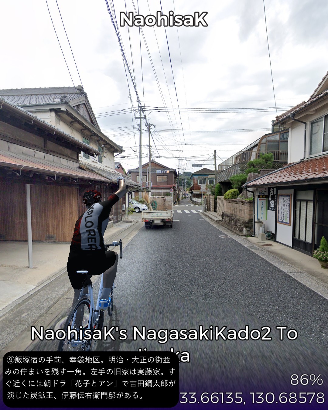 VRサイクリング、長崎街道2日目。木屋瀬宿から飯塚宿まで21kmの行程。遠賀川を上りつつ、いわゆる筑豊地域を進むルート。街道の宿場の雰囲気を色濃く残した木屋瀬宿から筑豊の母なる川、遠賀川沿いに長崎街道は進み、直方を経由し、筑豊最大の都市、飯塚まで、筑豊三大都市の2つを通る。筑豊と言えば、我々世代には懐かしい、五木寛之の「青春の門」の舞台になった炭鉱地帯というイメージが強いが、既に炭鉱は閉山しその面影はほとんどない。ゆったり流れる遠賀川と広がる田園地帯の印象が強く残った。
