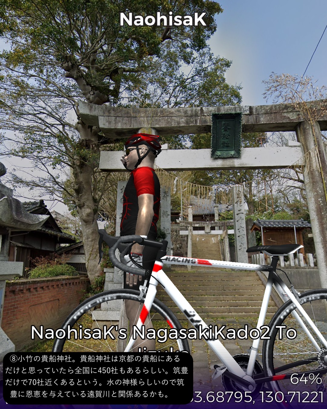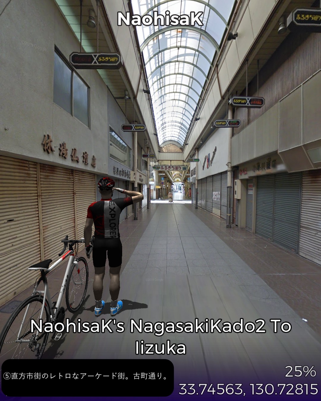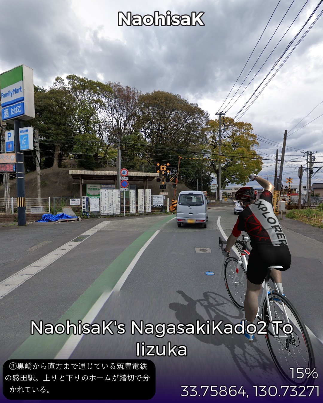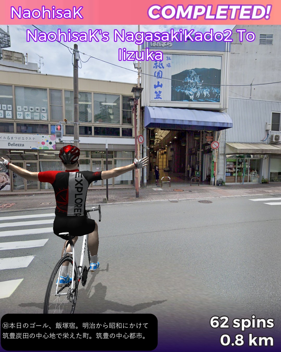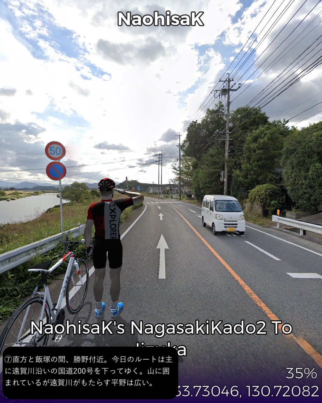 VRサイクリング、長崎街道2日目。木屋瀬宿から飯塚宿まで21kmの行程。遠賀川を上りつつ、いわゆる筑豊地域を進むルート。街道の宿場の雰囲気を色濃く残した木屋瀬宿から筑豊の母なる川、遠賀川沿いに長崎街道は進み、直方を経由し、筑豊最大の都市、飯塚まで、筑豊三大都市の2つを通る。筑豊と言えば、我々世代には懐かしい、五木寛之の「青春の門」の舞台になった炭鉱地帯というイメージが強いが、既に炭鉱は閉山しその面影はほとんどない。ゆったり流れる遠賀川と広がる田園地帯の印象が強く残った。