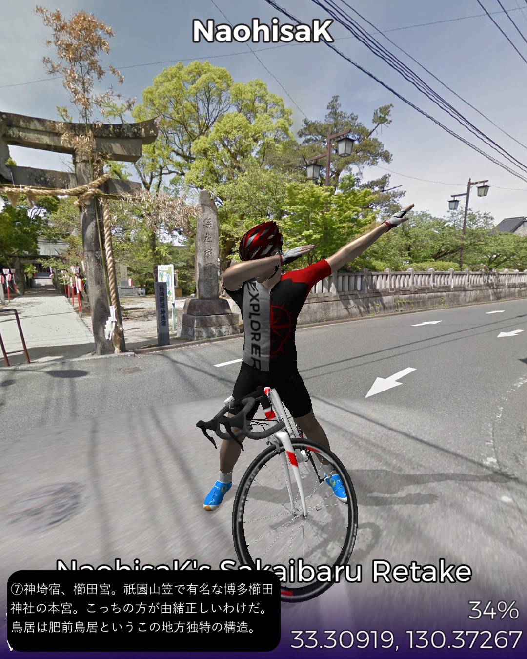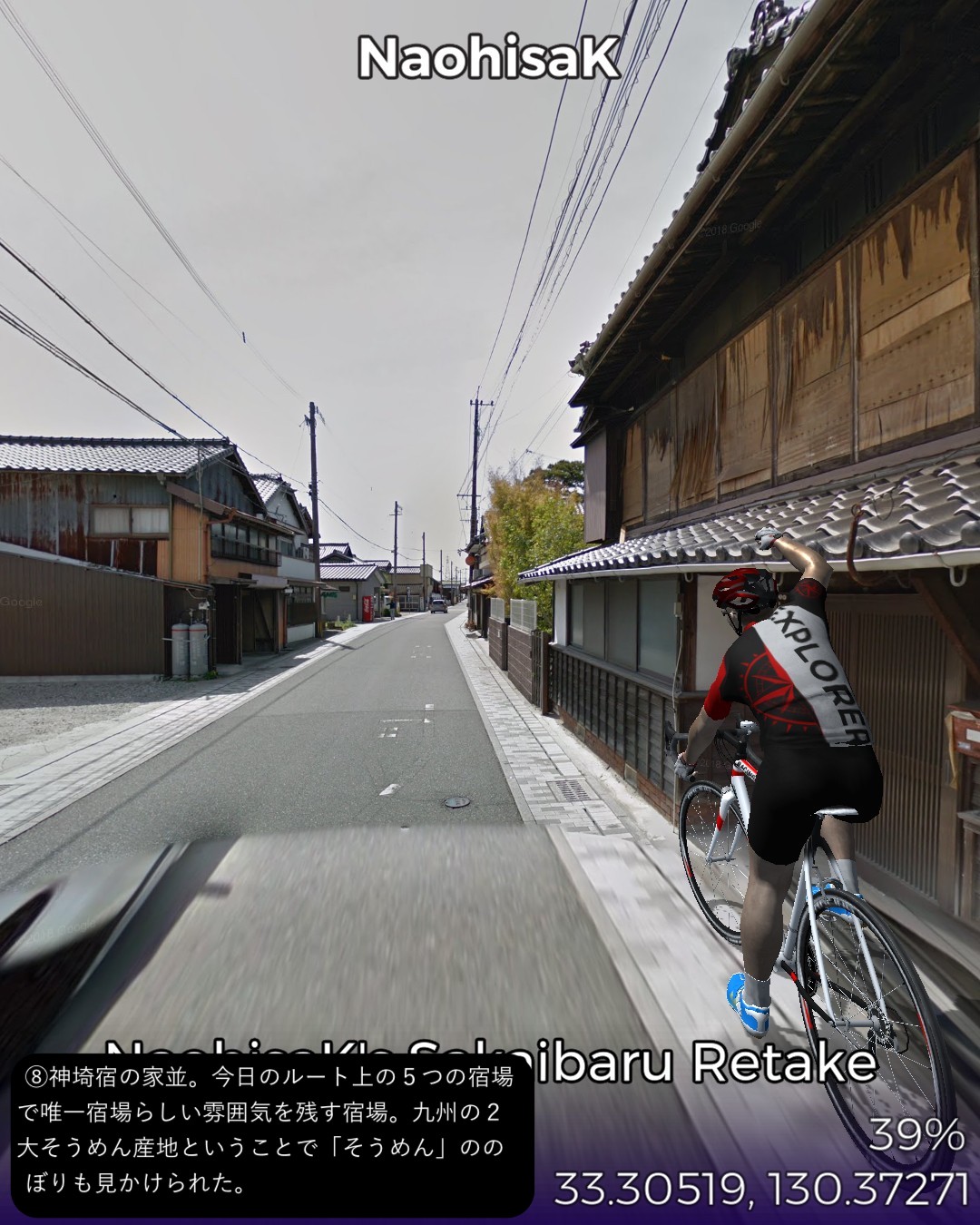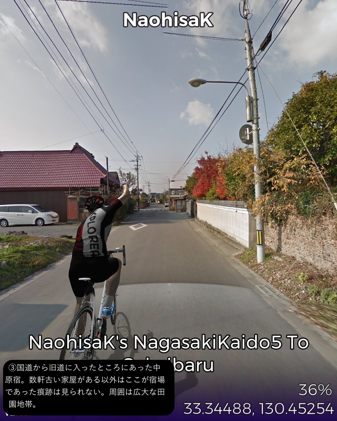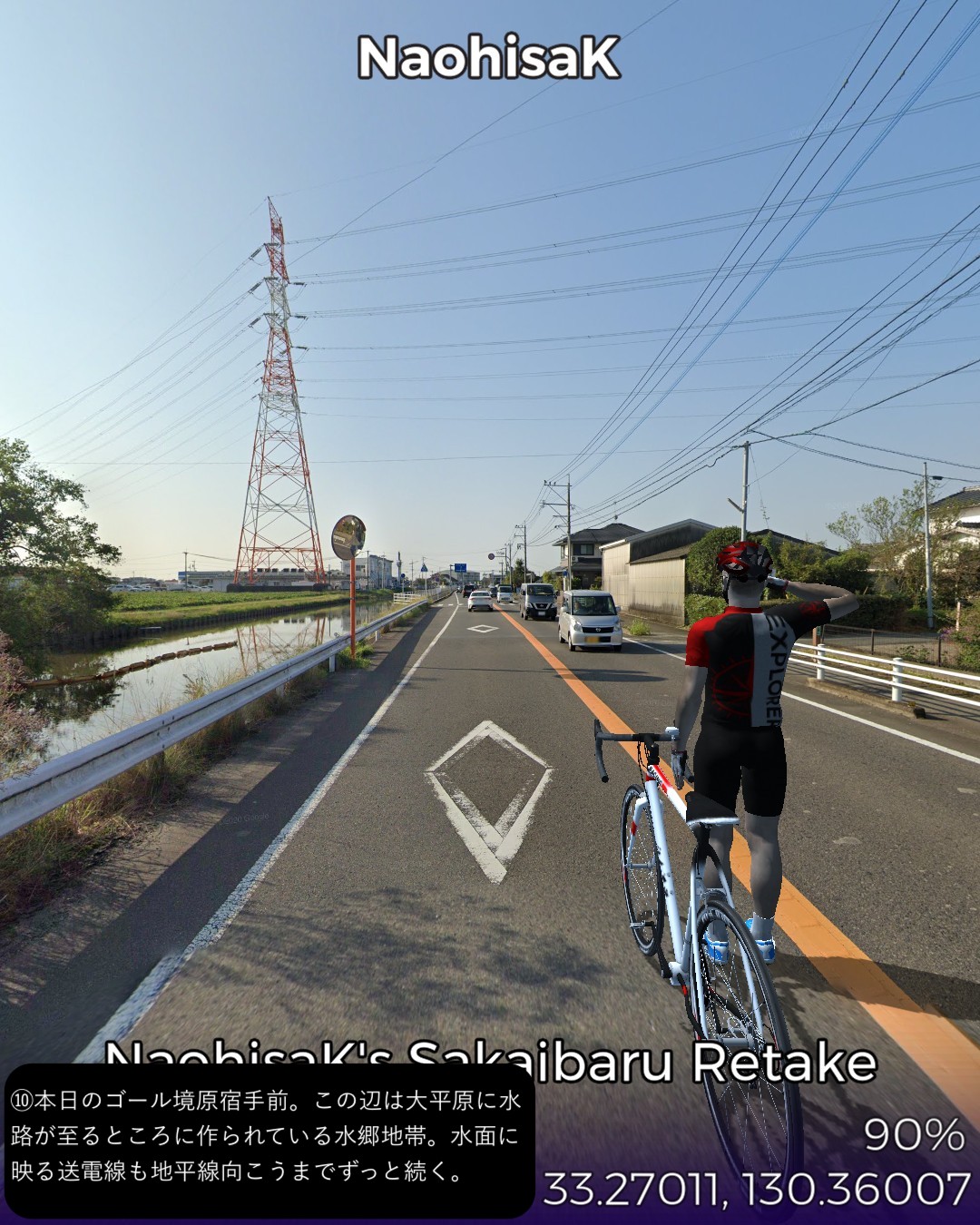 VRサイクリング、長崎街道5日目。今日もサイコロ4の目が出たので、田代宿から轟木宿、中原宿、神埼宿を経て境原宿まで、久々に長距離の28kmの行程を走る。今日のルートは一言で言うなら「大平原を往く」だね。地図で見ると筑後川のもたらす大平原の広がりの中を進む感じ。昔流行った「はなわ」の「佐賀県」で「バスに乗って佐賀の県道を走ると一面田んぼだらけまるで弥生時代。建物と言えば民家しかないからバス停の名前が山下さん家前」と言うくだりはよく分かる。茫漠として捉えどころのない土地柄ですな。走っていても眠くなってきそうな。弥生時代と言えば、佐賀の最大の名所、吉野ヶ里歴史公園にも街道から近いのでちょっと寄ってみた。ストリートビューが外の道から公園内部につながっているので、入場料有料の場所だが何と自転車でそのまま入ってぐるっと一回り。吉野ヶ里遺跡のちょっと先でようやく街道筋らしい宿場、神埼宿に入る。旧家らしい古い家並が残り、博多の櫛田神社の本宮という由緒ある櫛田宮やシーボルトが泊まったという脇本陣の真光寺がある。神埼宿を出るとその先はどこまでも広がる田園地帯、至るところに引かれた灌漑用の広い水路、地平線まで続く送電線、という正に茫洋たる風景が続く。漕いでも漕いでも進まない感覚を覚えながらようやくゴールの何もない境原宿に到着。こんなに田舎だけど(佐賀県人さん失礼!)次回突入予定の佐賀市街はすぐそこ。