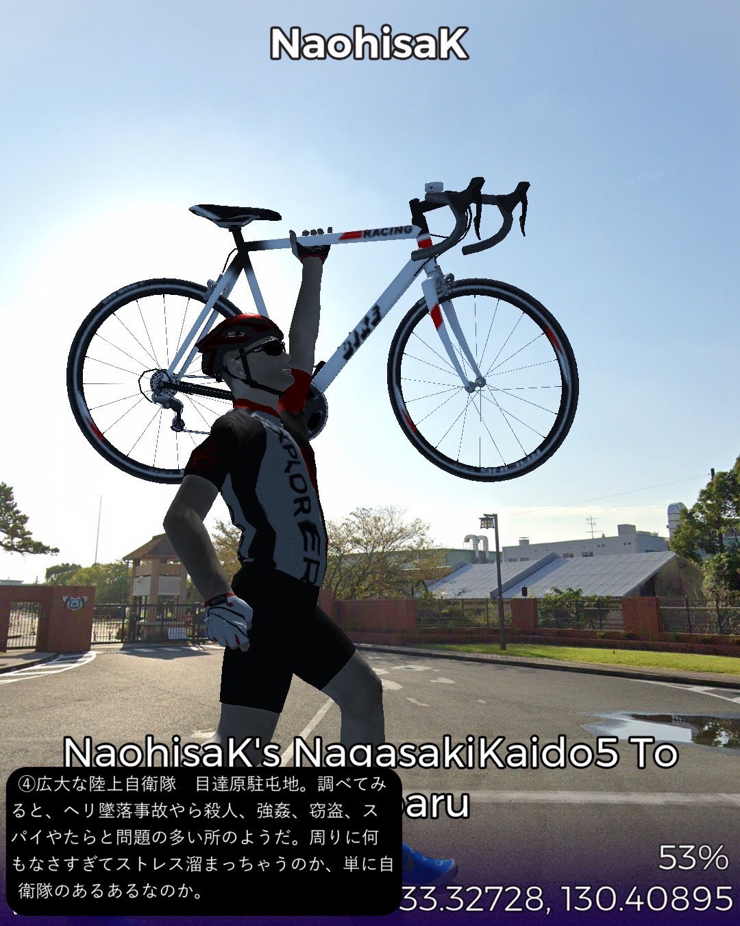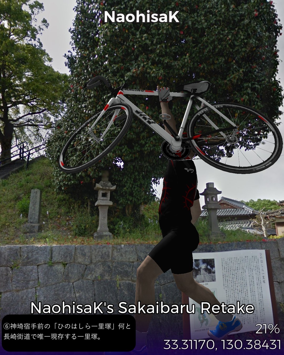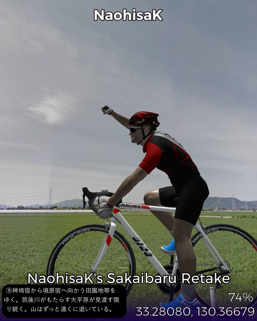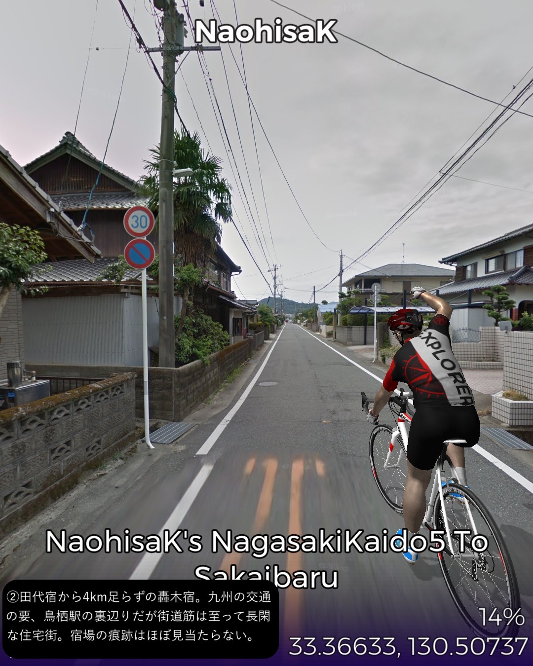 VRサイクリング、長崎街道5日目。今日もサイコロ4の目が出たので、田代宿から轟木宿、中原宿、神埼宿を経て境原宿まで、久々に長距離の28kmの行程を走る。今日のルートは一言で言うなら「大平原を往く」だね。地図で見ると筑後川のもたらす大平原の広がりの中を進む感じ。昔流行った「はなわ」の「佐賀県」で「バスに乗って佐賀の県道を走ると一面田んぼだらけまるで弥生時代。建物と言えば民家しかないからバス停の名前が山下さん家前」と言うくだりはよく分かる。茫漠として捉えどころのない土地柄ですな。走っていても眠くなってきそうな。弥生時代と言えば、佐賀の最大の名所、吉野ヶ里歴史公園にも街道から近いのでちょっと寄ってみた。ストリートビューが外の道から公園内部につながっているので、入場料有料の場所だが何と自転車でそのまま入ってぐるっと一回り。吉野ヶ里遺跡のちょっと先でようやく街道筋らしい宿場、神埼宿に入る。旧家らしい古い家並が残り、博多の櫛田神社の本宮という由緒ある櫛田宮やシーボルトが泊まったという脇本陣の真光寺がある。神埼宿を出るとその先はどこまでも広がる田園地帯、至るところに引かれた灌漑用の広い水路、地平線まで続く送電線、という正に茫洋たる風景が続く。漕いでも漕いでも進まない感覚を覚えながらようやくゴールの何もない境原宿に到着。こんなに田舎だけど(佐賀県人さん失礼!)次回突入予定の佐賀市街はすぐそこ。