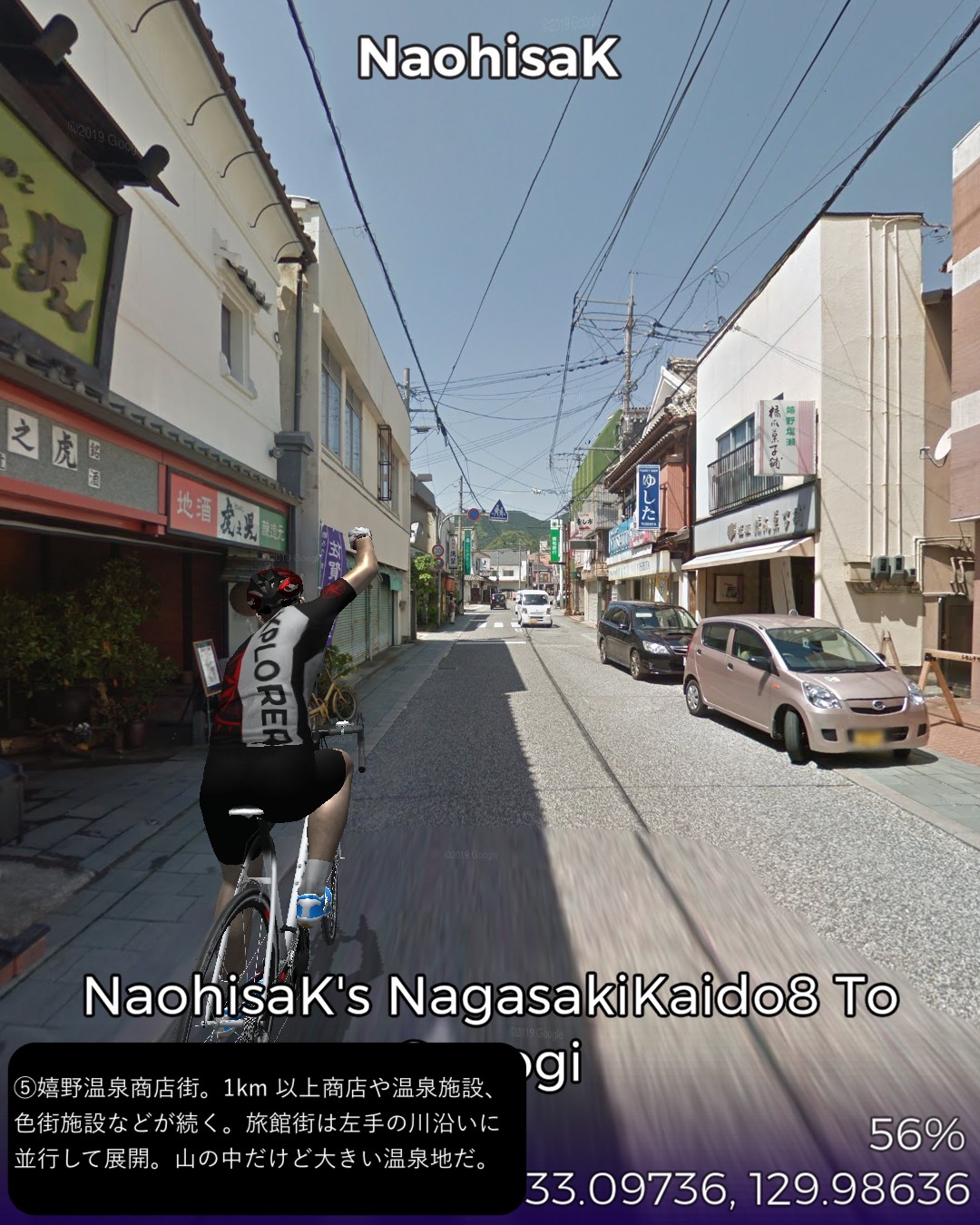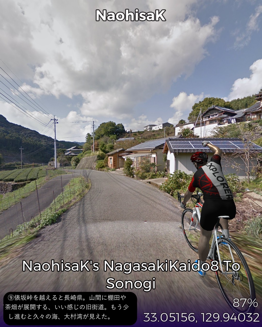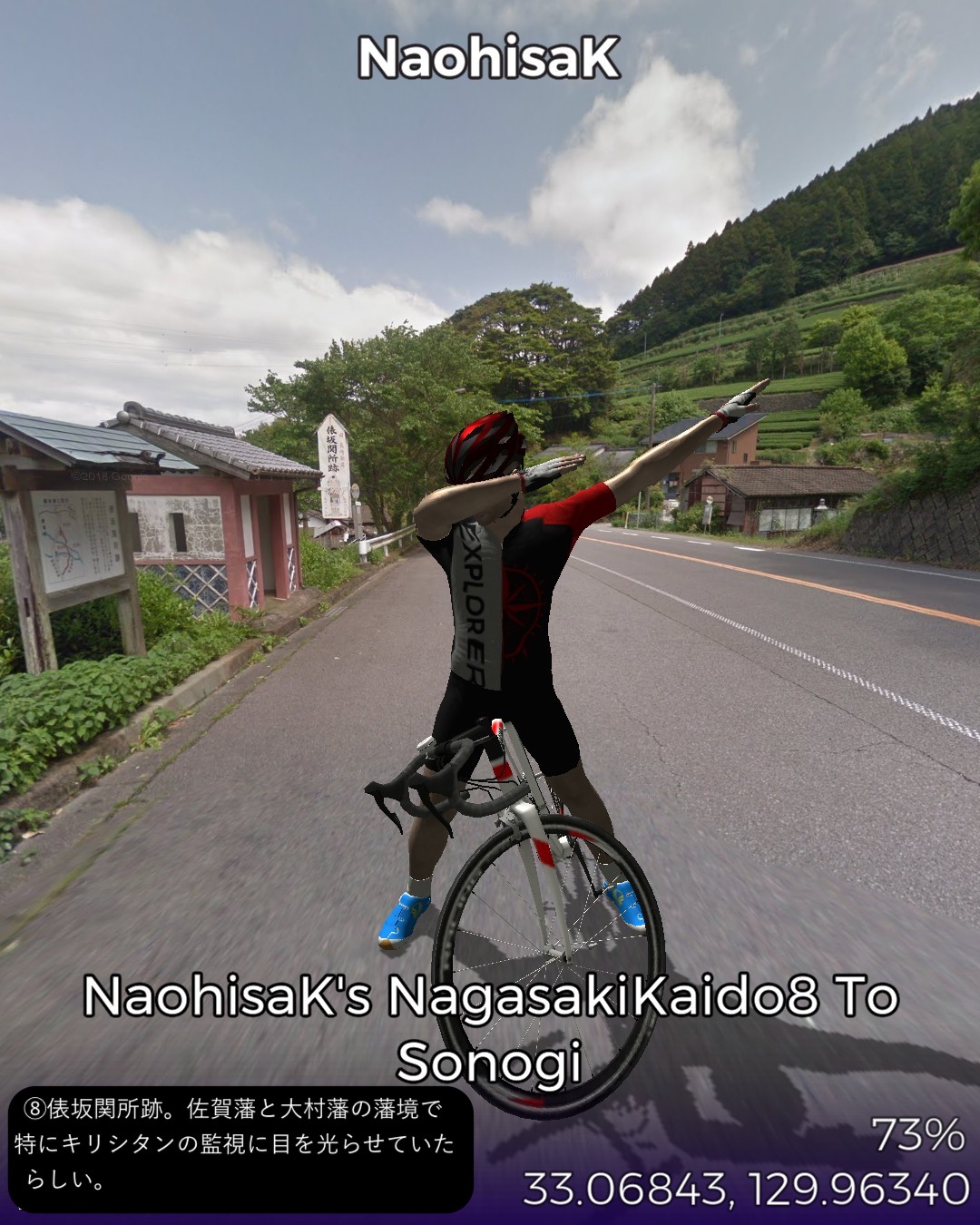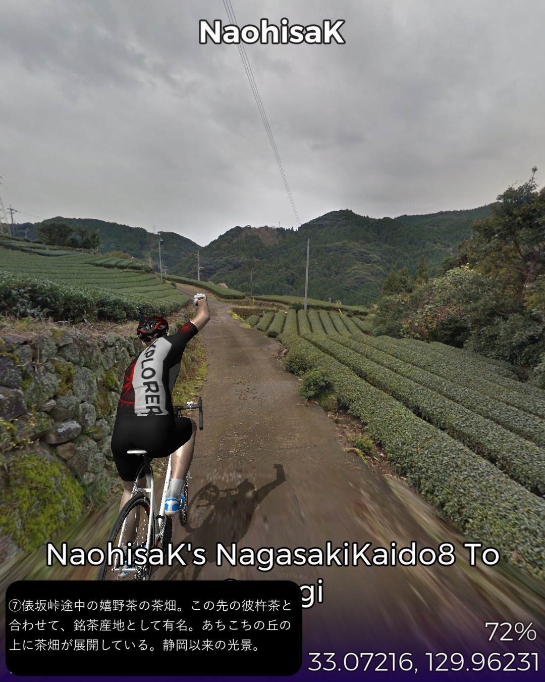 VRサイクリング、長崎街道8日目。武雄温泉に位置する塚崎宿から嬉野温泉の嬉野宿を経由して久々の海辺の宿場彼杵(そのぎ)宿まで27kmの行程。本日のルートのキーワードは温泉、茶畑、峠越え、山里。武雄温泉と嬉野温泉という名湯の地を巡るというのが今回の最大のポイントだな。特に嬉野温泉は日本三大美肌の湯とされている。VRでは通るだけで温泉には入れないのが残念・・。嗚呼、リアルに温泉入りてぇー!(リアルな私の心の叫び)さて福岡に住んでいた子供の頃、毎年親父の会社の旅行で家族同伴であちこちに連れて行ってもらっていた。今ならあり得ないような手厚い厚生サービスだがそれはそれとして、それで確か武雄温泉、嬉野温泉のいずれかあるいは両方訪れたはずである。記憶は薄いが昔の足跡を訪ねられたのには少し感慨を覚える。嬉野温泉に関しては最近数年に渡りふるさと納税で名物の温泉湯豆腐セットというのを頂いたがこれは癖になった。オススメである。ずっと広い筑紫平野を横断してきたので峠越えは久々だが、嬉野宿から彼杵宿の峠越えは、素朴な山里の集落、棚田、段々畑、茶畑の景観が素晴らしくいい。嬉野茶と彼杵茶は銘茶として有名で、今回のルート上も茶畑があちこちの丘に展開して特有の景観が楽しめた。さらに峠越えの後に海が望めて最終的に海岸の鄙びた街にたどり着くというのもいい。きっとリアルにきつい峠越えをした後の海の眺めはより格別だろうと想像する。そして長崎県に入った。いよいよ当面の最終目的地長崎が近づいてきたな。