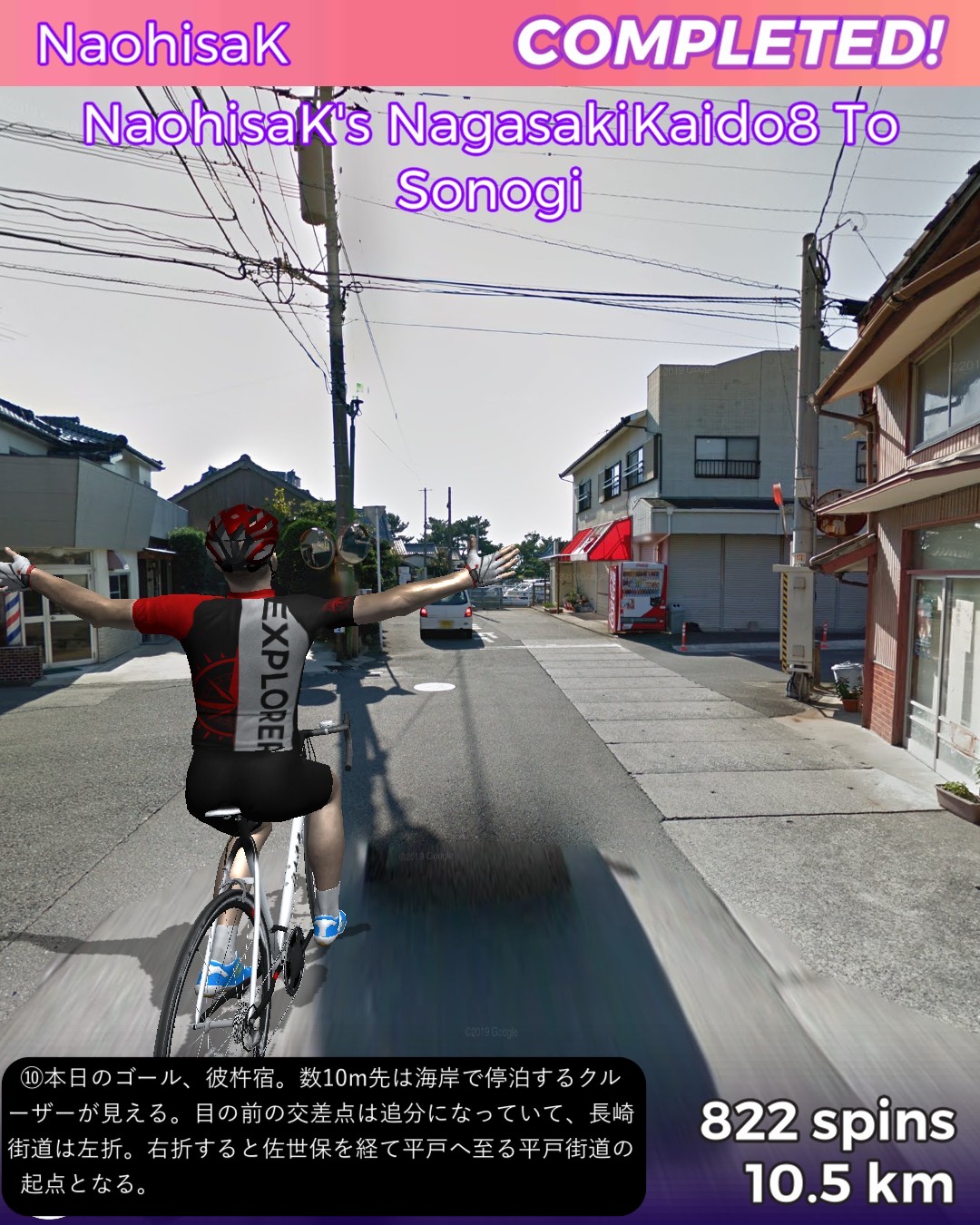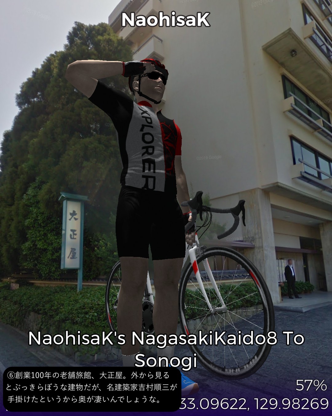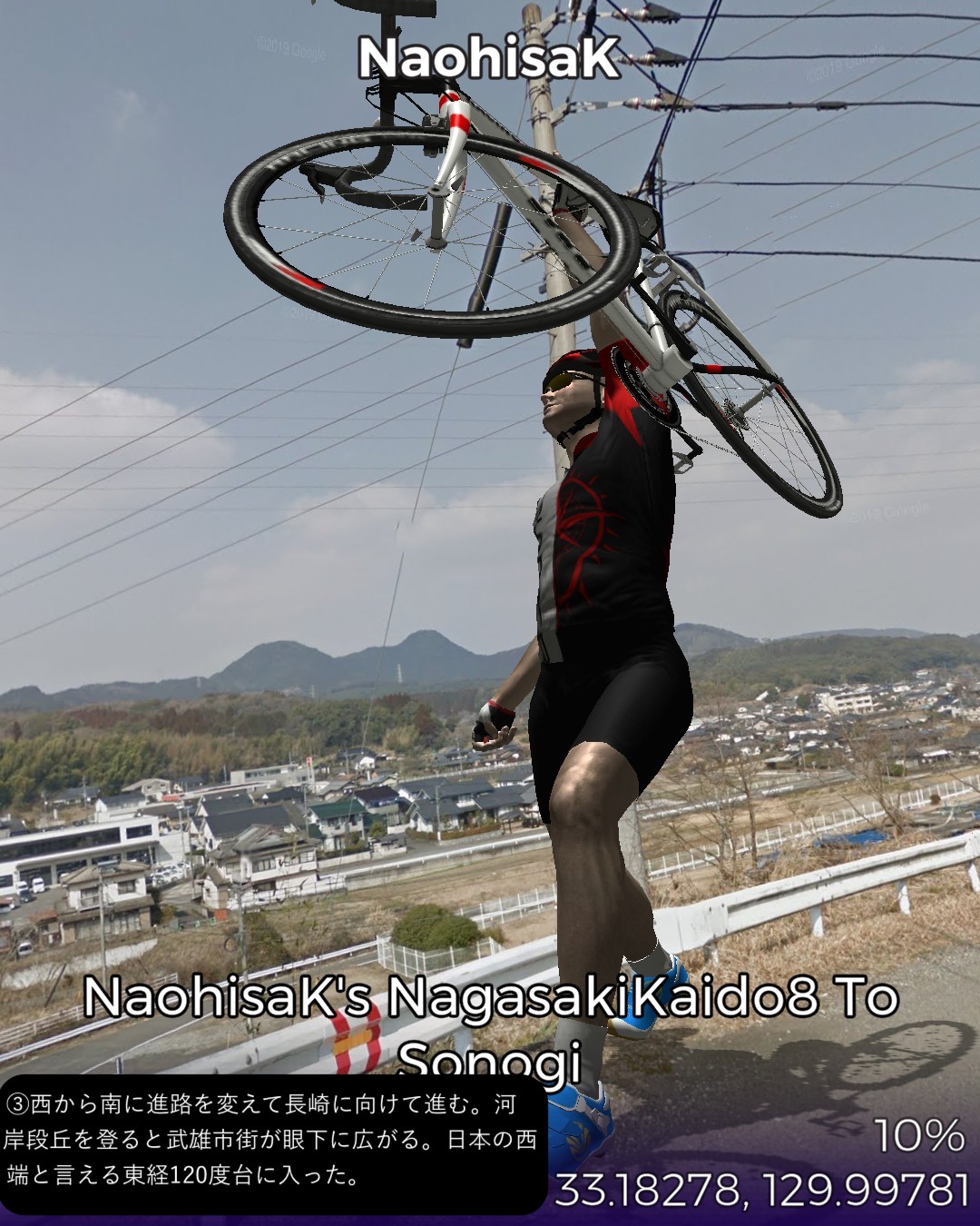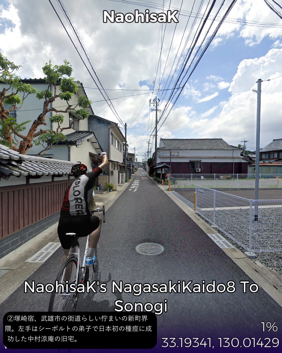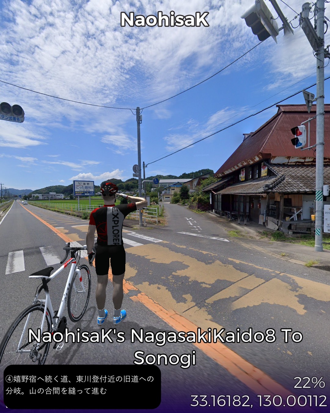 VRサイクリング、長崎街道8日目。武雄温泉に位置する塚崎宿から嬉野温泉の嬉野宿を経由して久々の海辺の宿場彼杵(そのぎ)宿まで27kmの行程。本日のルートのキーワードは温泉、茶畑、峠越え、山里。武雄温泉と嬉野温泉という名湯の地を巡るというのが今回の最大のポイントだな。特に嬉野温泉は日本三大美肌の湯とされている。VRでは通るだけで温泉には入れないのが残念・・。嗚呼、リアルに温泉入りてぇー!(リアルな私の心の叫び)さて福岡に住んでいた子供の頃、毎年親父の会社の旅行で家族同伴であちこちに連れて行ってもらっていた。今ならあり得ないような手厚い厚生サービスだがそれはそれとして、それで確か武雄温泉、嬉野温泉のいずれかあるいは両方訪れたはずである。記憶は薄いが昔の足跡を訪ねられたのには少し感慨を覚える。嬉野温泉に関しては最近数年に渡りふるさと納税で名物の温泉湯豆腐セットというのを頂いたがこれは癖になった。オススメである。ずっと広い筑紫平野を横断してきたので峠越えは久々だが、嬉野宿から彼杵宿の峠越えは、素朴な山里の集落、棚田、段々畑、茶畑の景観が素晴らしくいい。嬉野茶と彼杵茶は銘茶として有名で、今回のルート上も茶畑があちこちの丘に展開して特有の景観が楽しめた。さらに峠越えの後に海が望めて最終的に海岸の鄙びた街にたどり着くというのもいい。きっとリアルにきつい峠越えをした後の海の眺めはより格別だろうと想像する。そして長崎県に入った。いよいよ当面の最終目的地長崎が近づいてきたな。