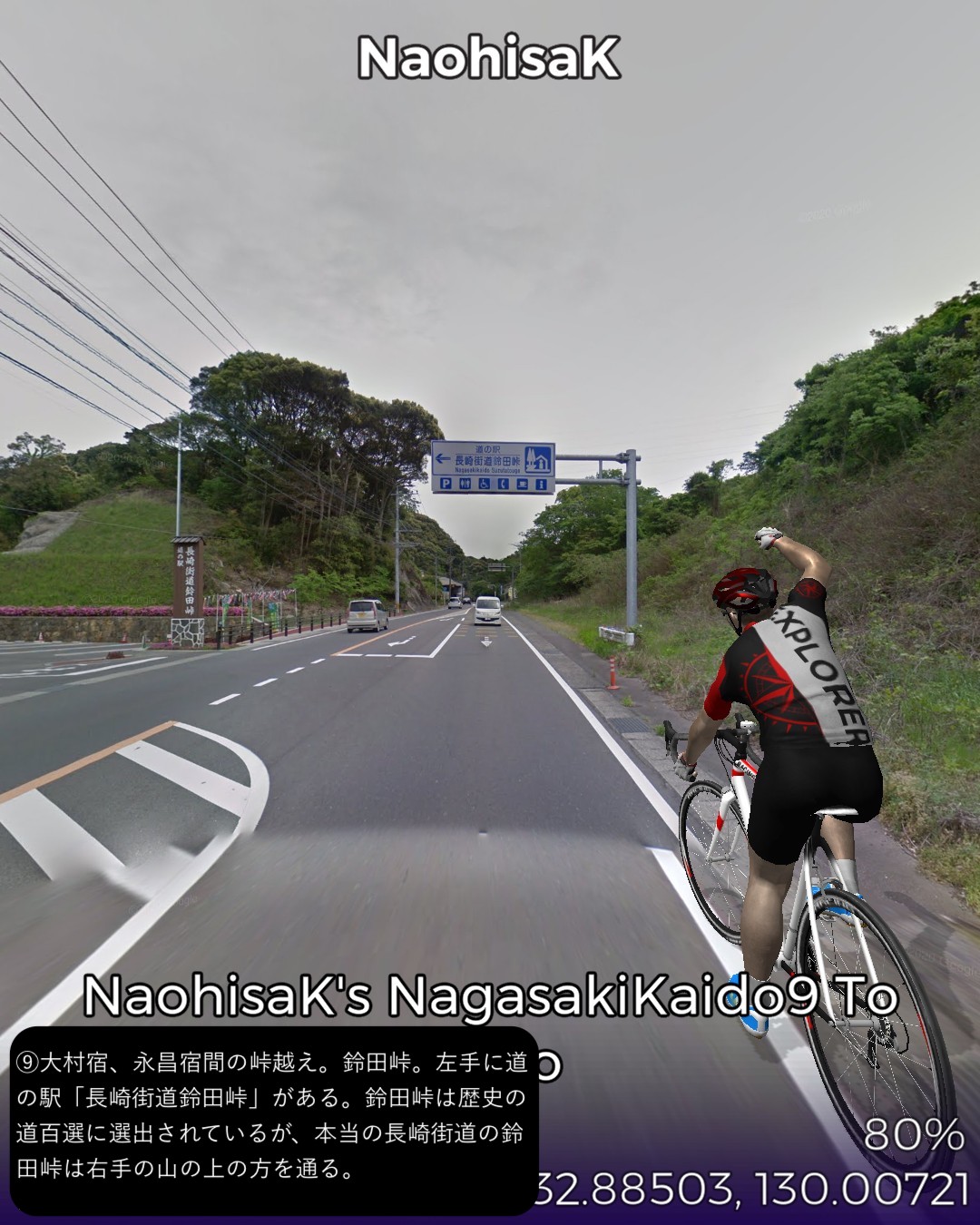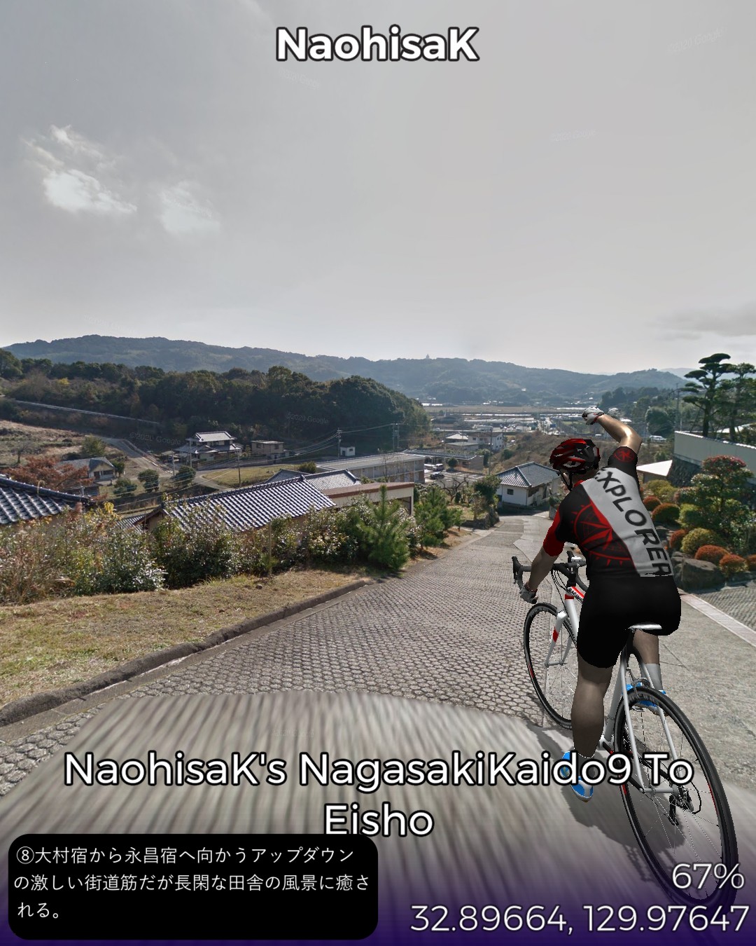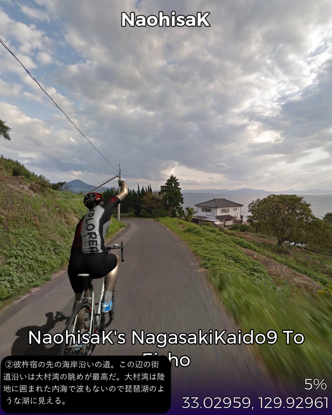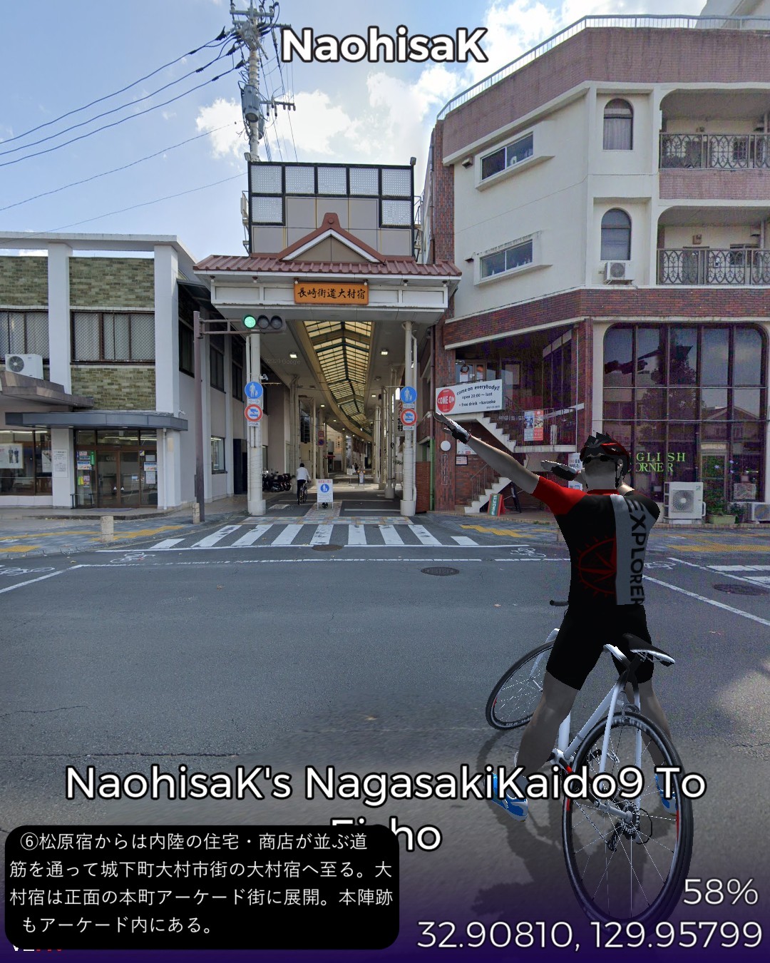 VRサイクリング、長崎街道9日目。本日のルートは大村湾の海岸伝いに彼杵宿から松原宿、大村宿を経て、長崎県の交通の要所諫早市に位置する永昌宿まで南下する31kmの長距離コース。彼杵宿から松原宿までは内海で鏡のように波のない大村湾を望みながら海岸ベリを走る爽快なコース。大村湾を取り巻く山が切れ目なく続くのが見えてまるで琵琶湖あたりの大きな湖のようだ。松原宿は海辺の古い家並みが続く宿場らしい景観。ここを過ぎると街道筋は内陸に向い、大村市の住宅や商店、工場などが立ち並ぶ道筋に変わってゆく。大村宿は城下町大村市街の本町アーケード街の中に位置する。そう言えば、東海道では街道がアーケード街を通るのは四日市ぐらいだったが、西日本は街道筋がアーケード街を通る宿場が多い。(神戸、加古川、姫路、岡山、尾道、広島、徳山、門司、黒崎、直方、飯塚、佐賀、大村)何か理由があるのだろうか。大村宿から永昌宿まではまたアップダウンの激しい田舎道が延々と続くコース。歴史の道百選に選出された鈴田峠は毎度残念ながら車道ではなくストリートビューが付いていないので仕方なく国道を迂回する。永昌宿は山を抜けた四方開けた土地の諫早市街に位置するが、全く宿場の雰囲気のない道筋であった。さていよいよ次回は長崎街道の終点、長崎に到達予定。
