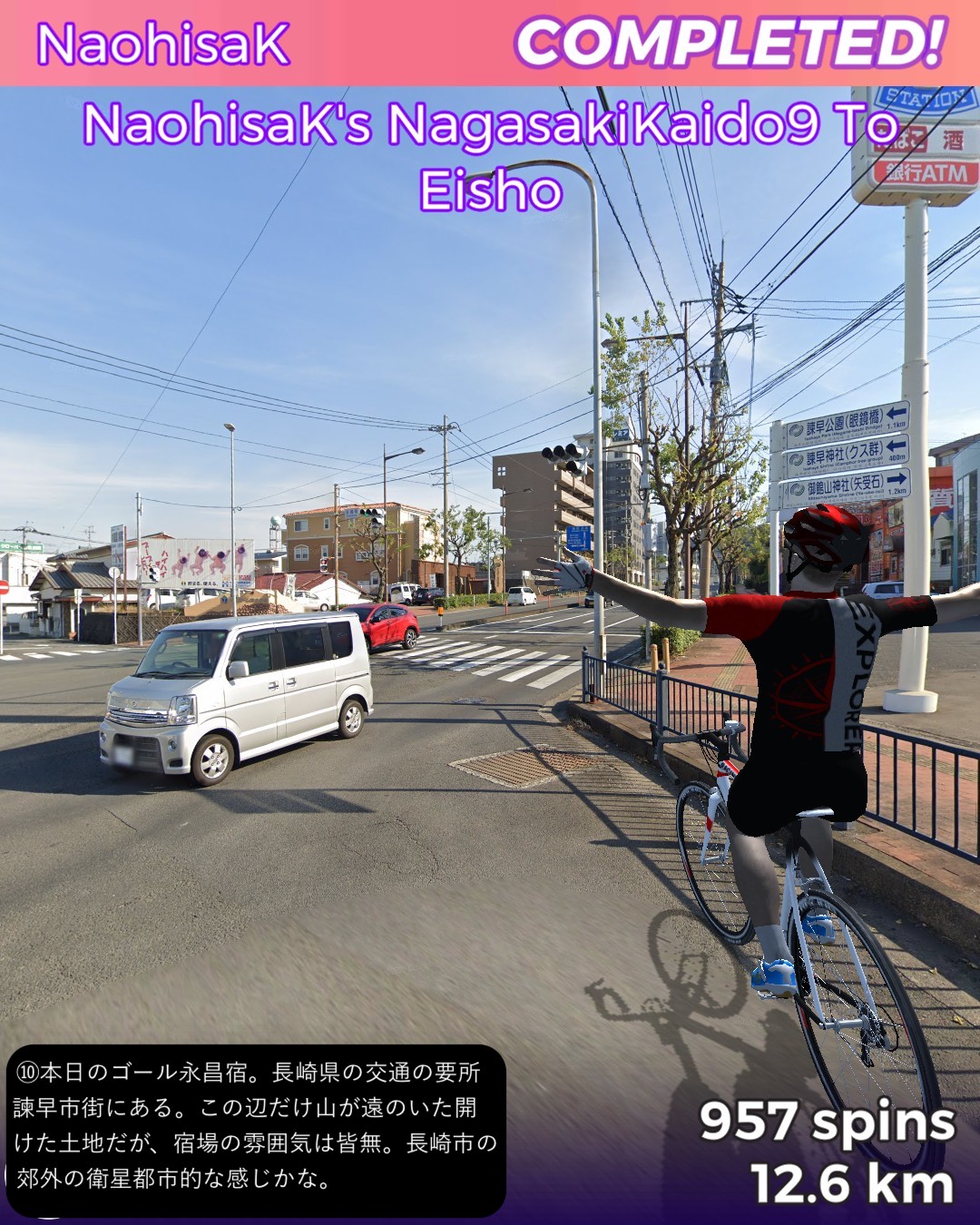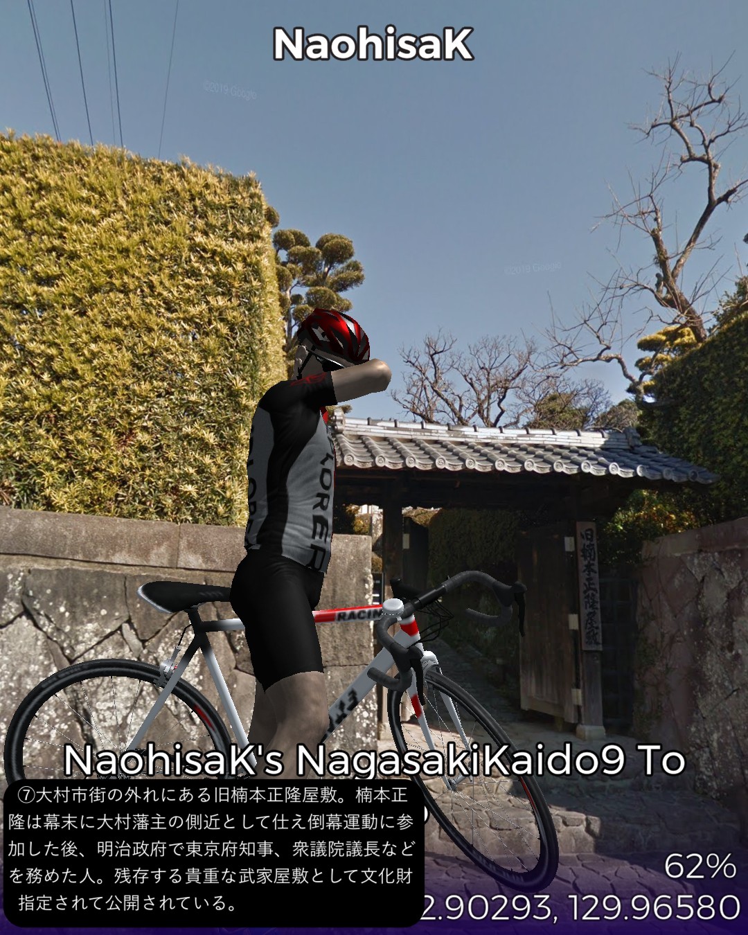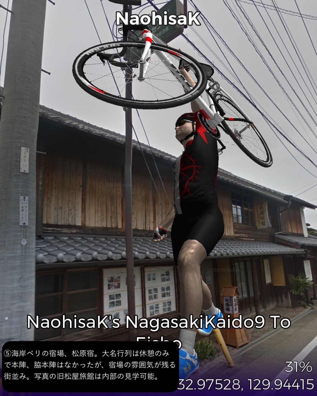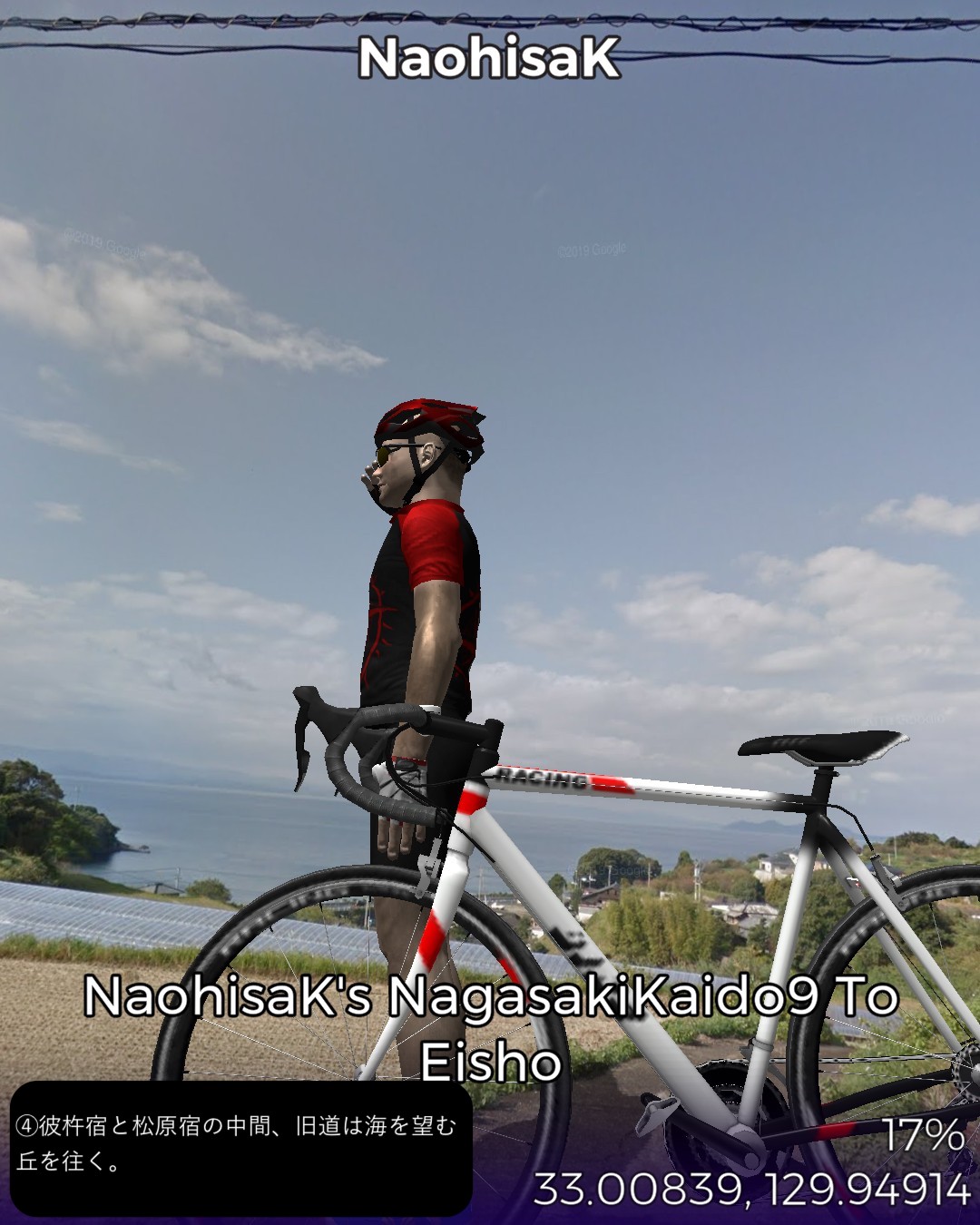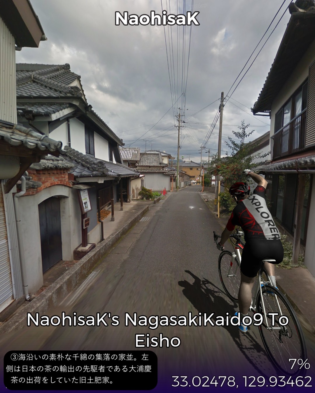VRサイクリング、長崎街道9日目。本日のルートは大村湾の海岸伝いに彼杵宿から松原宿、大村宿を経て、長崎県の交通の要所諫早市に位置する永昌宿まで南下する31kmの長距離コース。彼杵宿から松原宿までは内海で鏡のように波のない大村湾を望みながら海岸ベリを走る爽快なコース。大村湾を取り巻く山が切れ目なく続くのが見えてまるで琵琶湖あたりの大きな湖のようだ。松原宿は海辺の古い家並みが続く宿場らしい景観。ここを過ぎると街道筋は内陸に向い、大村市の住宅や商店、工場などが立ち並ぶ道筋に変わってゆく。大村宿は城下町大村市街の本町アーケード街の中に位置する。そう言えば、東海道では街道がアーケード街を通るのは四日市ぐらいだったが、西日本は街道筋がアーケード街を通る宿場が多い。(神戸、加古川、姫路、岡山、尾道、広島、徳山、門司、黒崎、直方、飯塚、佐賀、大村)何か理由があるのだろうか。大村宿から永昌宿まではまたアップダウンの激しい田舎道が延々と続くコース。歴史の道百選に選出された鈴田峠は毎度残念ながら車道ではなくストリートビューが付いていないので仕方なく国道を迂回する。永昌宿は山を抜けた四方開けた土地の諫早市街に位置するが、全く宿場の雰囲気のない道筋であった。さていよいよ次回は長崎街道の終点、長崎に到達予定。