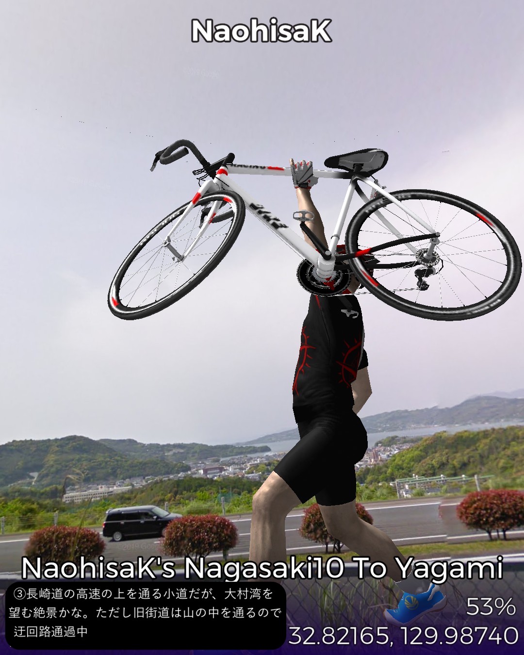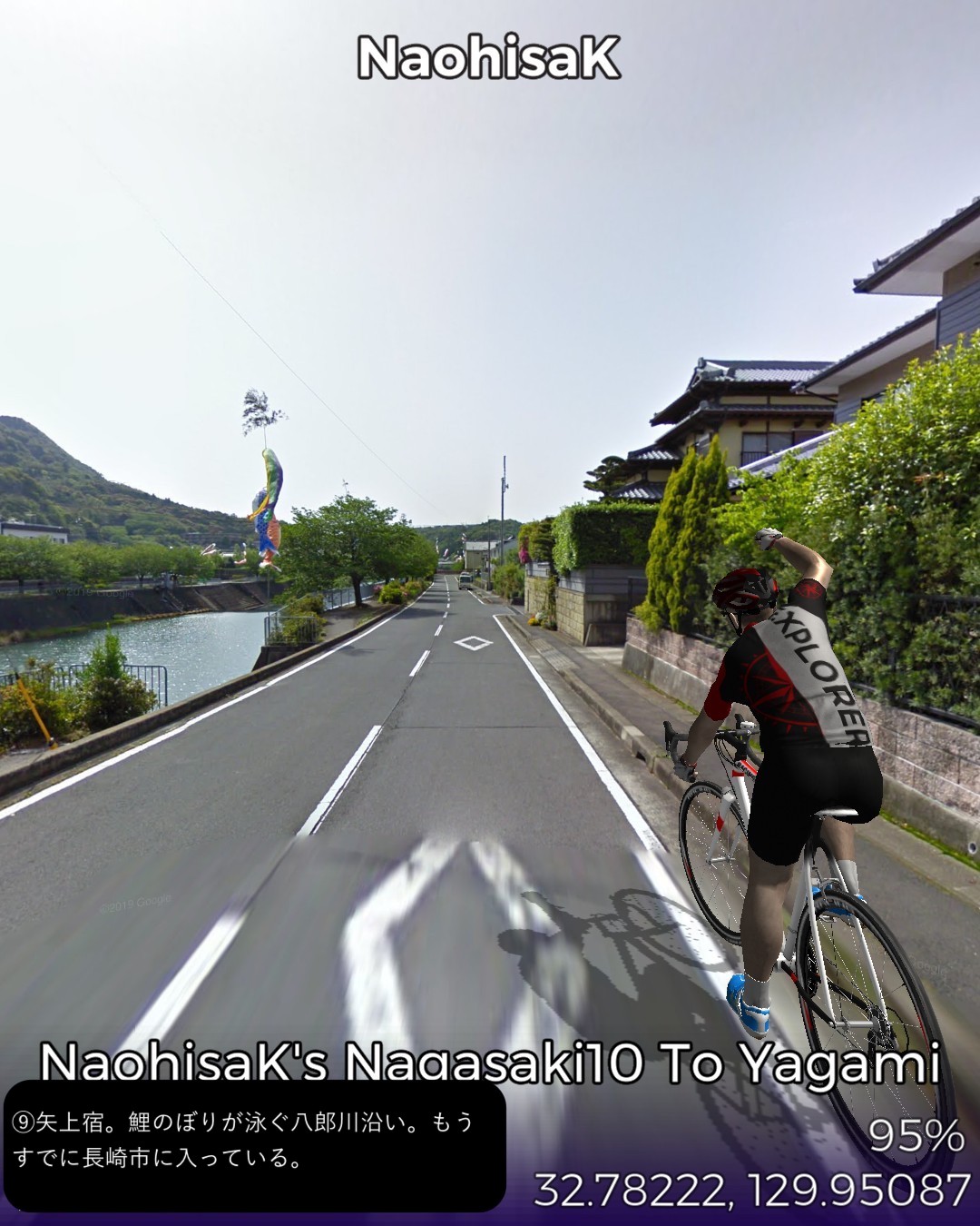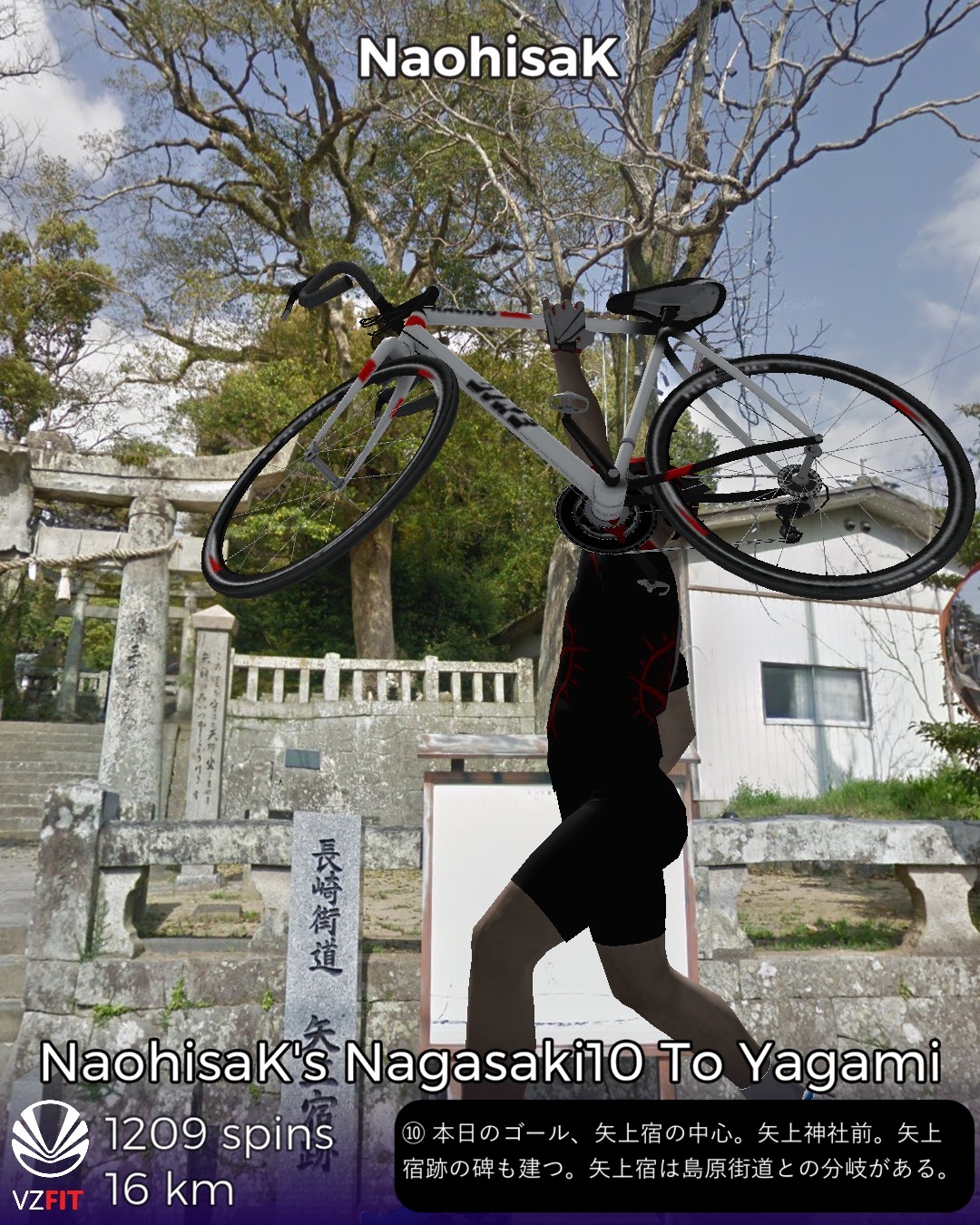 VRサイクリング、長崎街道10日目。諫早市街の永昌宿から一気に長崎へ行くつもりだったが諸都合のため一宿分矢上宿までの16km進めるに留めた。