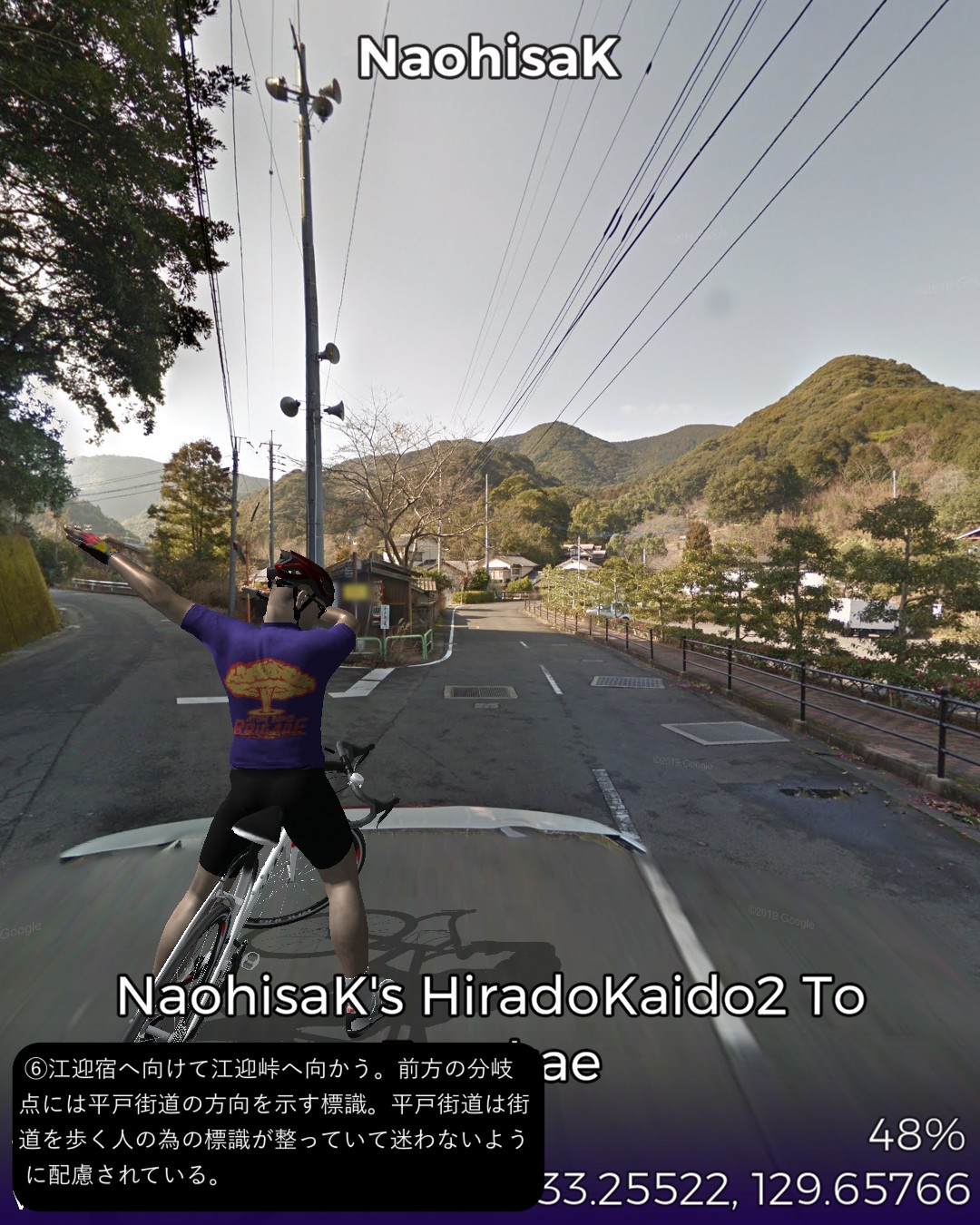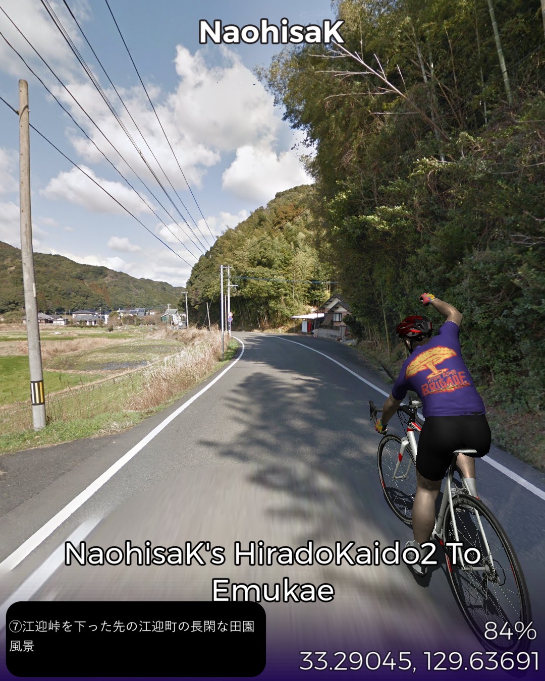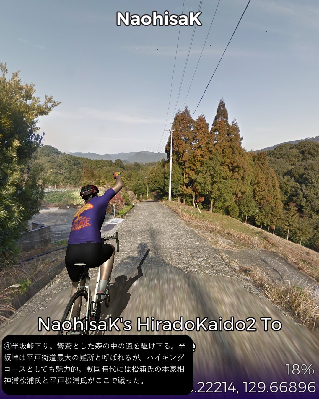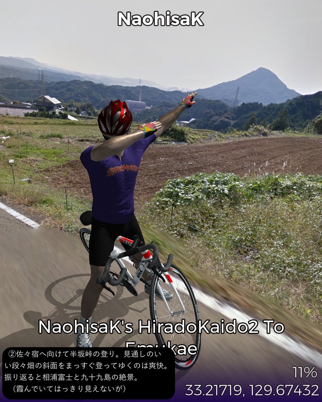 VRサイクリング、平戸街道2日目は中里宿をスタートしてひたすら田舎道。峠道。半坂峠を越えて佐々宿、さらに江迎峠を越えてゴール江迎宿まで18kmの行程。スタート、ゴールと中間の宿場にはそれぞれ松浦鉄道の駅があるが、鉄道は谷間をグネグネと迂回して通っているのに対して街道はほぼまっすぐ山の中を突っ切るコースとなる。VRサイクリングなので涼しい顔で走りきっているが、リアルのサイクリング、あるいは歩きなら結構きついコースに違いない。それでも特に前半の半坂峠は、見通しの良い緩やかな坂道をまっすぐに登り、振り返ると相浦富士の秀麗な稜線の向こうに霞んではいるが九十九島の島々を望む絶景が広がり爽快な山道である。この眺めはここまでのVRサイクリングでのベストかもしれない。いずれリアルに歩いてみたい道だ。ゴールの江迎宿は海辺の町なのにまるで山間の町のような雰囲気。それだけ海に山が迫った地形ということだろう。次回は早くも平戸に到着予定。