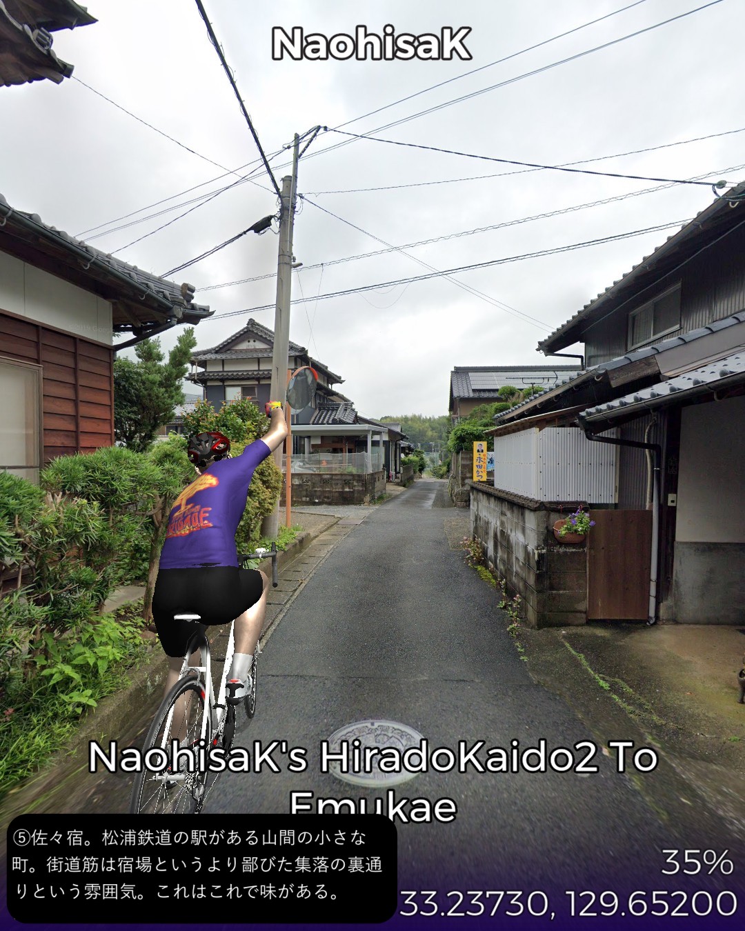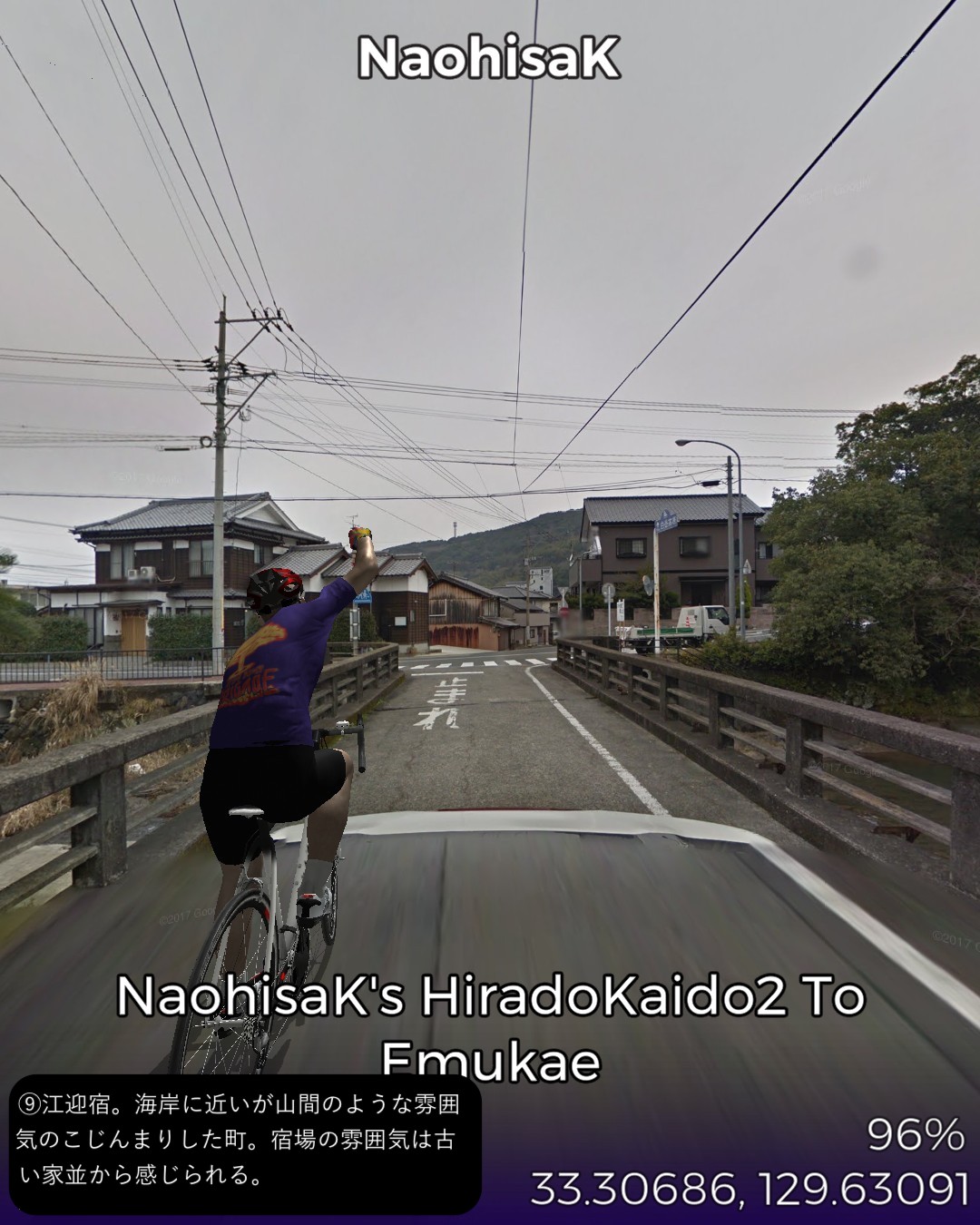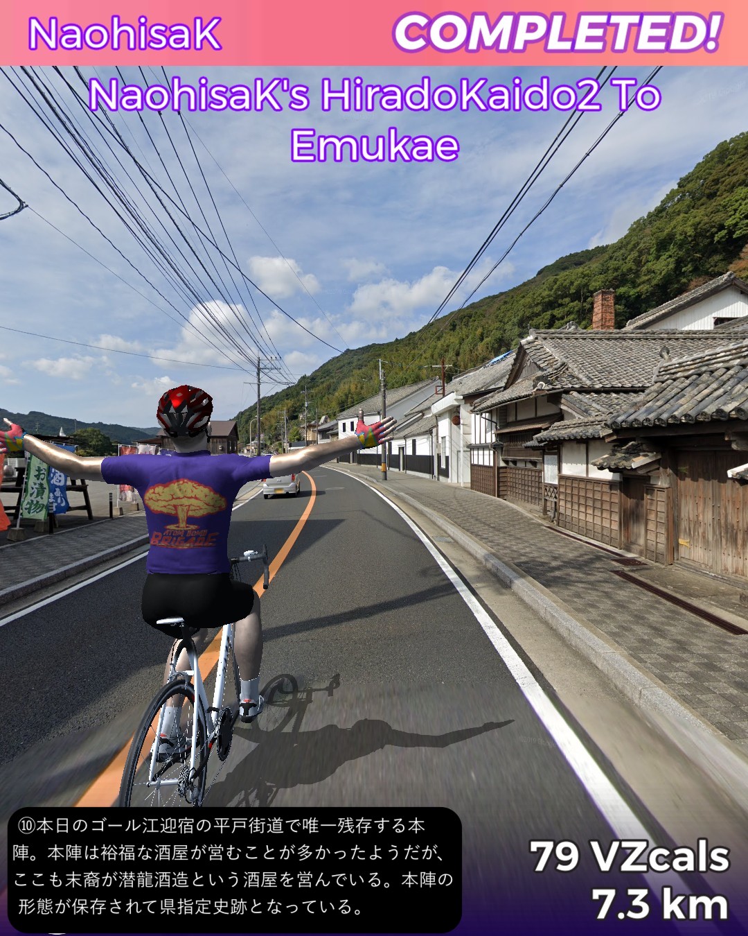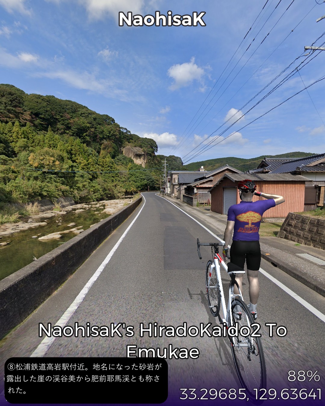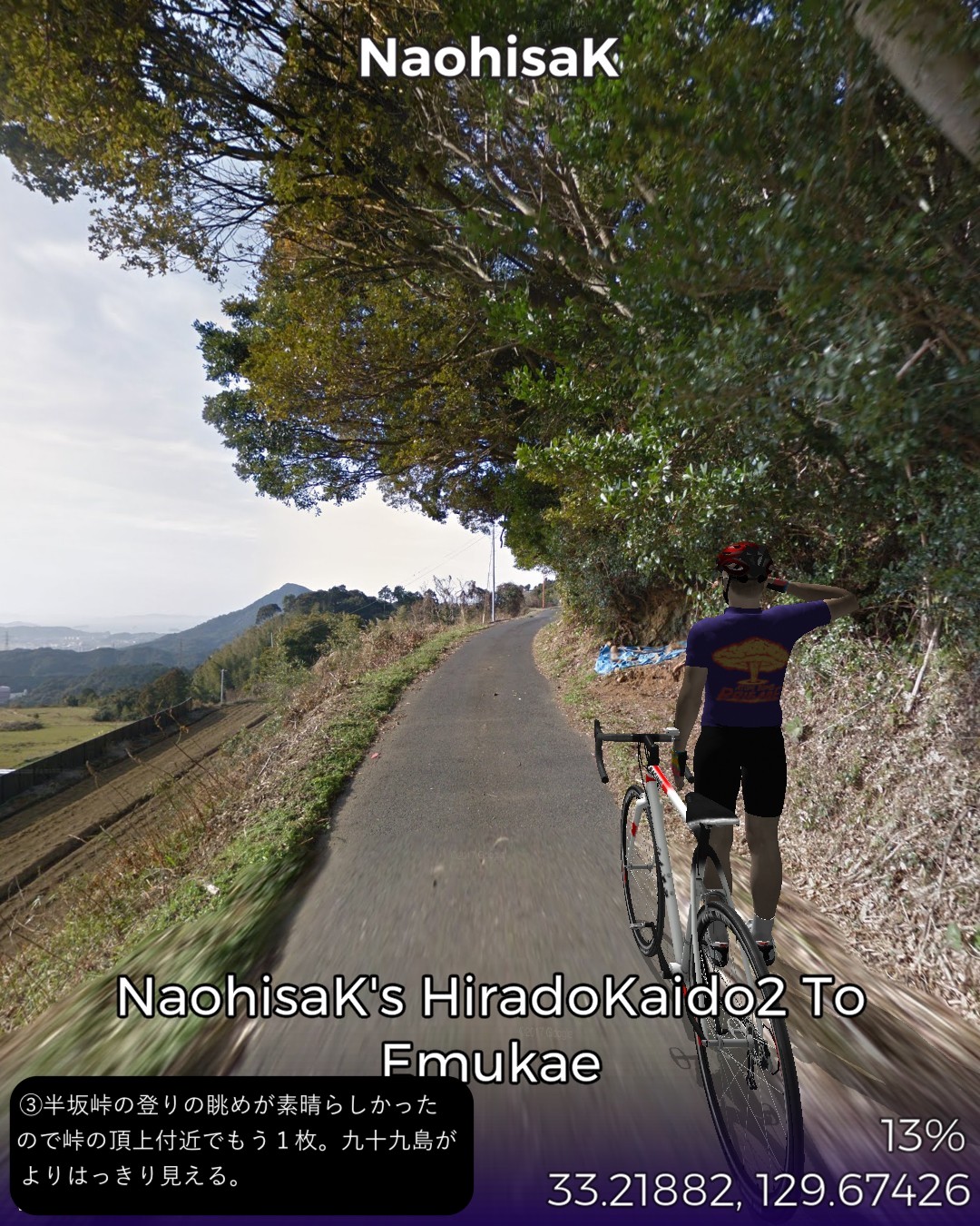 VRサイクリング、平戸街道2日目は中里宿をスタートしてひたすら田舎道。峠道。半坂峠を越えて佐々宿、さらに江迎峠を越えてゴール江迎宿まで18kmの行程。スタート、ゴールと中間の宿場にはそれぞれ松浦鉄道の駅があるが、鉄道は谷間をグネグネと迂回して通っているのに対して街道はほぼまっすぐ山の中を突っ切るコースとなる。VRサイクリングなので涼しい顔で走りきっているが、リアルのサイクリング、あるいは歩きなら結構きついコースに違いない。それでも特に前半の半坂峠は、見通しの良い緩やかな坂道をまっすぐに登り、振り返ると相浦富士の秀麗な稜線の向こうに霞んではいるが九十九島の島々を望む絶景が広がり爽快な山道である。この眺めはここまでのVRサイクリングでのベストかもしれない。いずれリアルに歩いてみたい道だ。ゴールの江迎宿は海辺の町なのにまるで山間の町のような雰囲気。それだけ海に山が迫った地形ということだろう。次回は早くも平戸に到着予定。