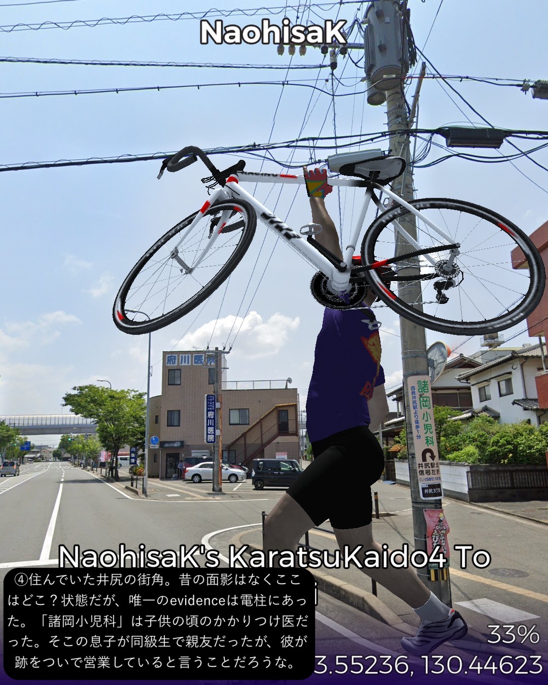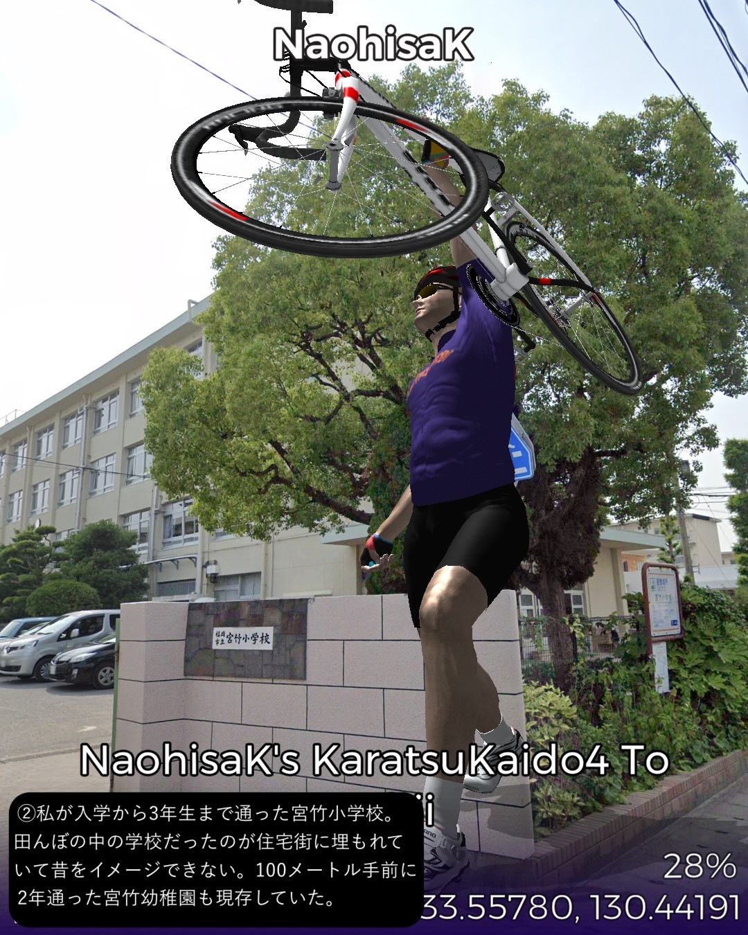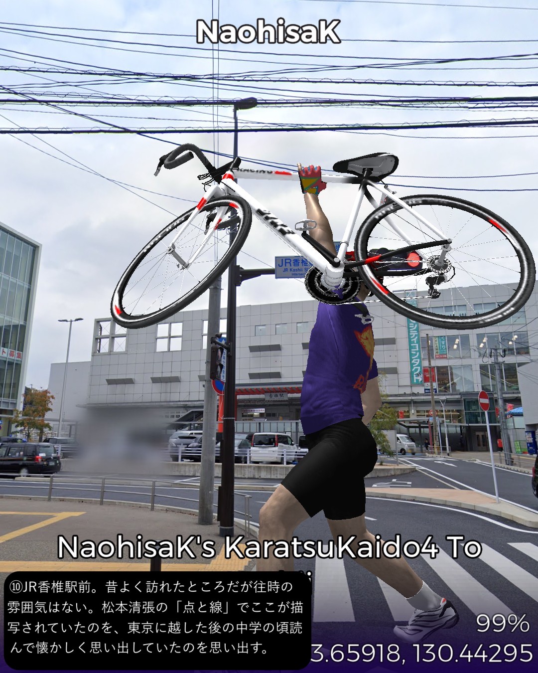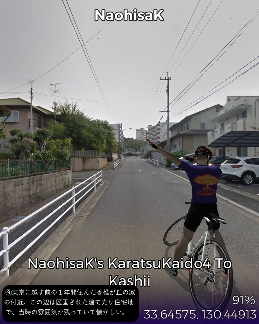 VRサイクリング、唐津街道4日目。本日は博多宿から唐津街道の先、香椎まで歩を進めつつ、番外編的に私の幼少時代の住んでいた付近を巡る、29kmのセンチメンタル巡礼ルート。まずは博多・福岡のコアな場所であり、子供の頃にもよく訪れた川端通り、櫛田神社、中洲、天神を一巡りした後、幼稚園から小学校3年まで過ごした南区に位置する西鉄大牟田線5つ目の駅井尻付近を訪れた。通った小学校と住処を巡ったが、55年前は田んぼだらけの土地柄が今や田畑が全く見当たらない住宅街に変貌し、住んでいたウサギ小屋系の2階建長屋がマンション群に変わっており、ここは何処?状態。そんな中で電信柱に記された、かかりつけ医だった小児科医院が、私が住んでいたという唯一のエビデンス。その病院は多分同級生だった息子が跡を継いでいるんだろう。それからまた市街に戻り、博多駅を経由しなぜかよく訪れた親父のオフィスのあった呉服町から唐津街道に戻って東へ進む。初詣に訪れたことのある、日本三大八幡宮の1つ筥崎宮のある箱崎宿を通り、多々良川を超えると、もう1カ所、東京へ越す前の1年間小学校3−4年を過ごした東区の懐かしい地区に入る。ここでも通った名島小学校と住処のあった香椎が丘を巡る。この辺は地形に特徴があり昔の面影を感じることができた。そしてゴールはその頃日常的によく訪れていた香椎駅前。この辺から望める三コブの山に見覚えがある。